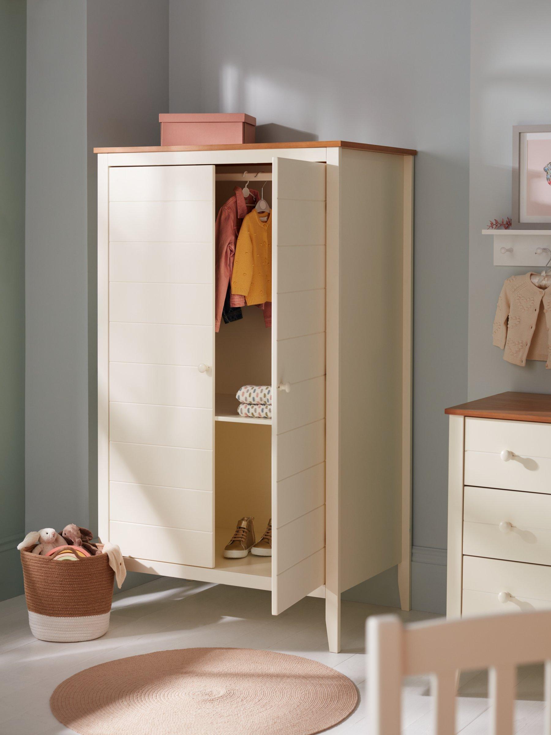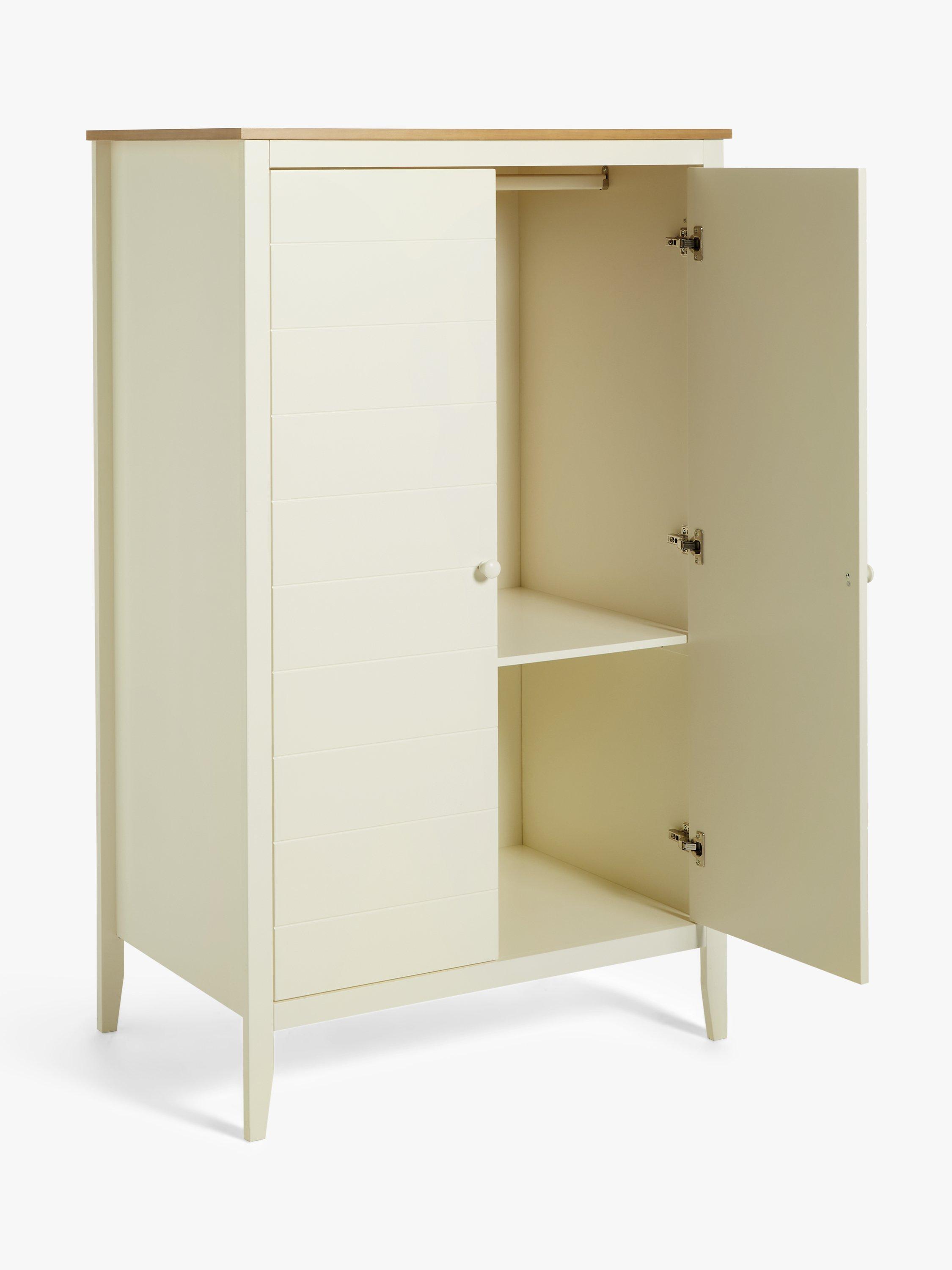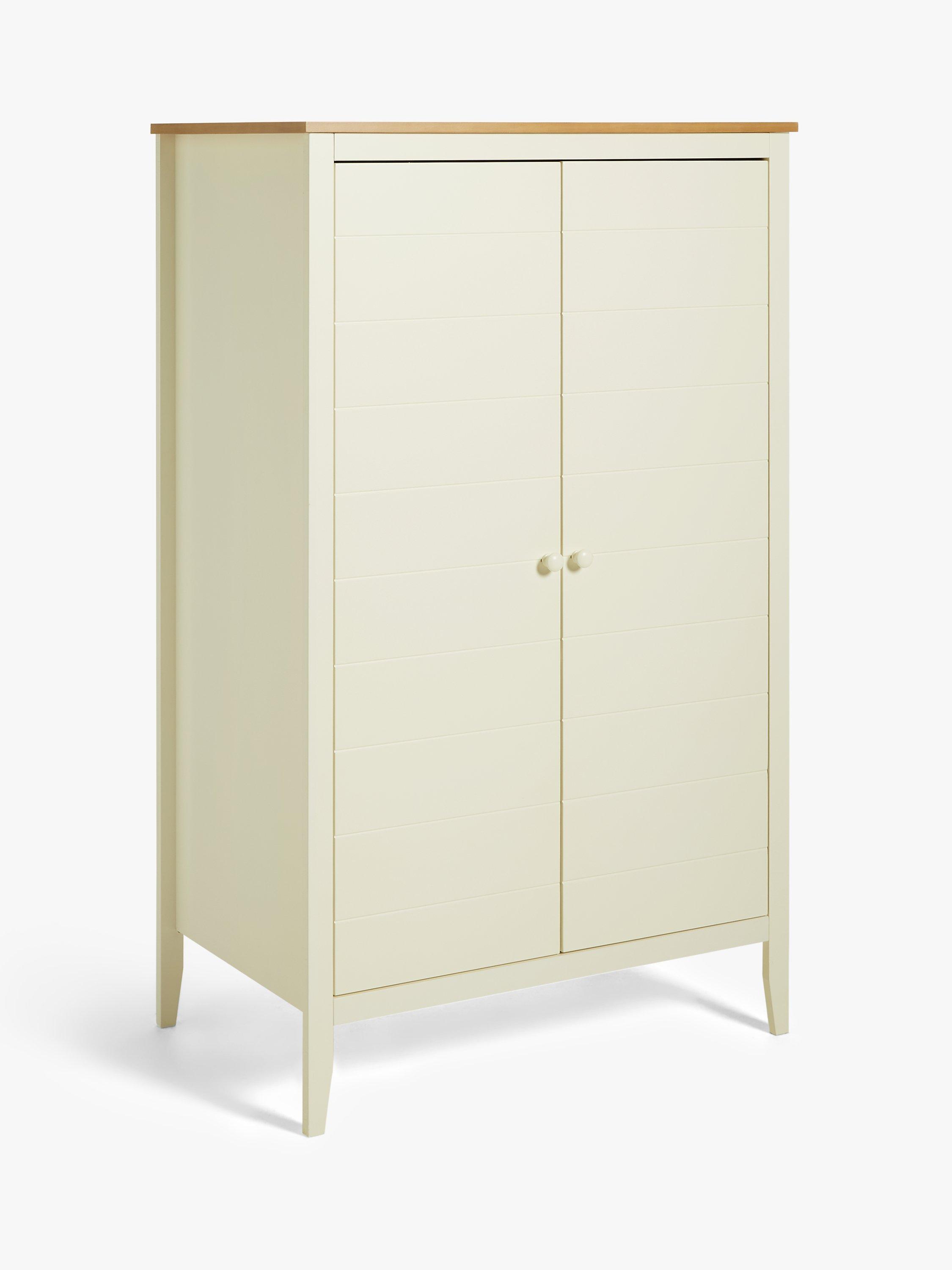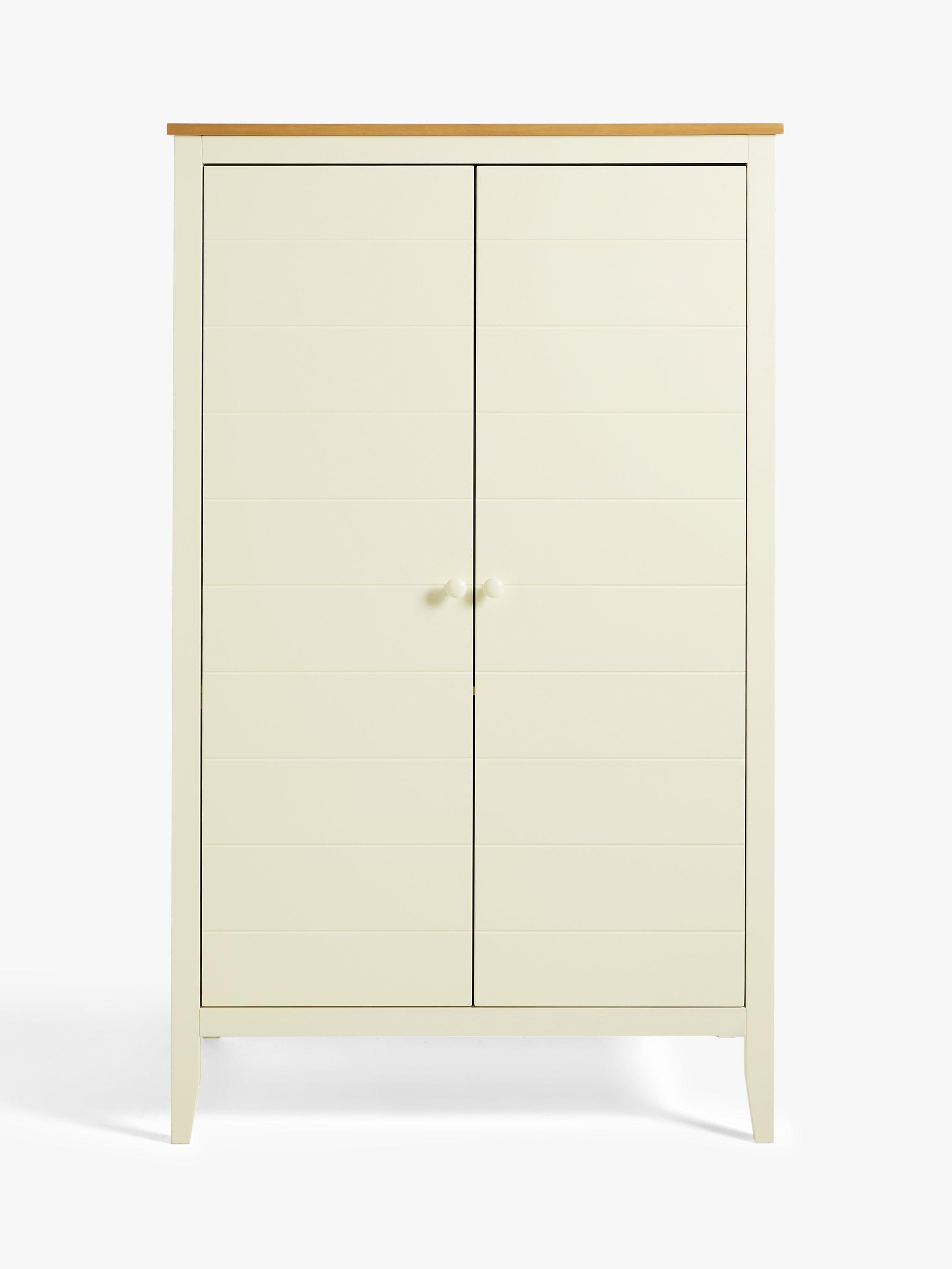 We've made this spacious double wardrobe from high-quality solid pine, MDF and veneers. There's a metal hanging rail inside and a dividing storage shelf in the middle. Plus, the sleek contemporary style combines painted and natural wood for a look that works with most decors.