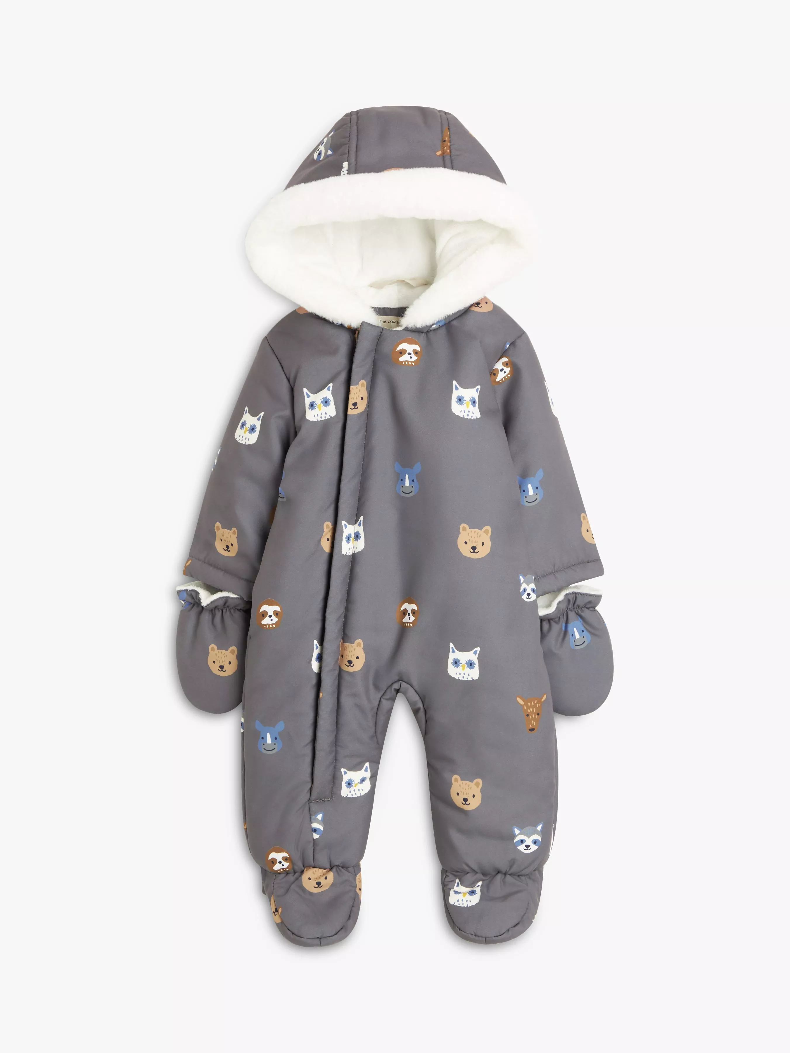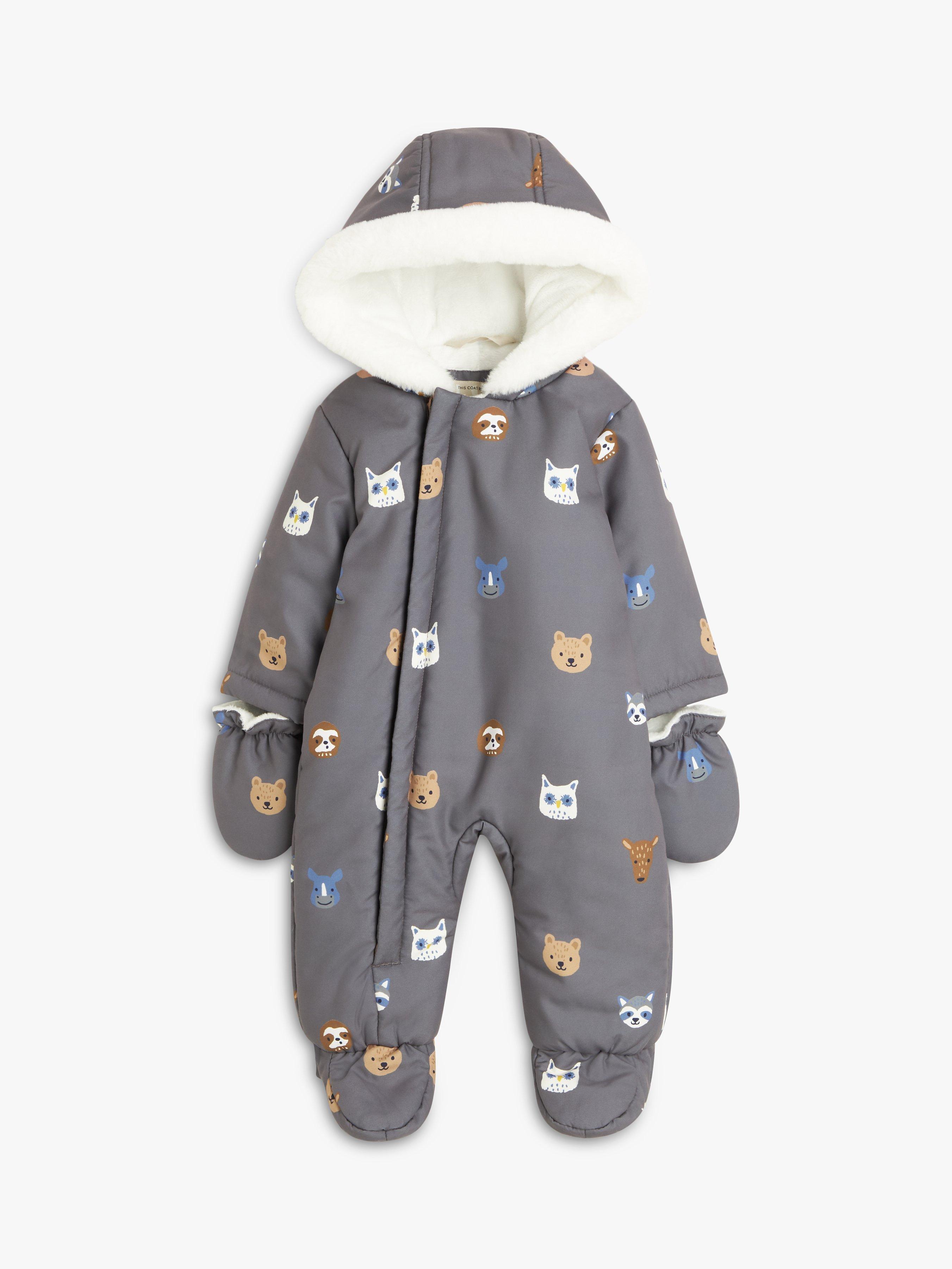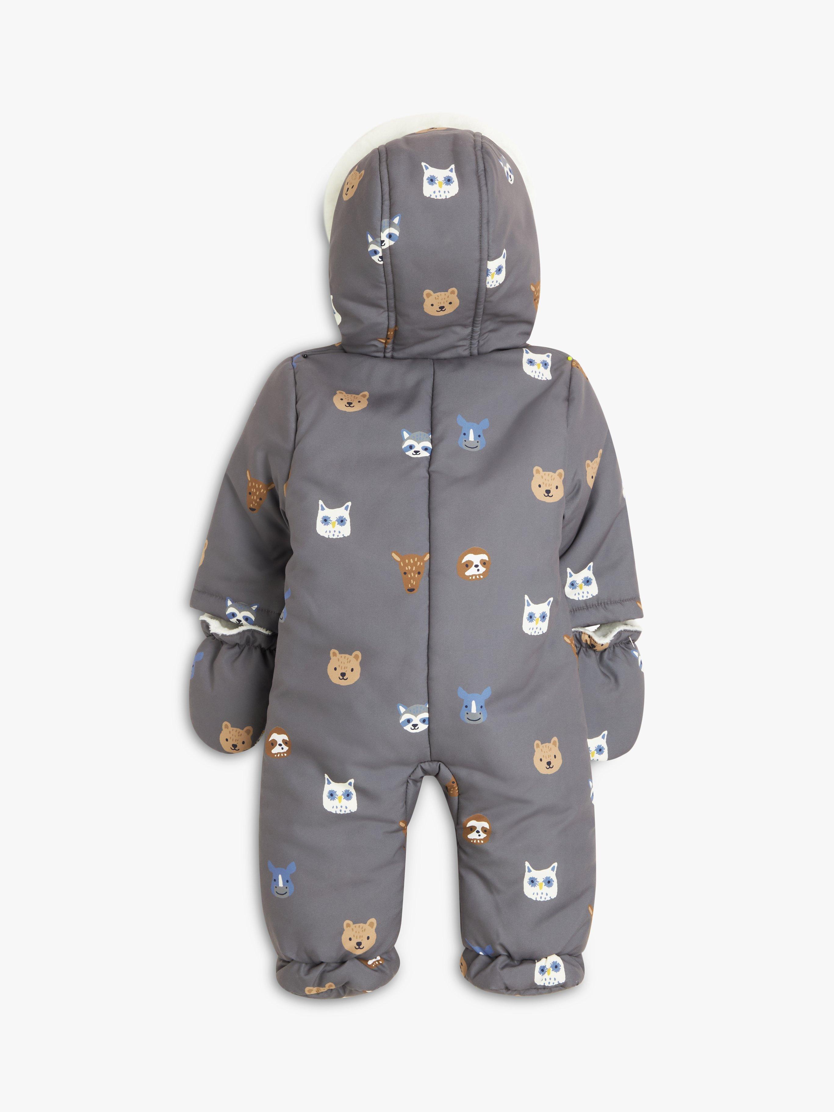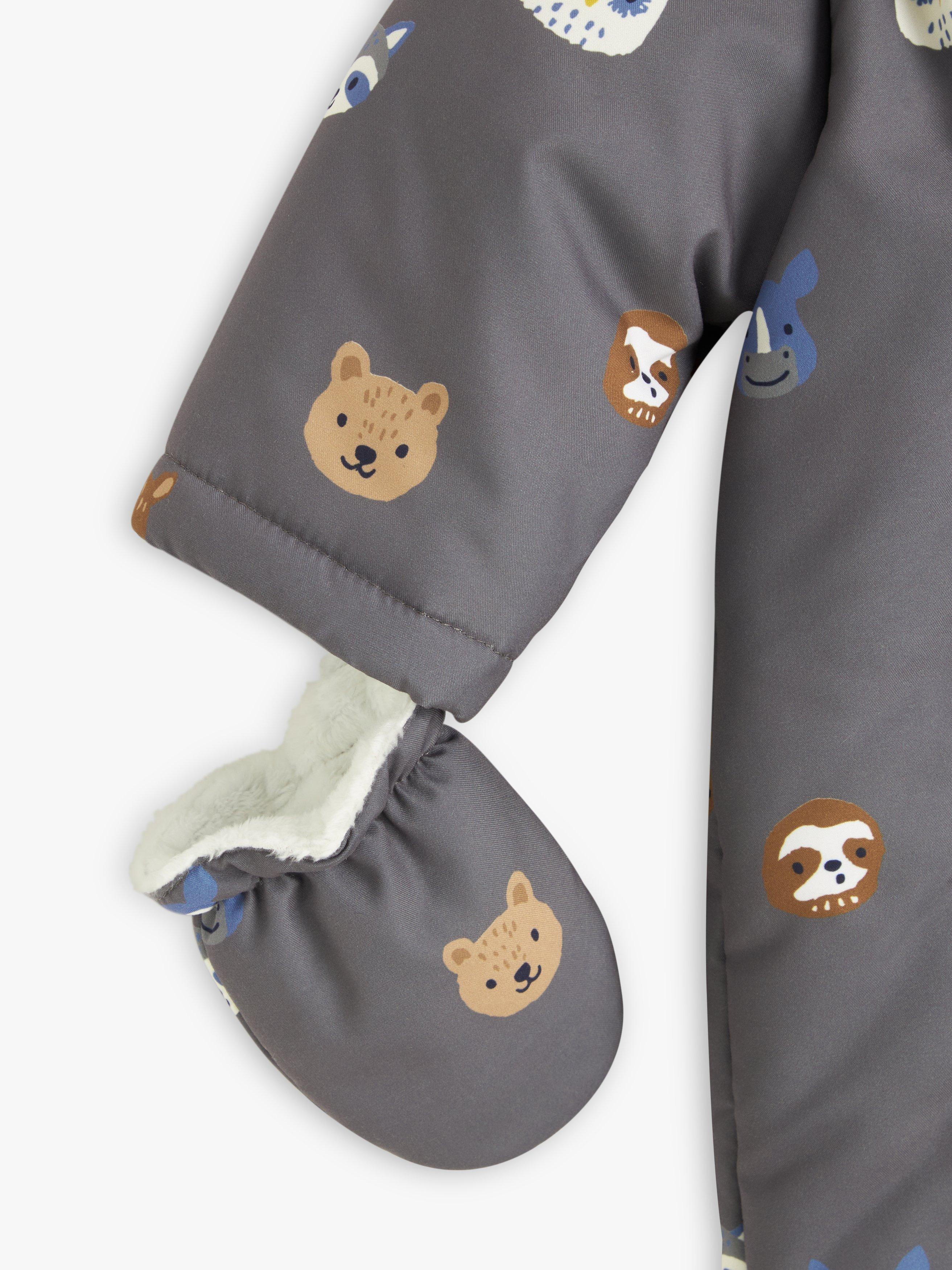 The soft brushed outer fabric is covered in a sweet animal print while the inside has a cosy teddy fleece lining for extra warmth and protection on those cold winter days. The zip-down front allows for easy dressing and the attached mittens keep little hands warm too. Not forgetting the all-important head, it comes with a hood with faux fur trim.