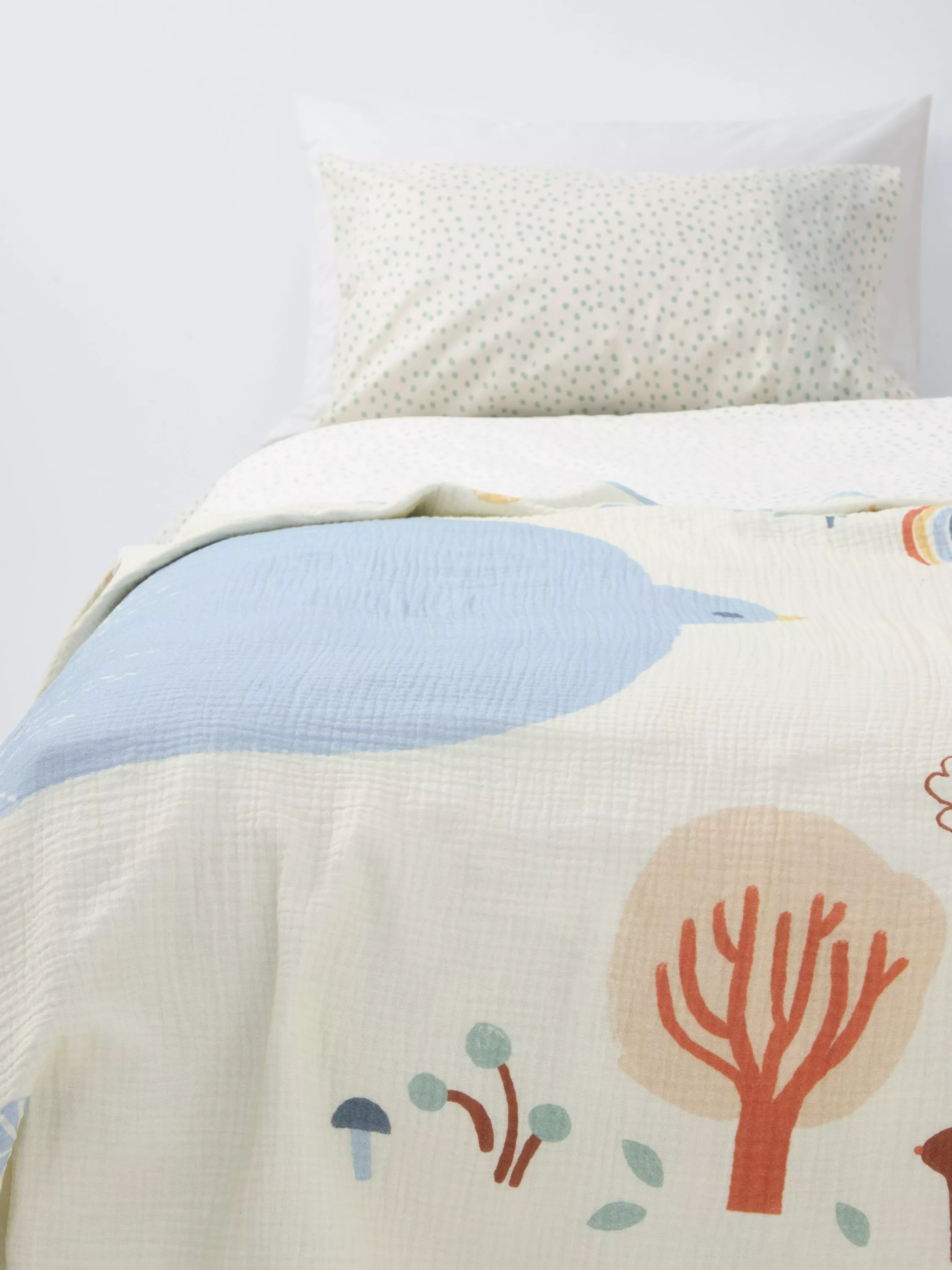 With 2 layers of 100% cotton breathable crinkle muslin for that comfy, comfortable and soft feeling, this blanket is perfect for newborns. The reversible design boasts rainbows on one side and a central bird on the other.