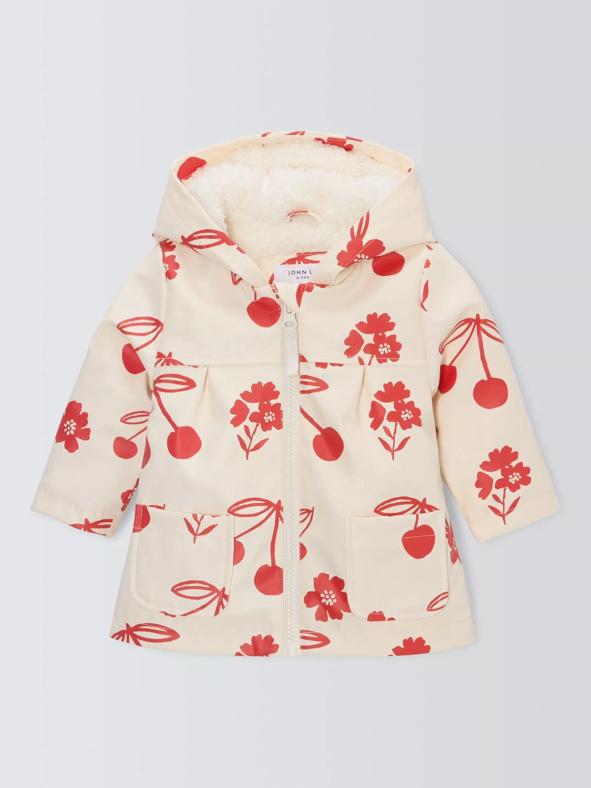 The rain won't stop their adventures if they're zipped into our cherry print rain mac. Lightly padded and with a jersey lining to the main body and hood, it'll keep them dry and warm on drizzly days.