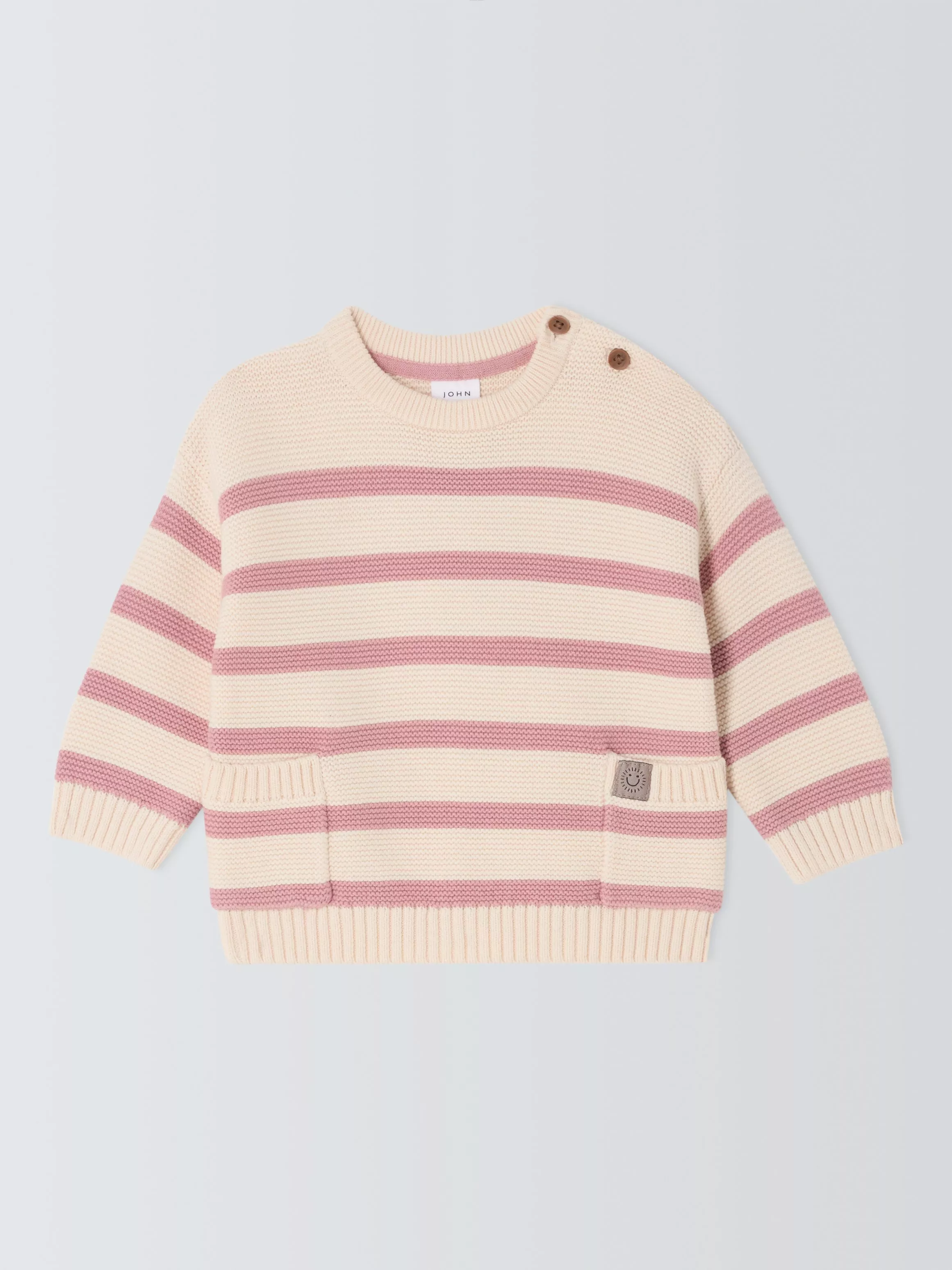 This cute and cosy breton jumper is the perfect layering option whatever the weather brings. With shoulder buttons and pockets for extra details.