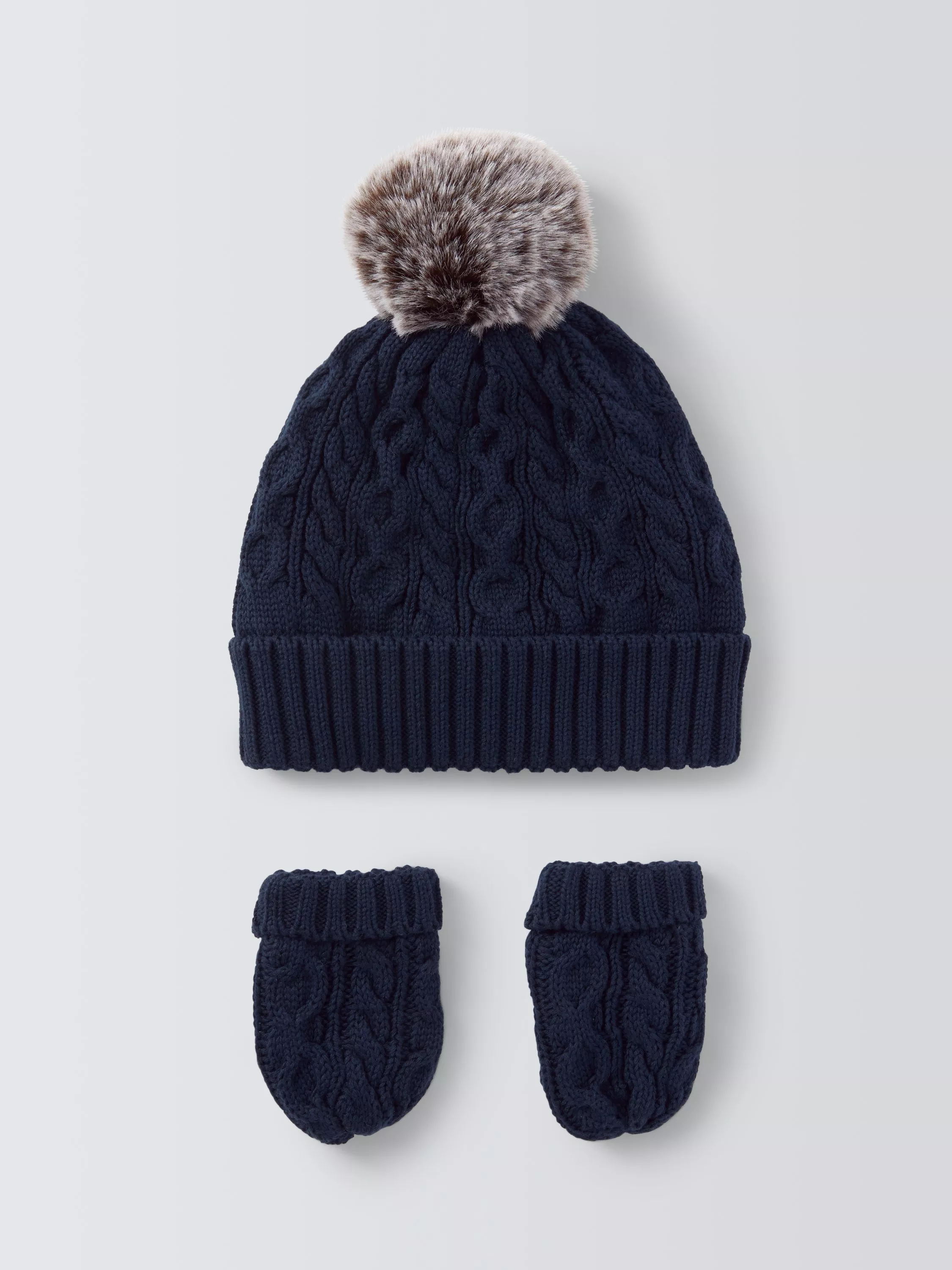 A cosy hat and mittens set with cable knit designs.