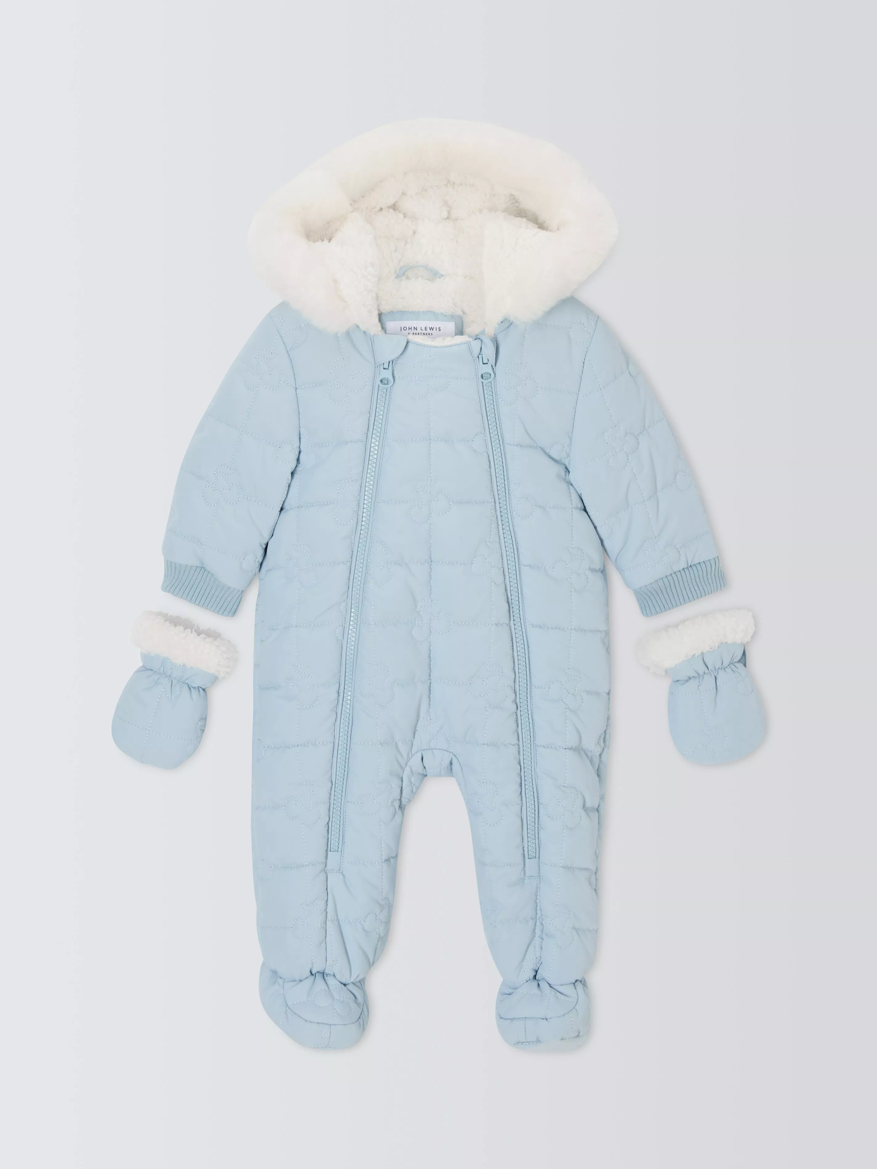 Keep them cosy in our quilted cherries snowsuit. Featuring a faux fur trim to the hood, detachable mittens, and a dual-zip for easy on and off. Sizes up to 6-9 months also have integrated feet, whilst sizes 9-12 months and beyond are footless for little walkers.