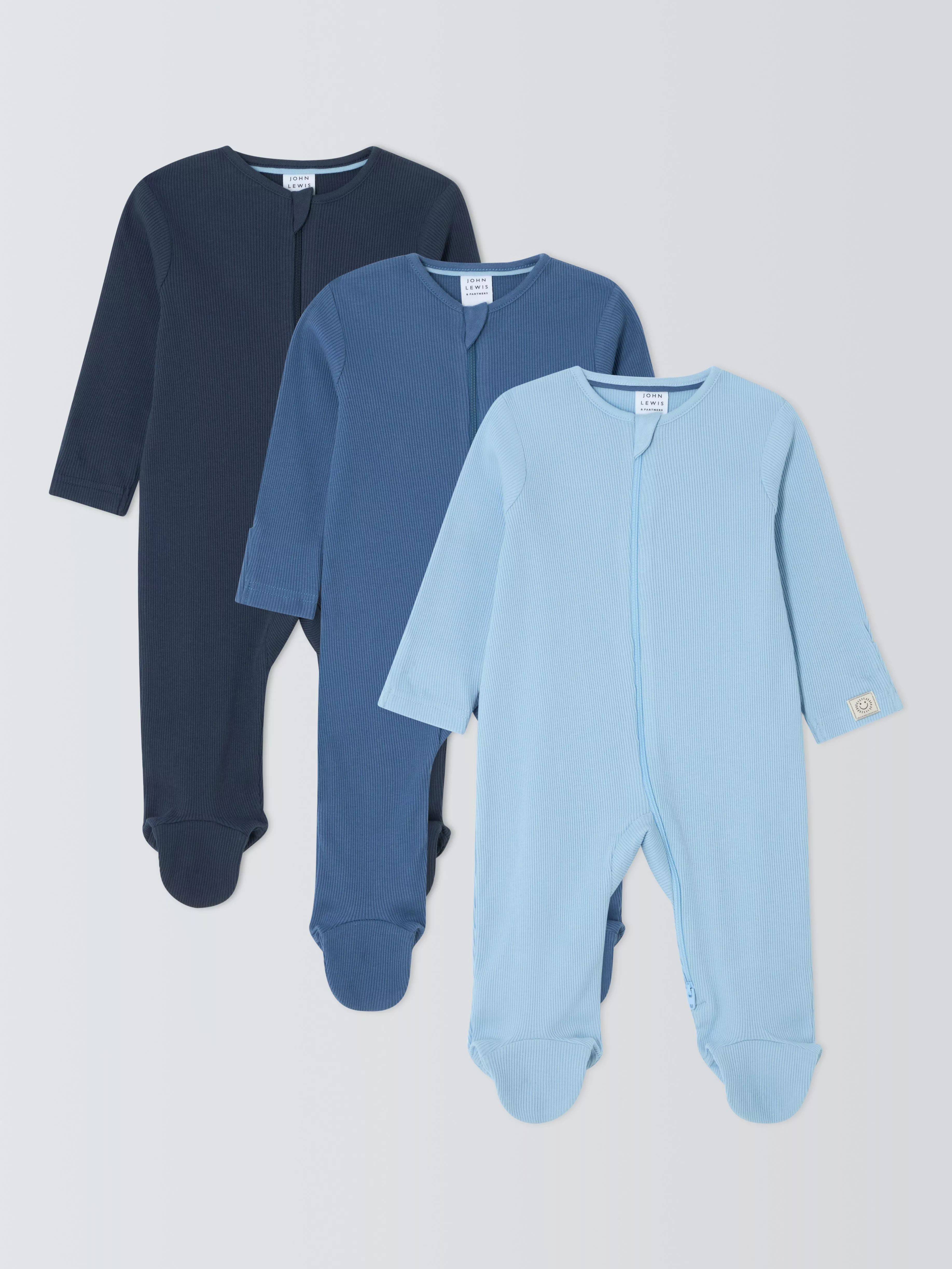 John LewisBaby Cotton Two Way Zip Ribbed Cotton Sleepsuit, Pack of 3, Blue