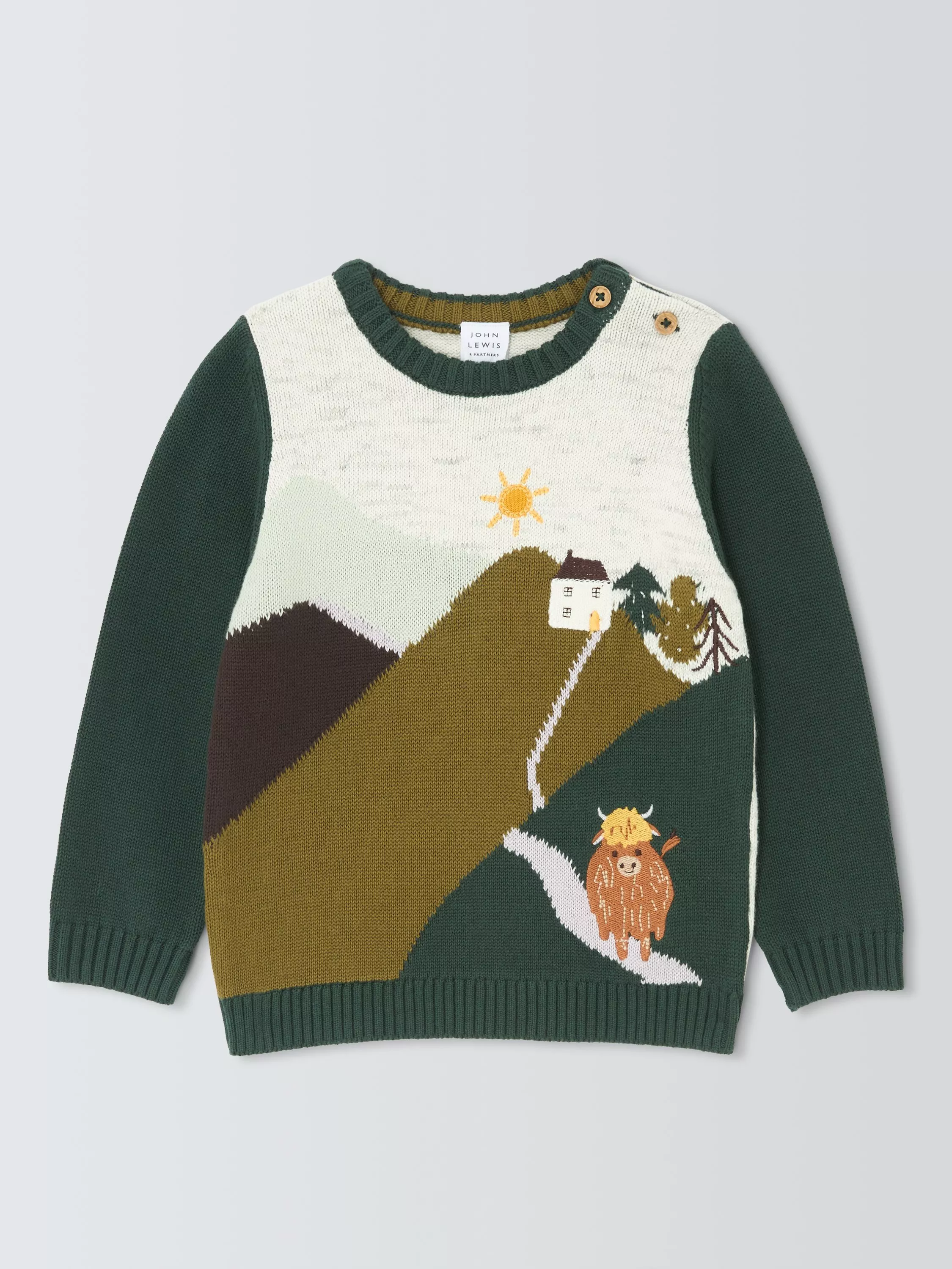 Knitted from pure cotton, this jumper features a sweet scene of the highlands, complete with a Highland cow. Mock buttons at the shoulder help with easy dressing.