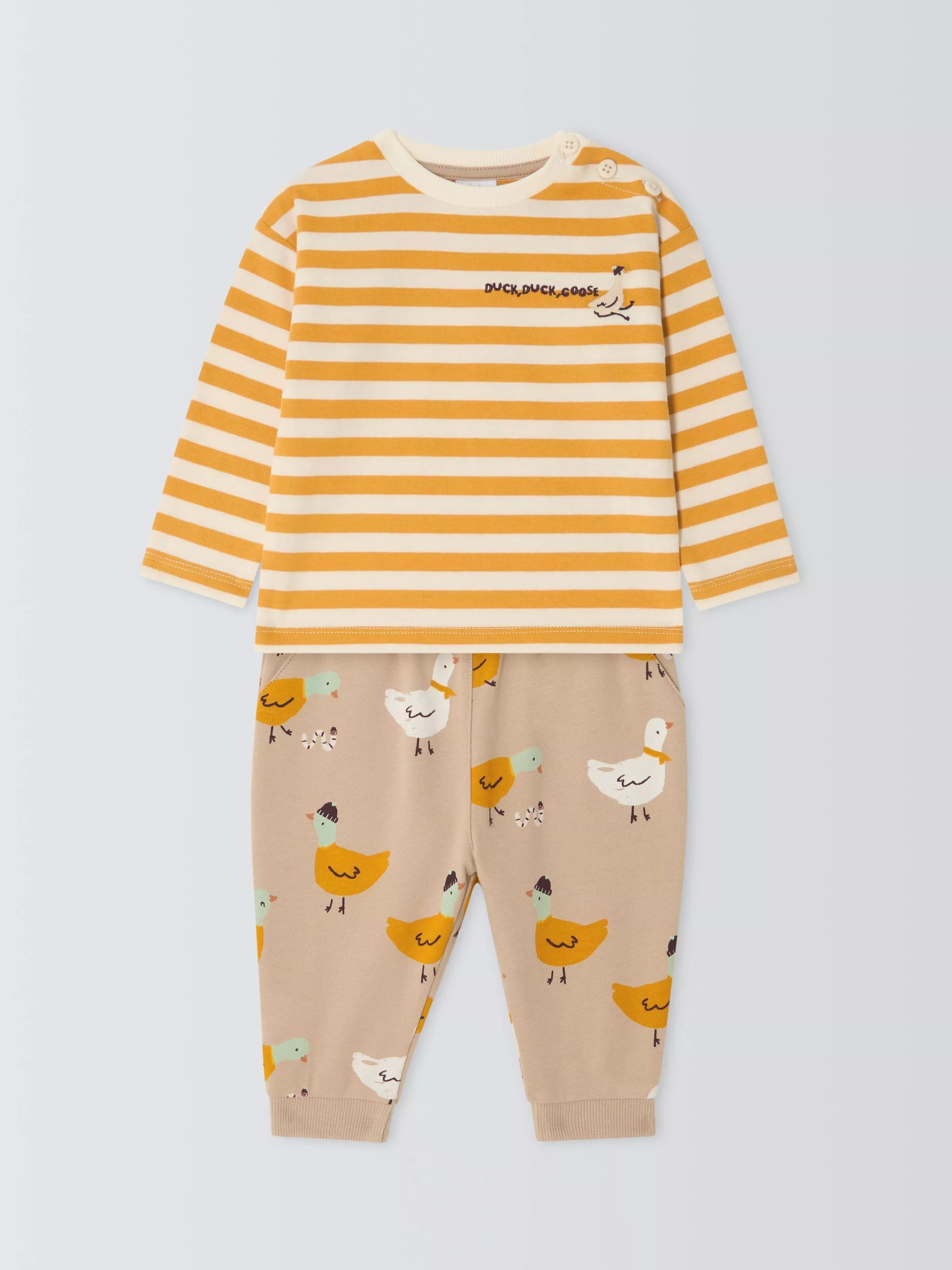 A long-sleeved top and joggers set. Both are made from pure cotton for softness and include design details for comfortable dressing - shoulder buttons on the top for easy on/off and an elasticated waistband for a snug fit.