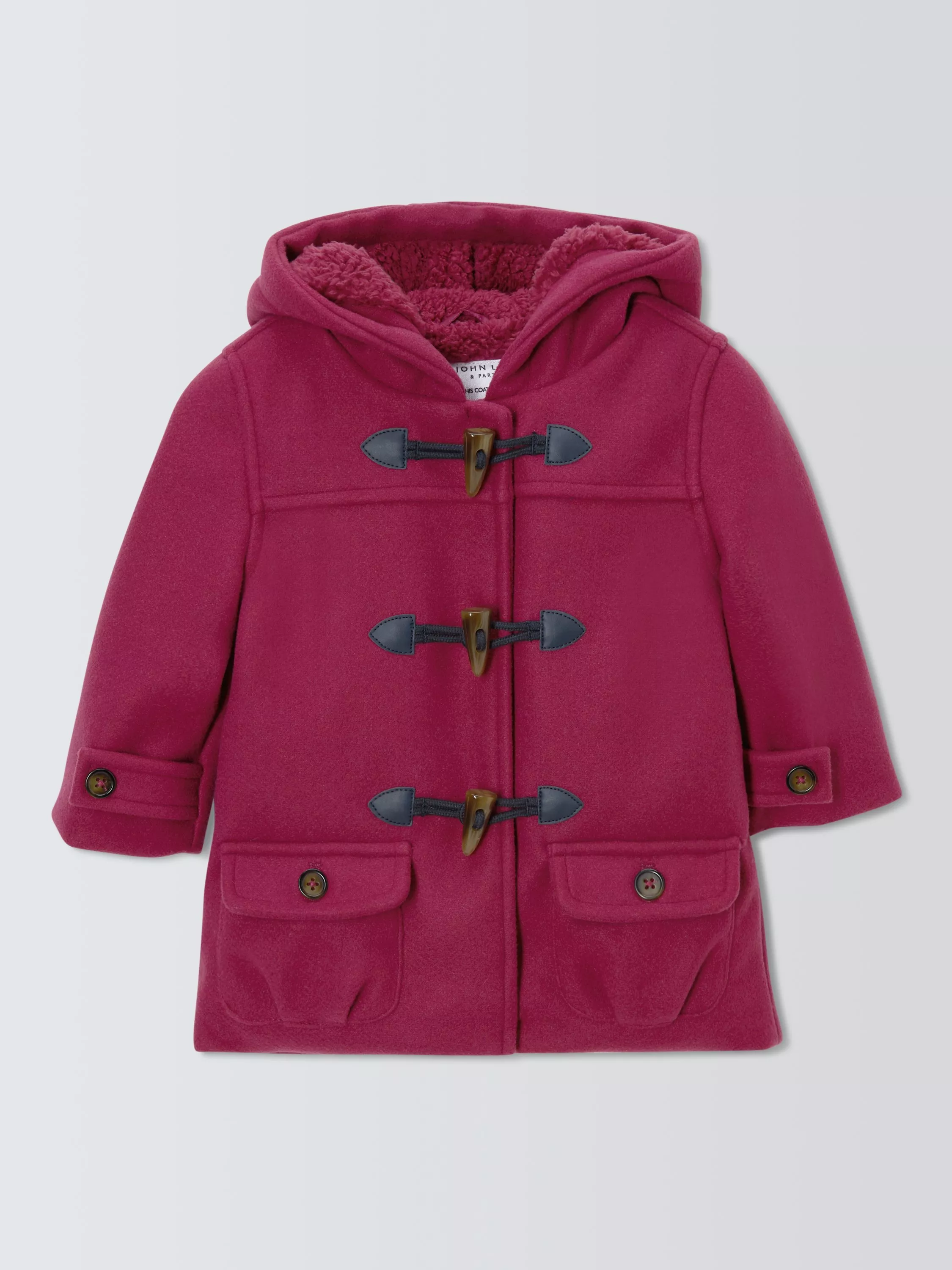 Baby duffle coat lined with polyester fleece. Toggle openings for a traditional look and feel. Contains recycled polyester.