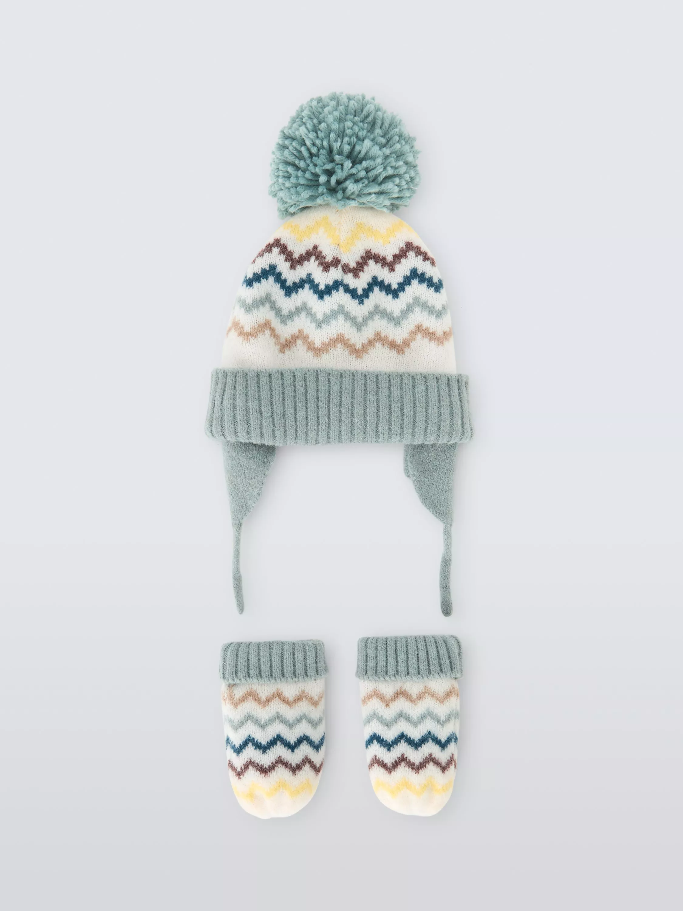 A knitted hat and mittens set, with a cheerful Fair Isle pattern.