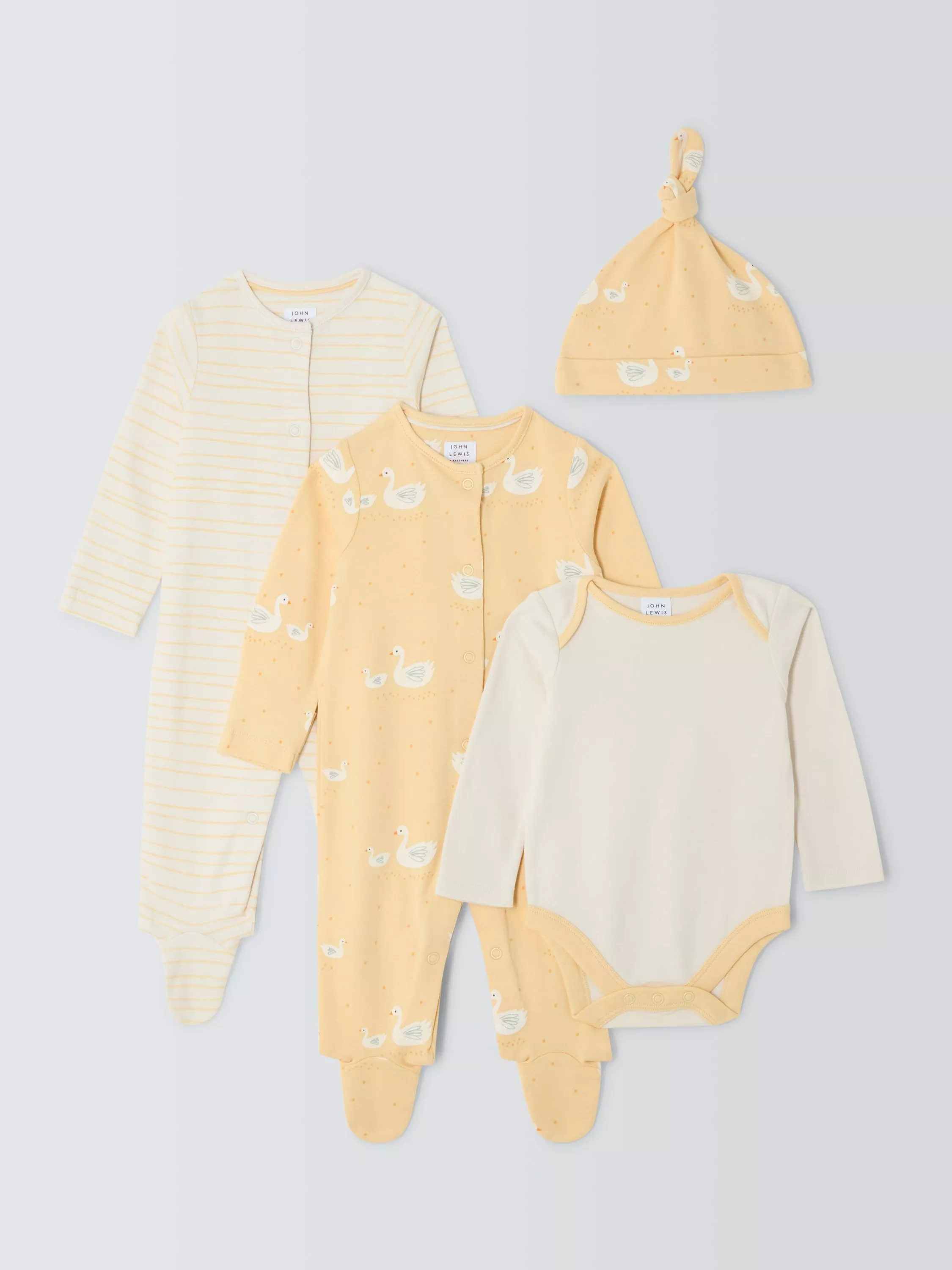 A lovely set perfect as a newborn gift comprising of two sleepsuits, a bodysuit and a hat with swan prints and details.