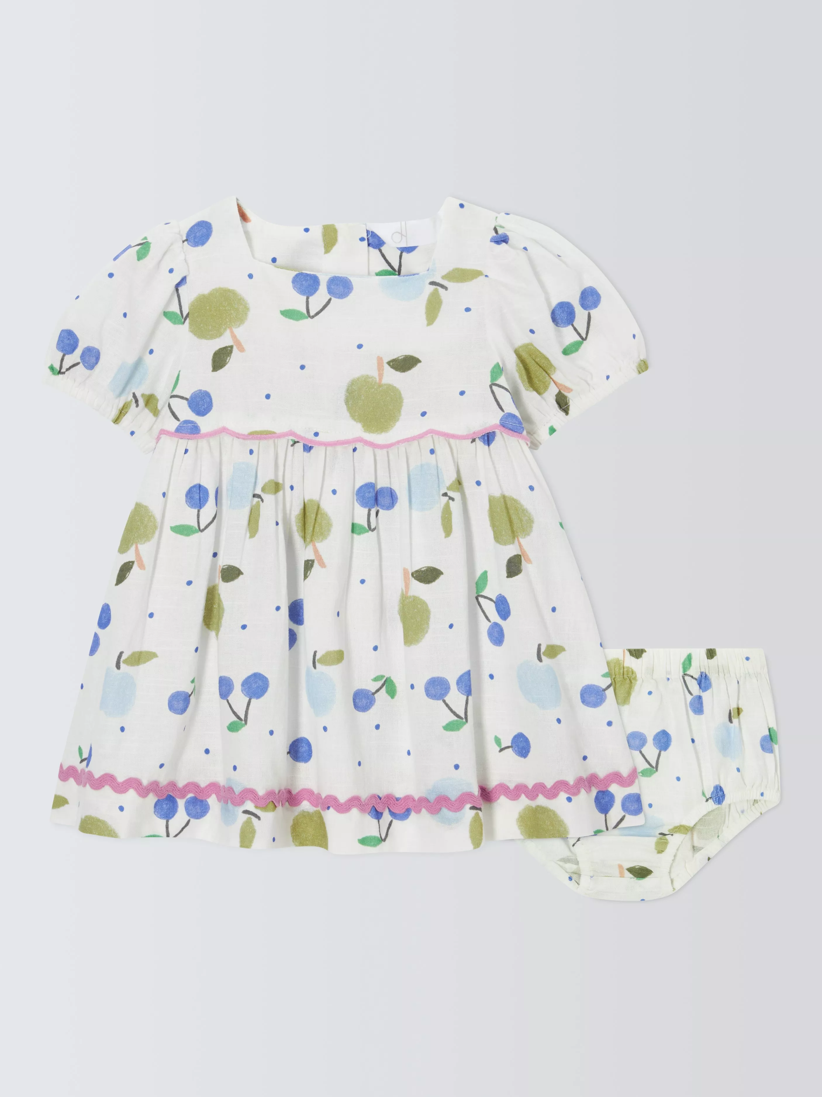 In a bright print with contrasting scallop and wavy trims, this cotton dress comes with matching bloomers.