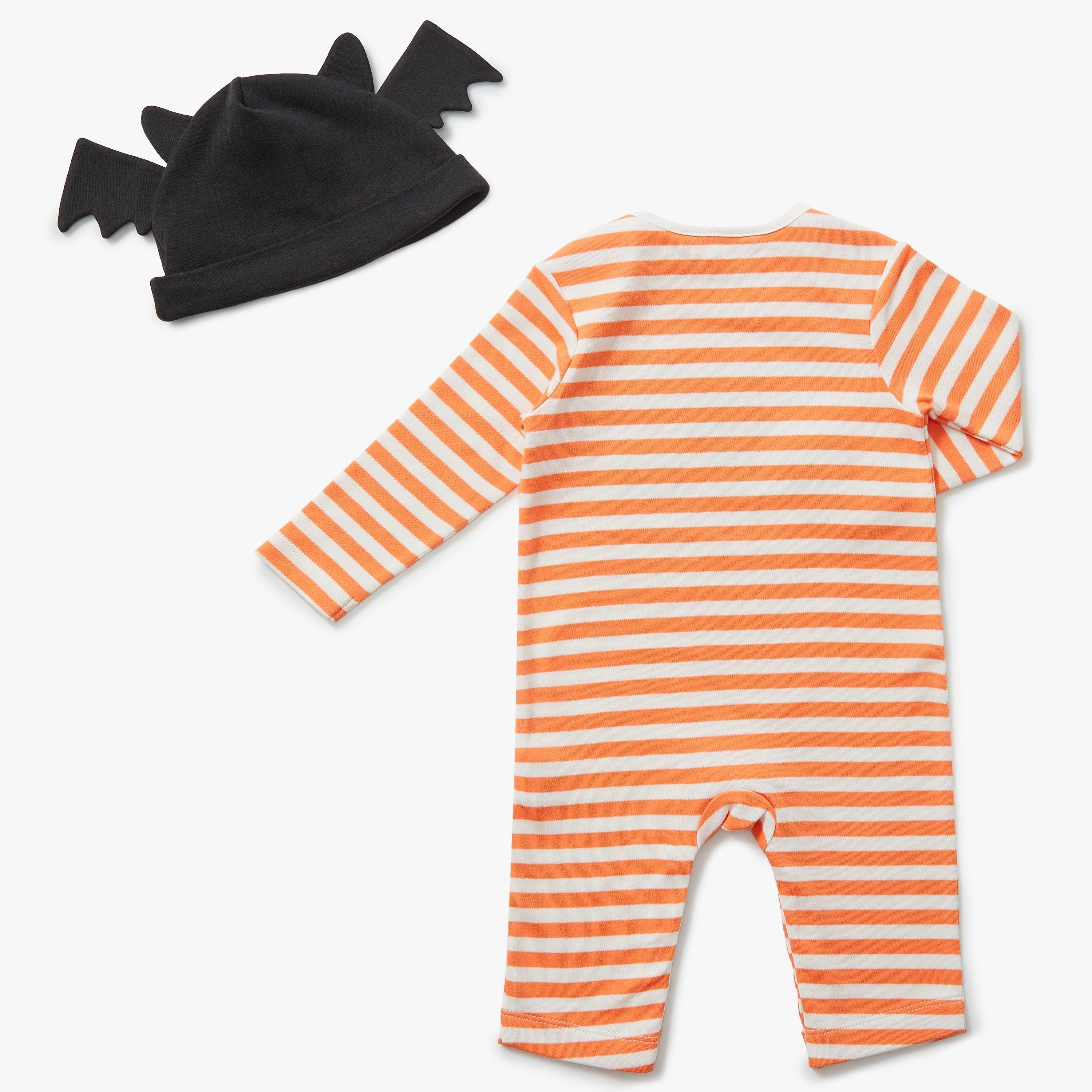 Made from pure, soft cotton, this romper features long sleeves, round neck with popper fastenings at the crotch for comfort and easy changing. Finished with an all-over stripe print with classic slogan for the perfect Halloween outfit, with a matching bat hat for a super-cute finish.