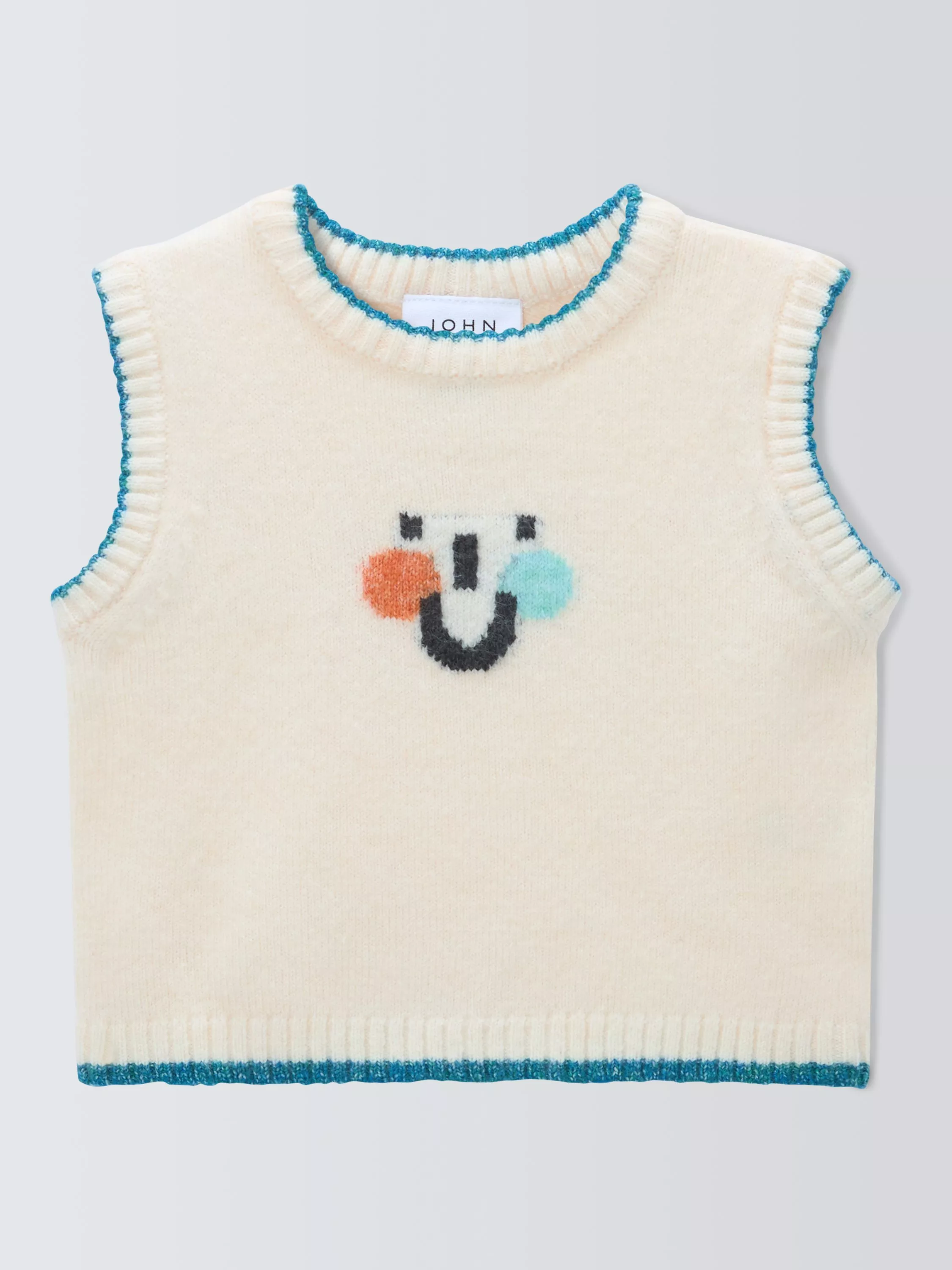 Knitted vest with pops of colour to the centre motif and scalloped trims.
