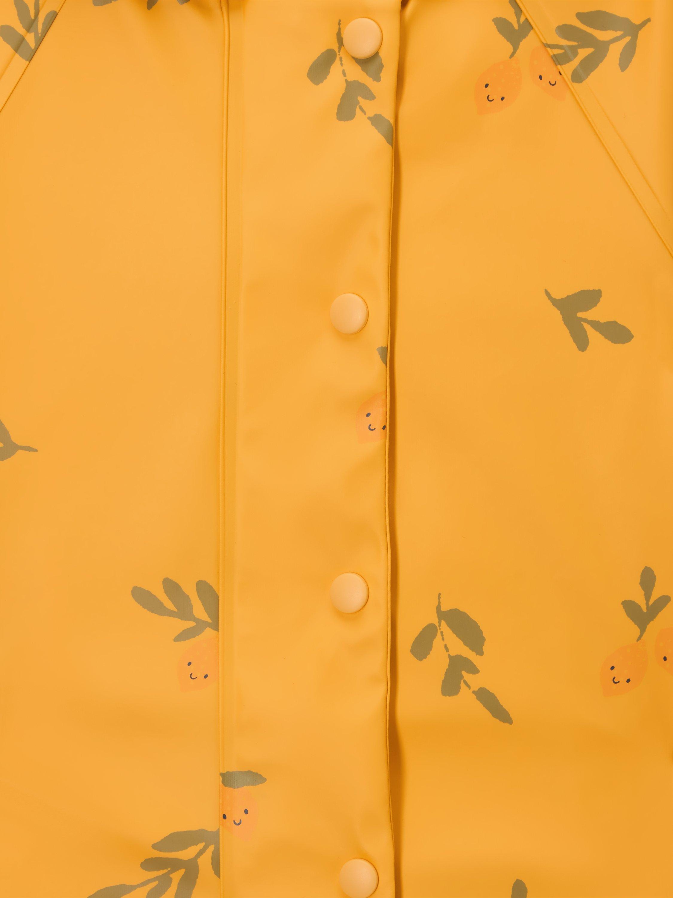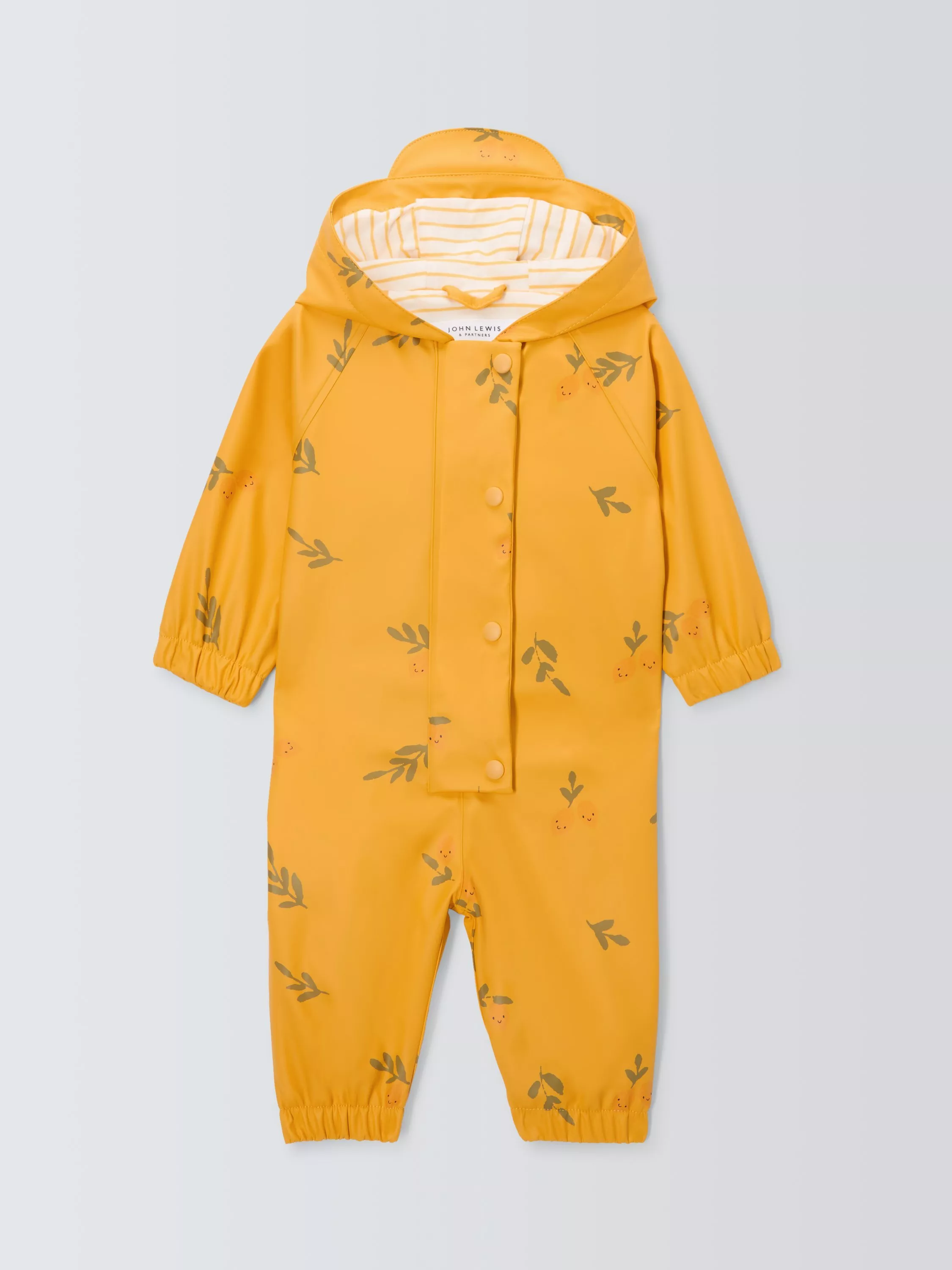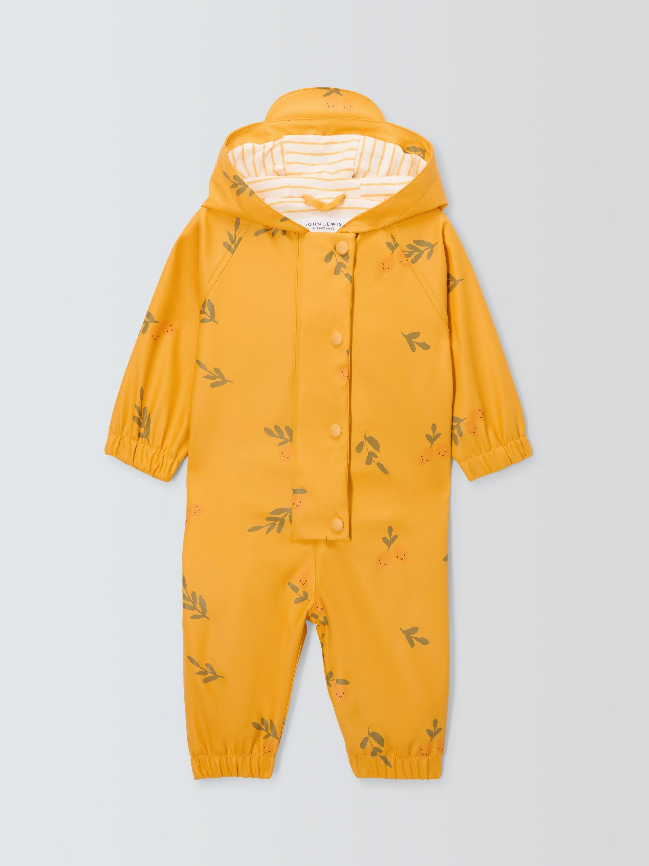 Embrace the puddles with our PU rain puddlesuit with all-over lemons print. A zip-fastening down the centre front with placket and snap fastening means there's no way it'll be coming off and they'll be fully protected from their own splashes. The upper body and hood are lined with a striped single jersey fabric whilst the sleeves and lower body are lined in a polyester taffeta.