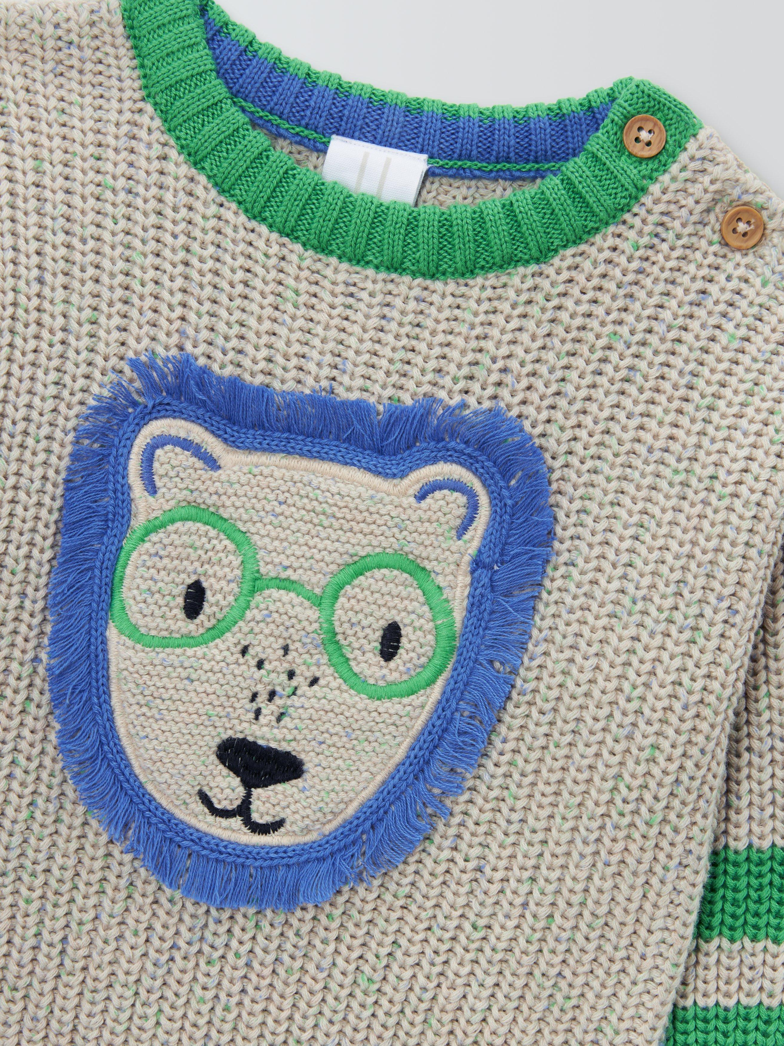 A chunky knit jumper with colourful trims and a lion motif. Complete with rib trims and shoulder buttons for easy dressing.
