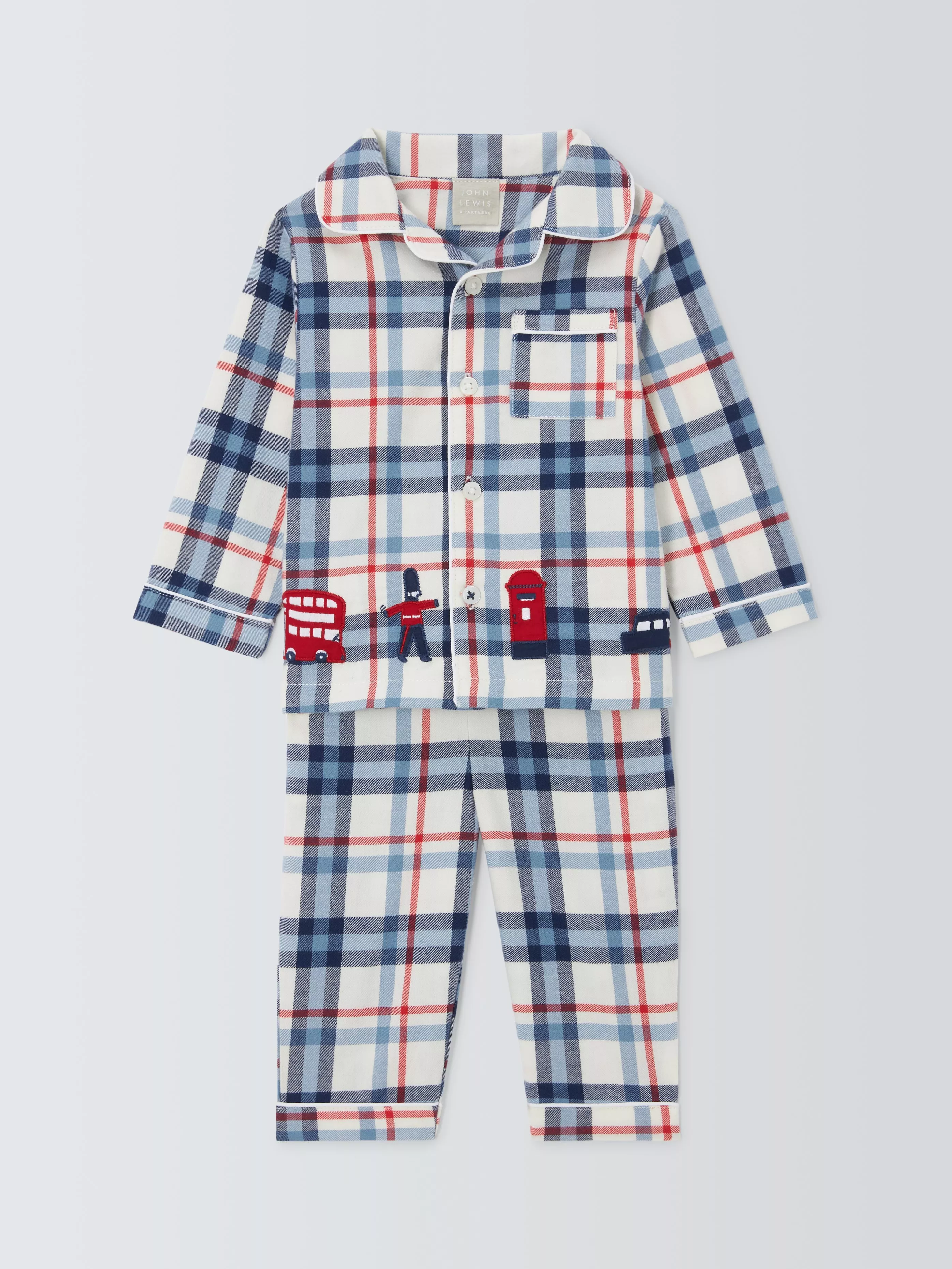 Made from 100% cotton with a classic cut, this pyjama set is covered in a timeless check print and boasts London-themed applique details.
