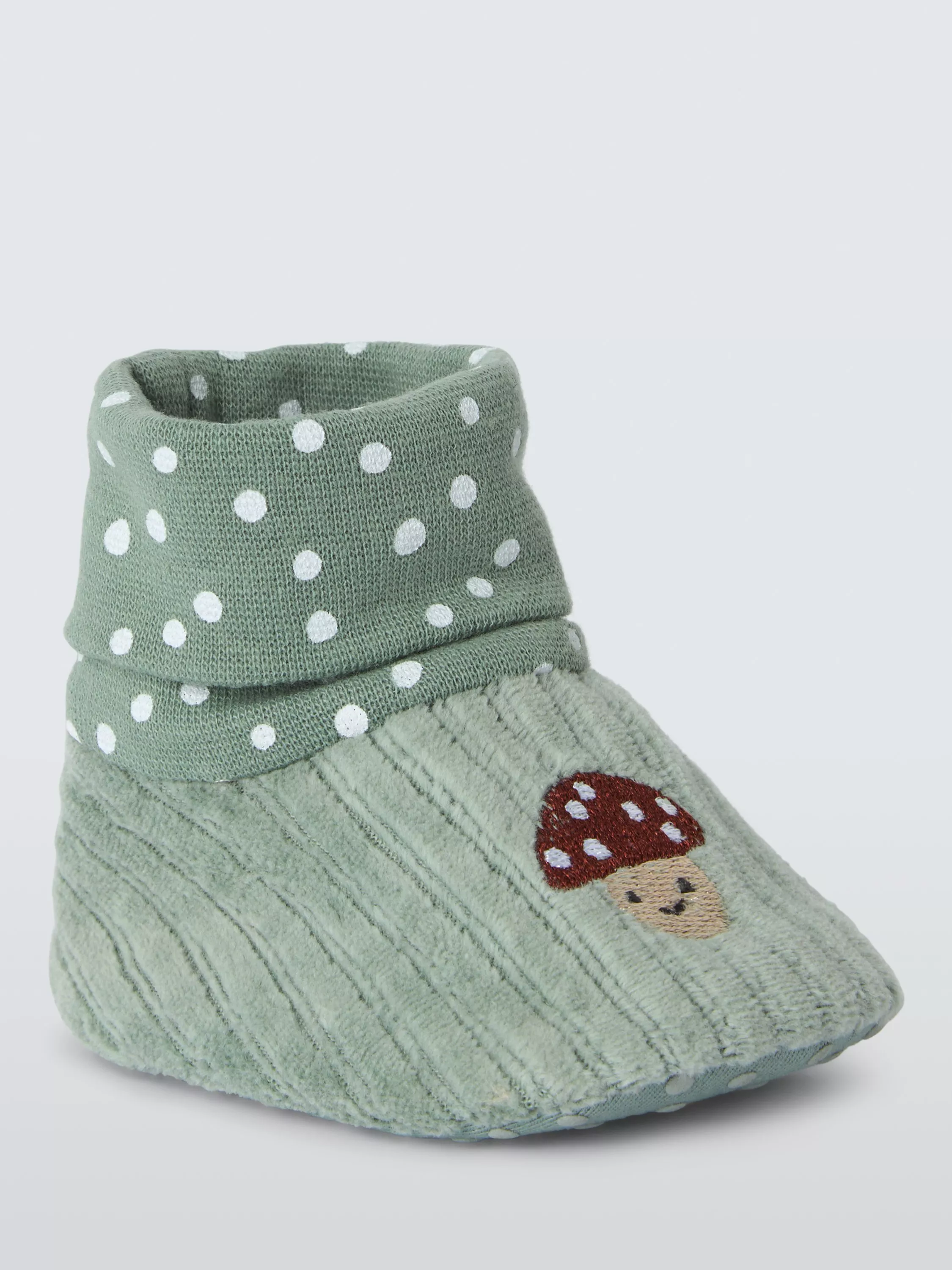 Booties in a soft cord fabric, with playful polka dot sock tops, and an embroidered smiling mushroom.