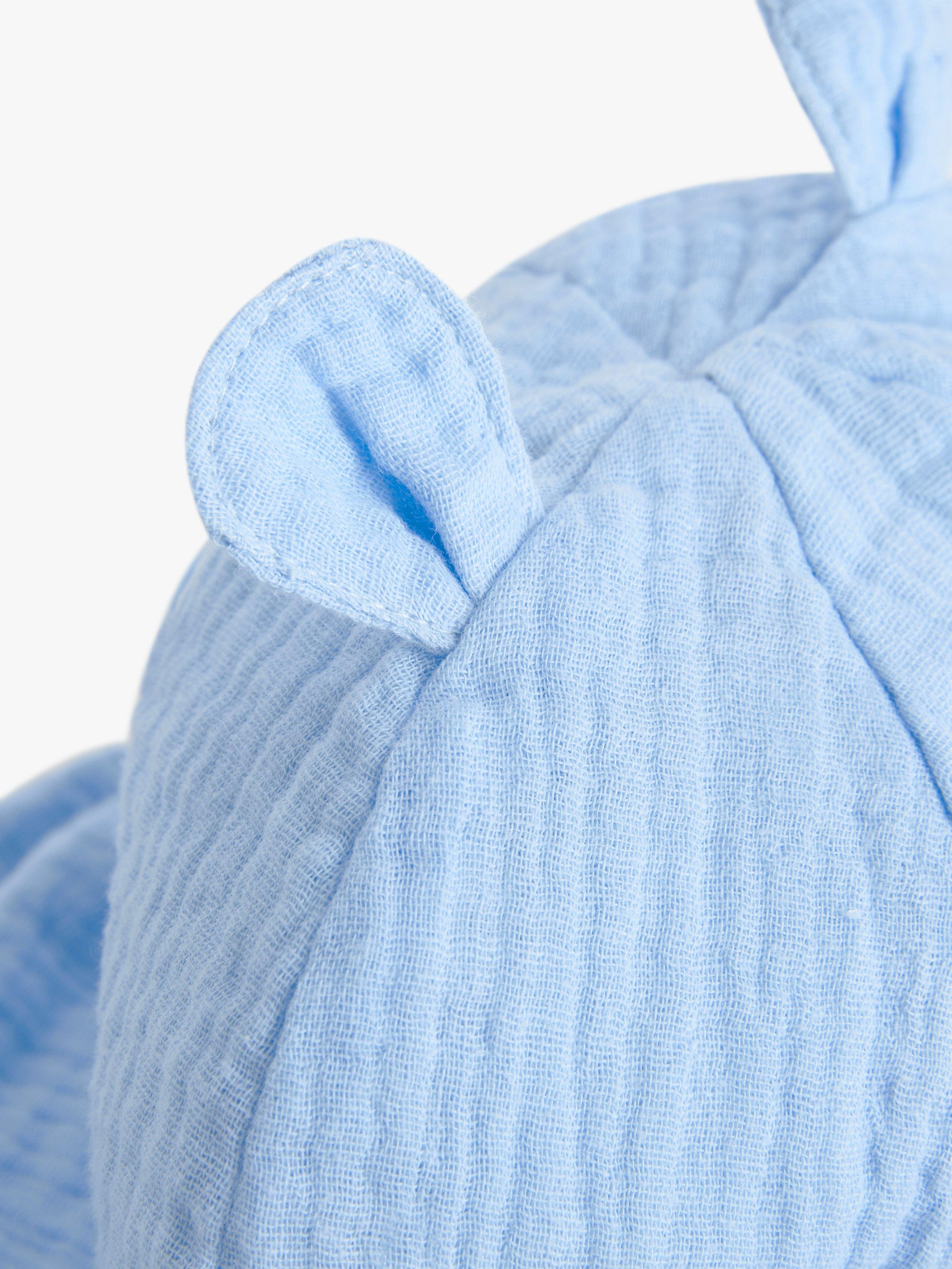 Perfect for the warmer months, this adorable hat is made from cotton muslin for a lightweight and breathable feel. An under the chin strap with rip tape fastening ensures it stays in place while the sweet little ears add that extra cute factor.