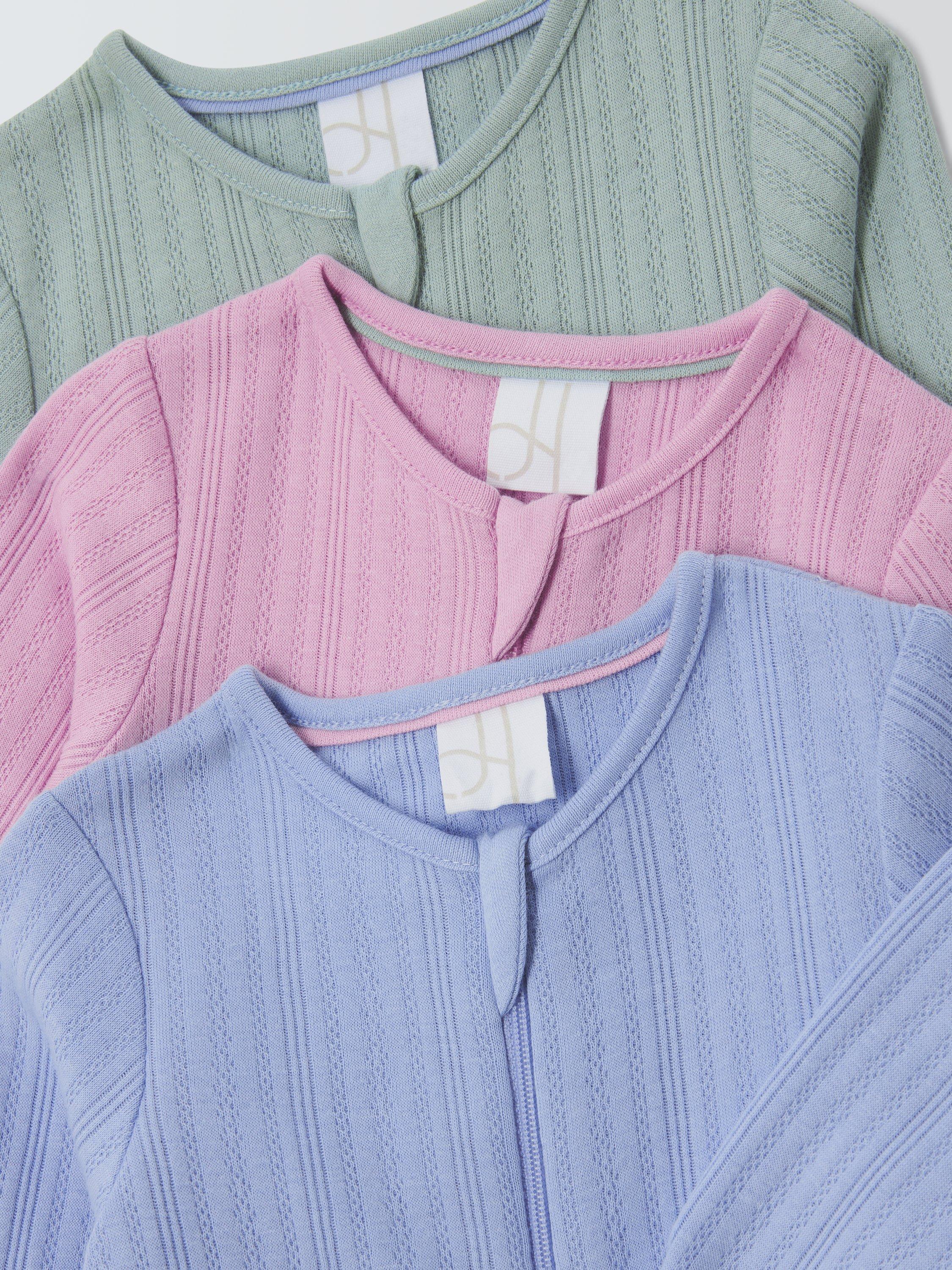A pack of 3 sleepsuits made from cotton for all-night comfort and with pointelle designs. The zip-up design helps with quick and easy dressing.