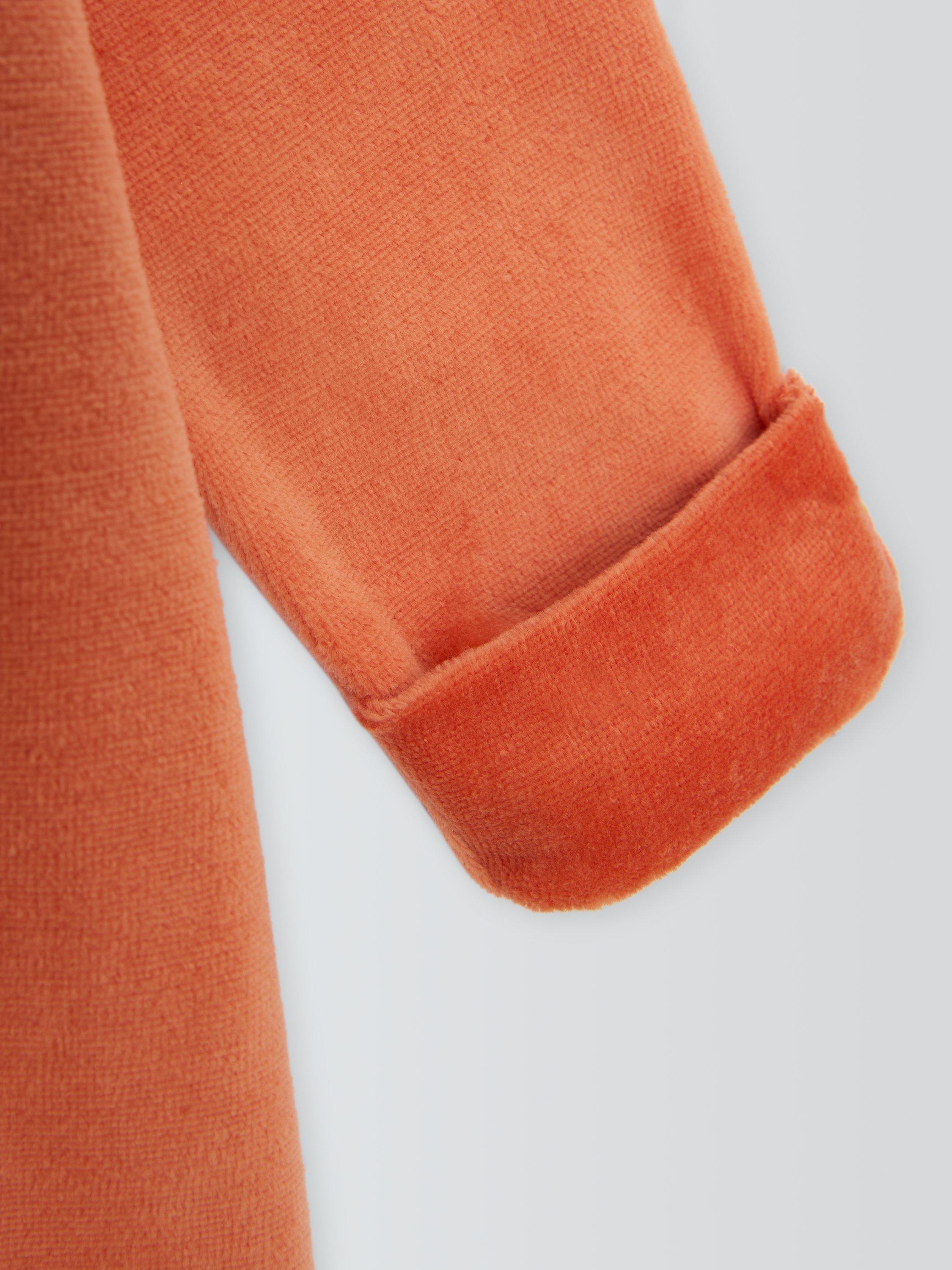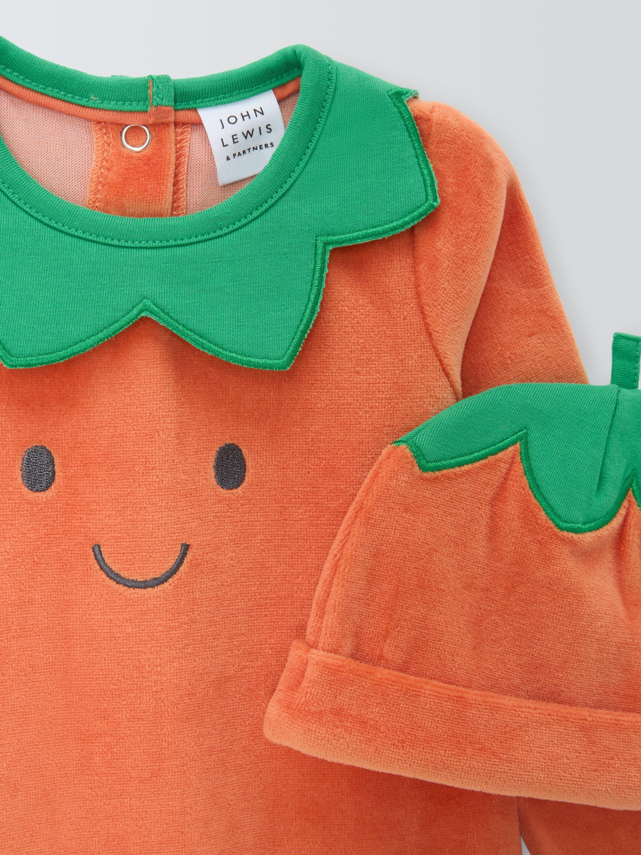A novelty pumpkin romper for nursery dress-up day. Made in soft velour, it has a snap opening and comes with a matching hat.