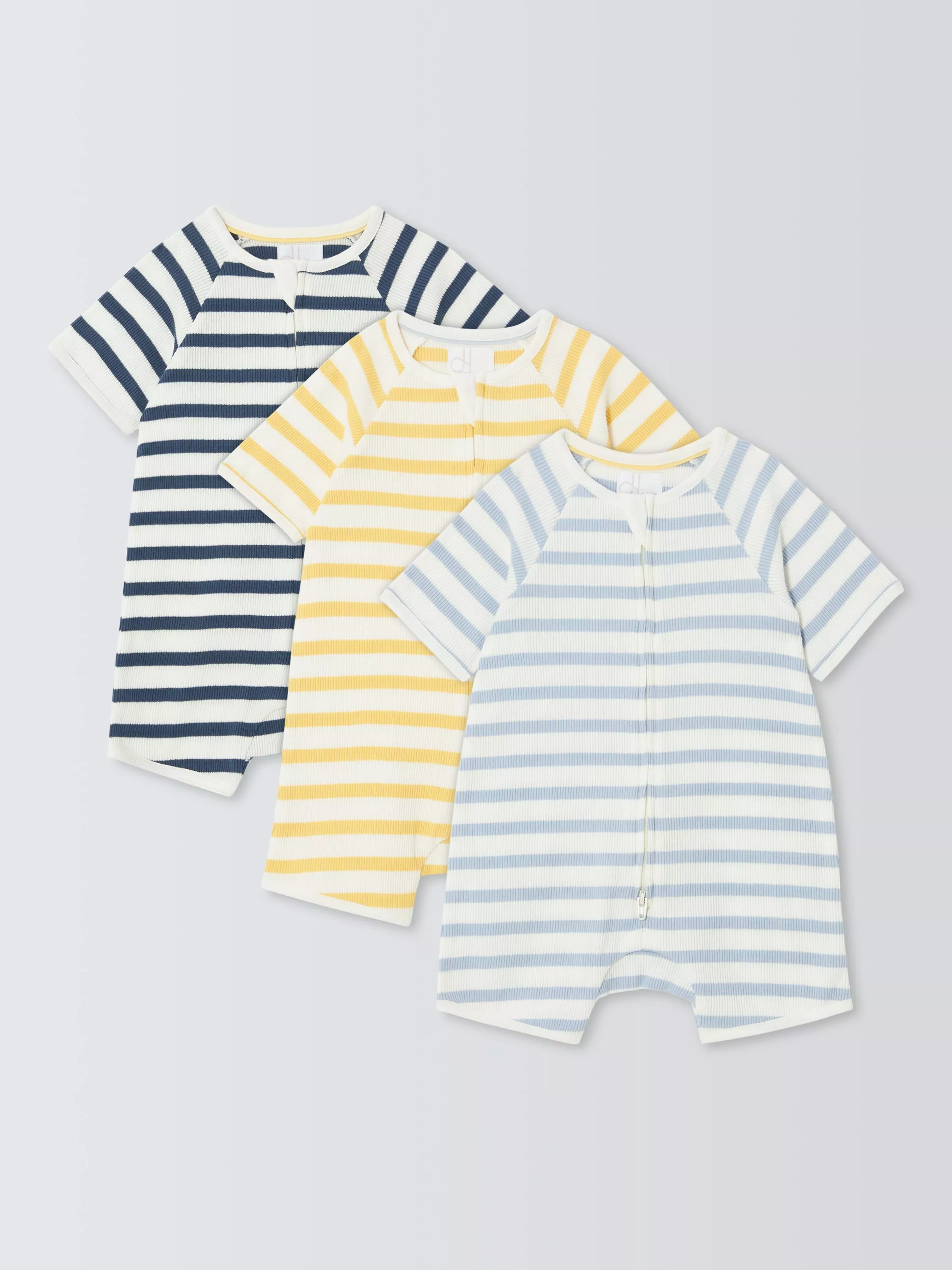A set of 3 short, striped rompers. Made from ribbed cotton for stretch and softness against delicate skin and with zip-front fastenings for easy dressing.