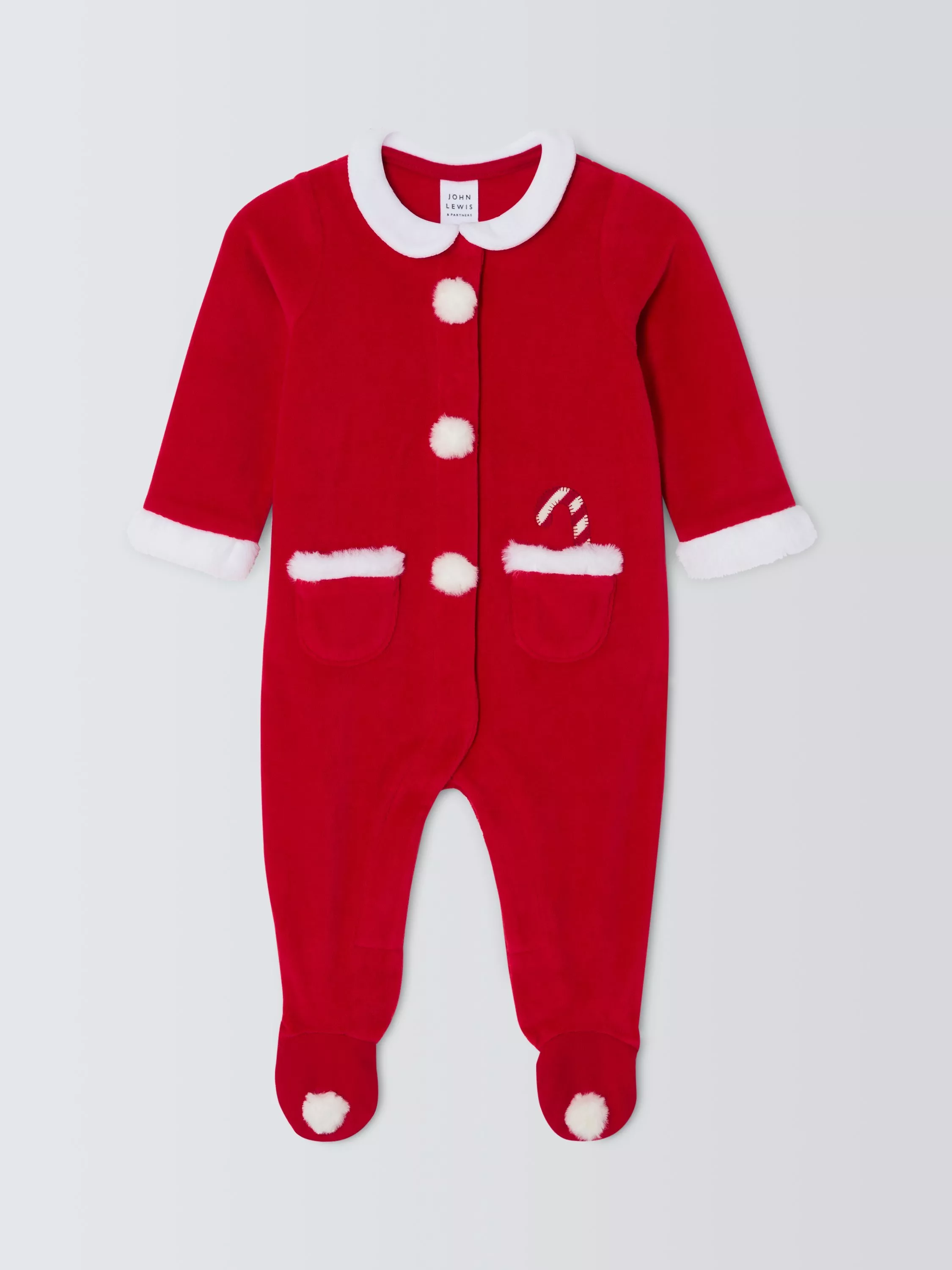A Santa sleepsuit with furry trims and candy cane detail at one pocket.