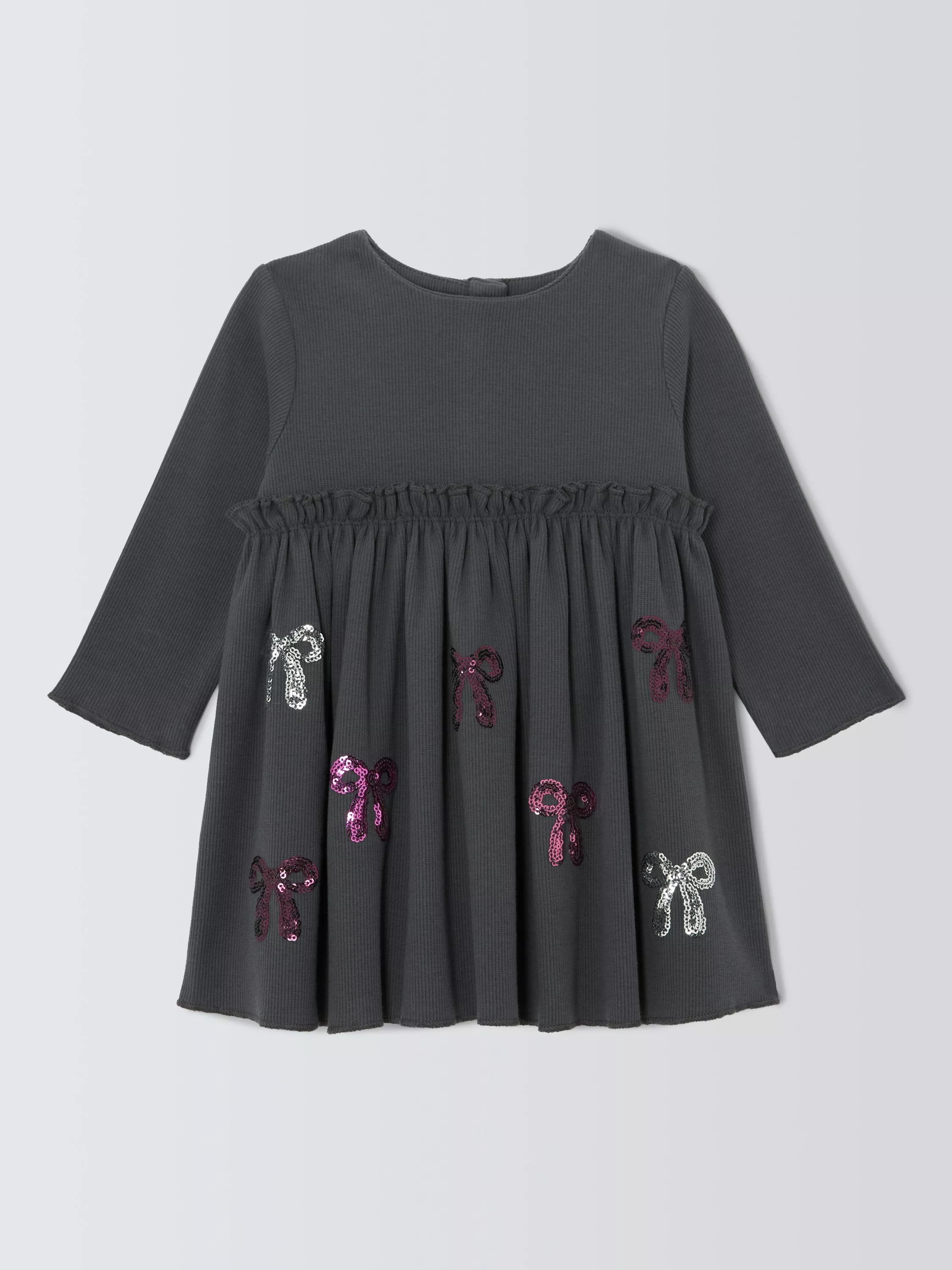 Made from a cotton stretch blend for softness and movement, this dress has a ribbed texture and sequined bows across the front skirt. Buttons down the centre back make for easy dressing.