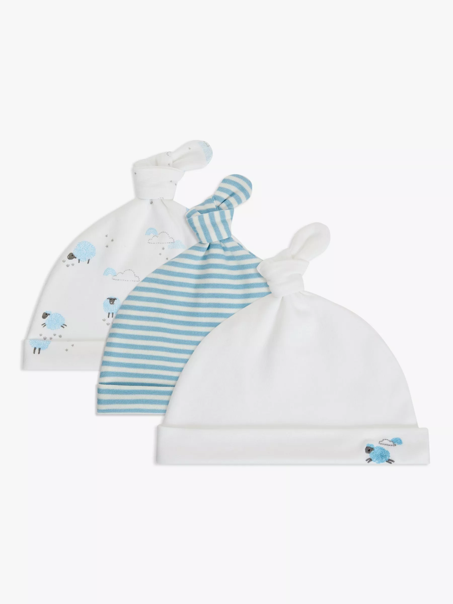 A sweet seat of three hats for keeping baby cosy. Each one in a different design, they are all made from 100% soft jersey cotton.