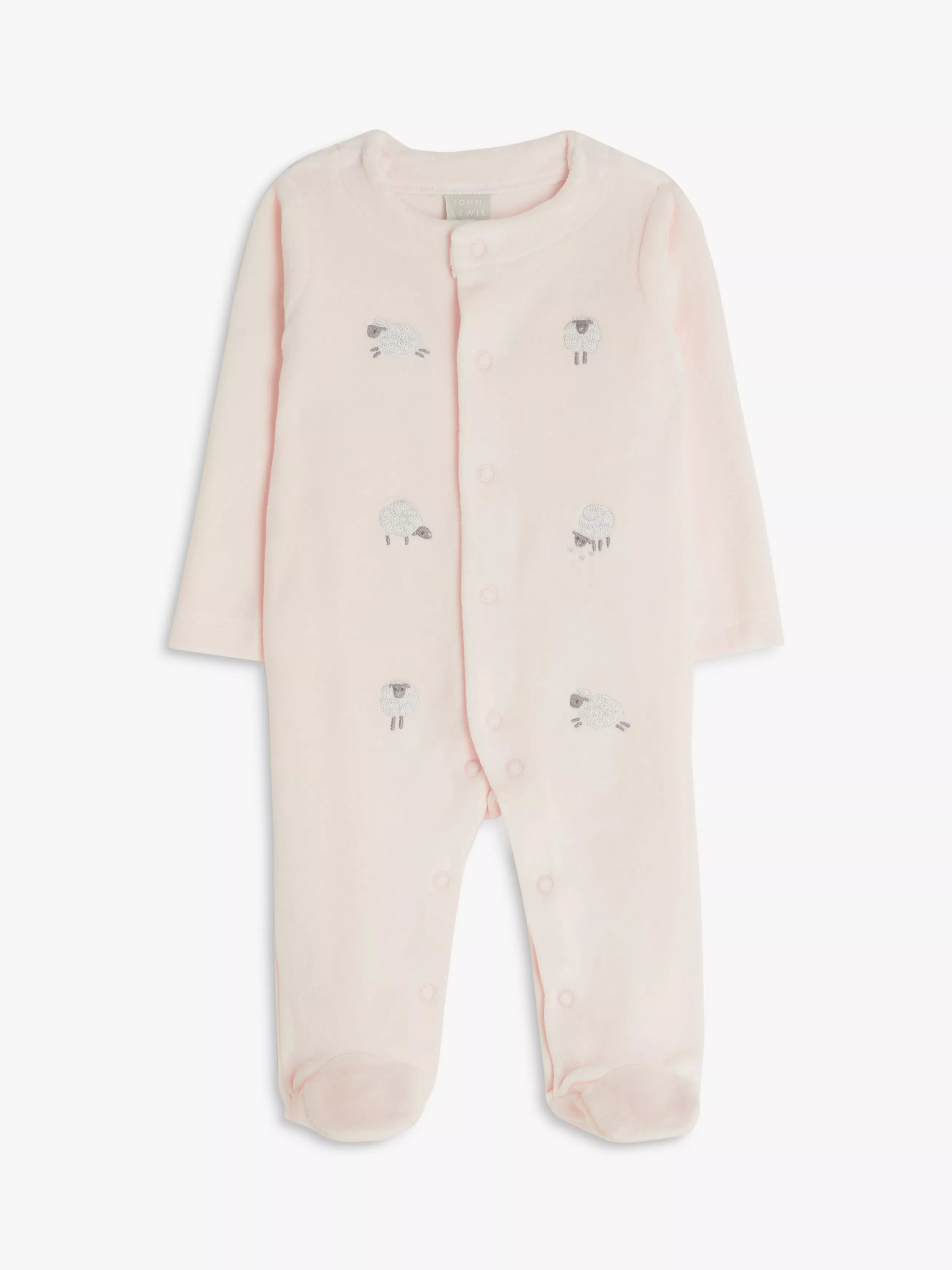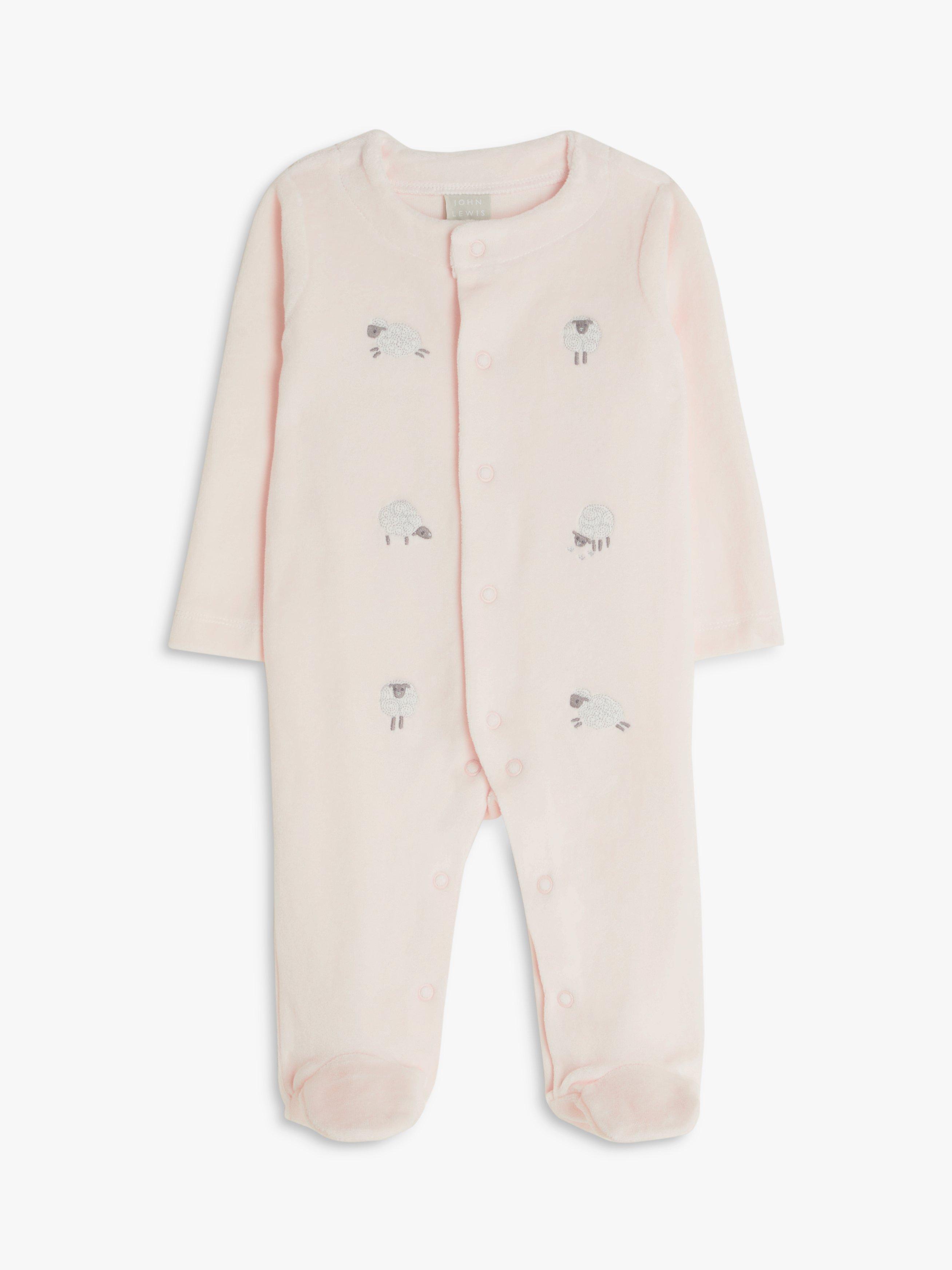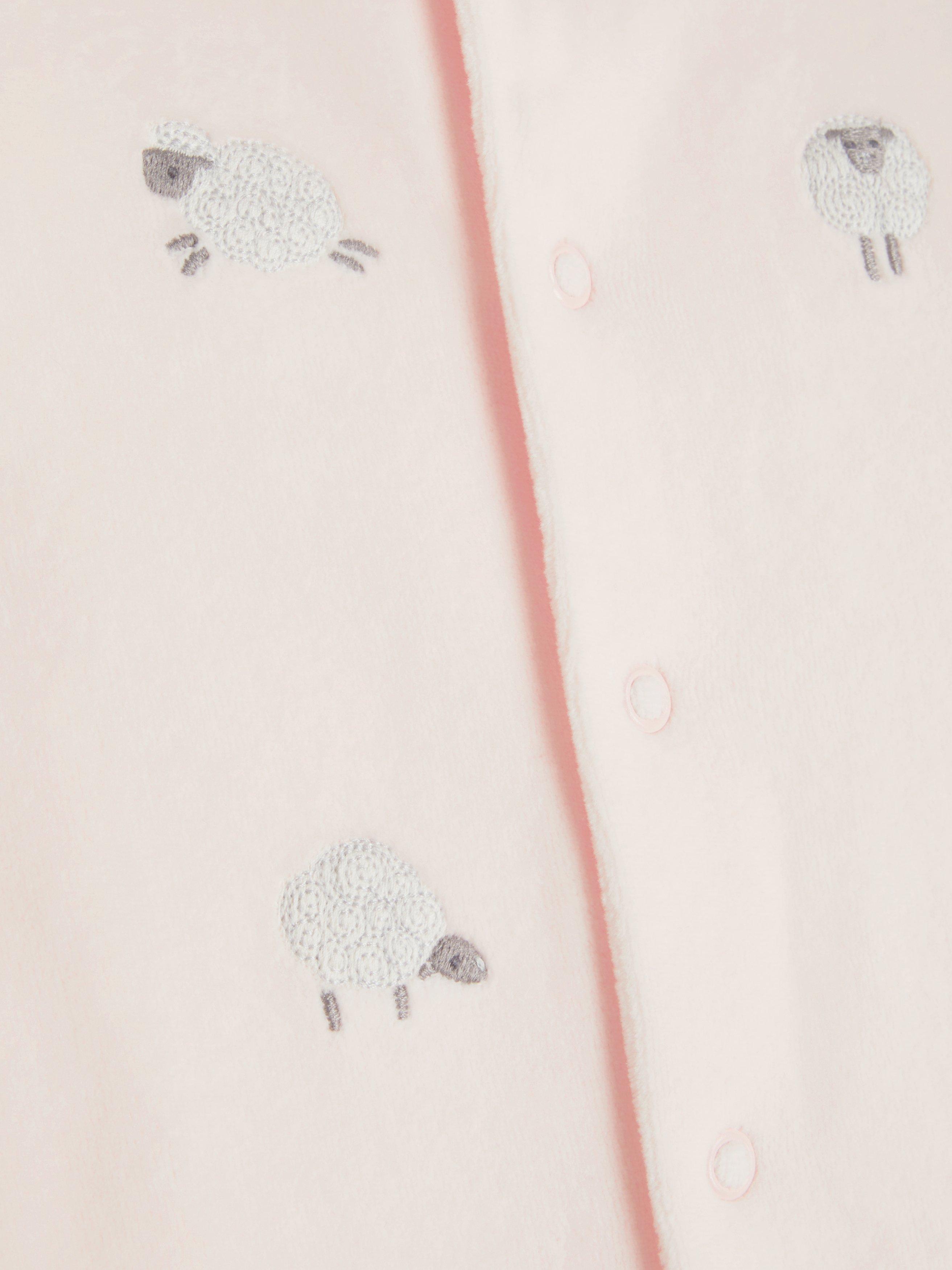 This softy velour sleepsuit is designed to keep baby warm and cosy during naps and bedtime. The adorable style is adored with cute embroidered sheep on the front and is completed with enclosed feet and poppers throughout the front making life a little simpler.