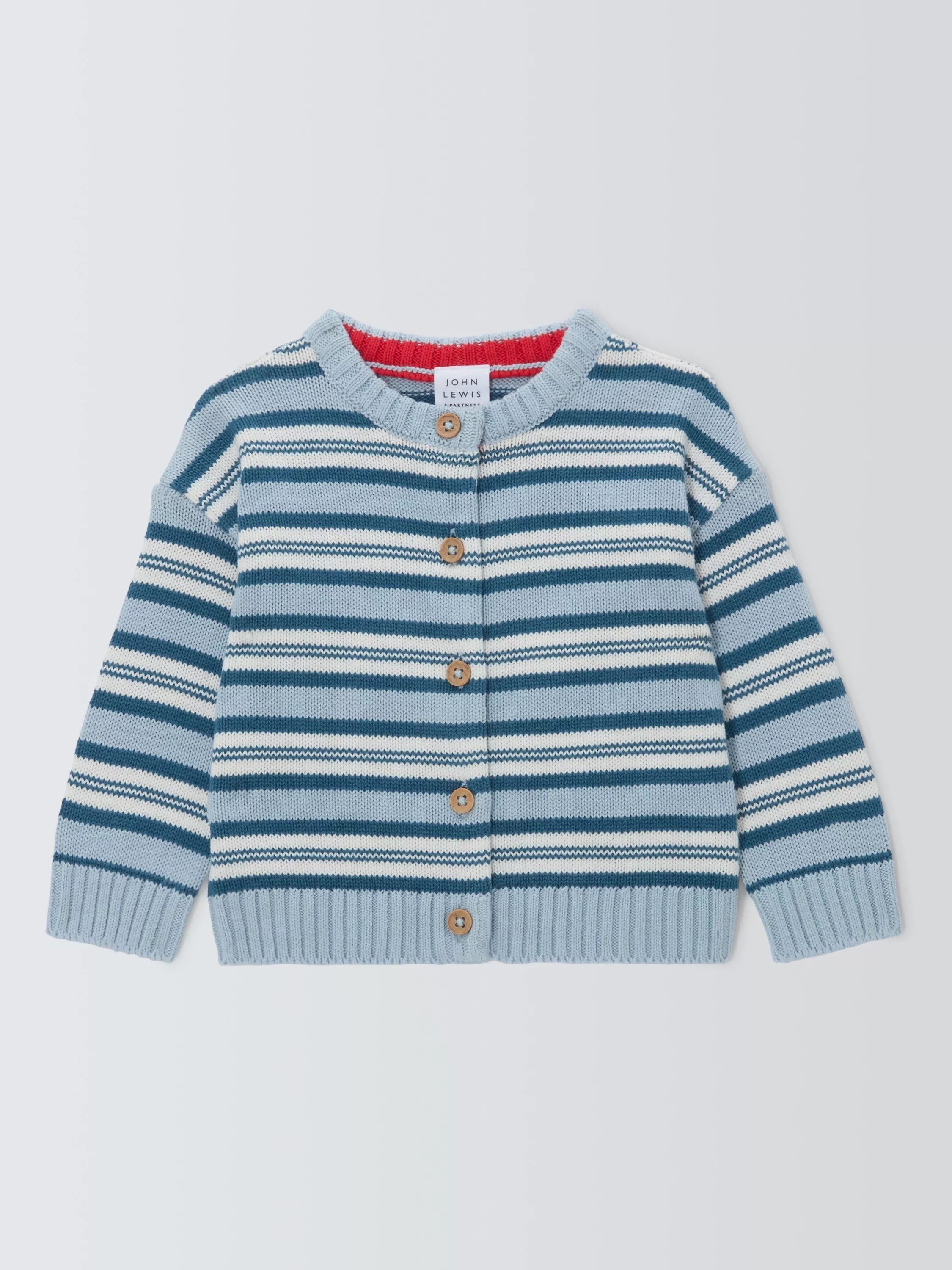 A classic stripe cotton cardigan with rib knit collar and cuffs and wooden buttons.