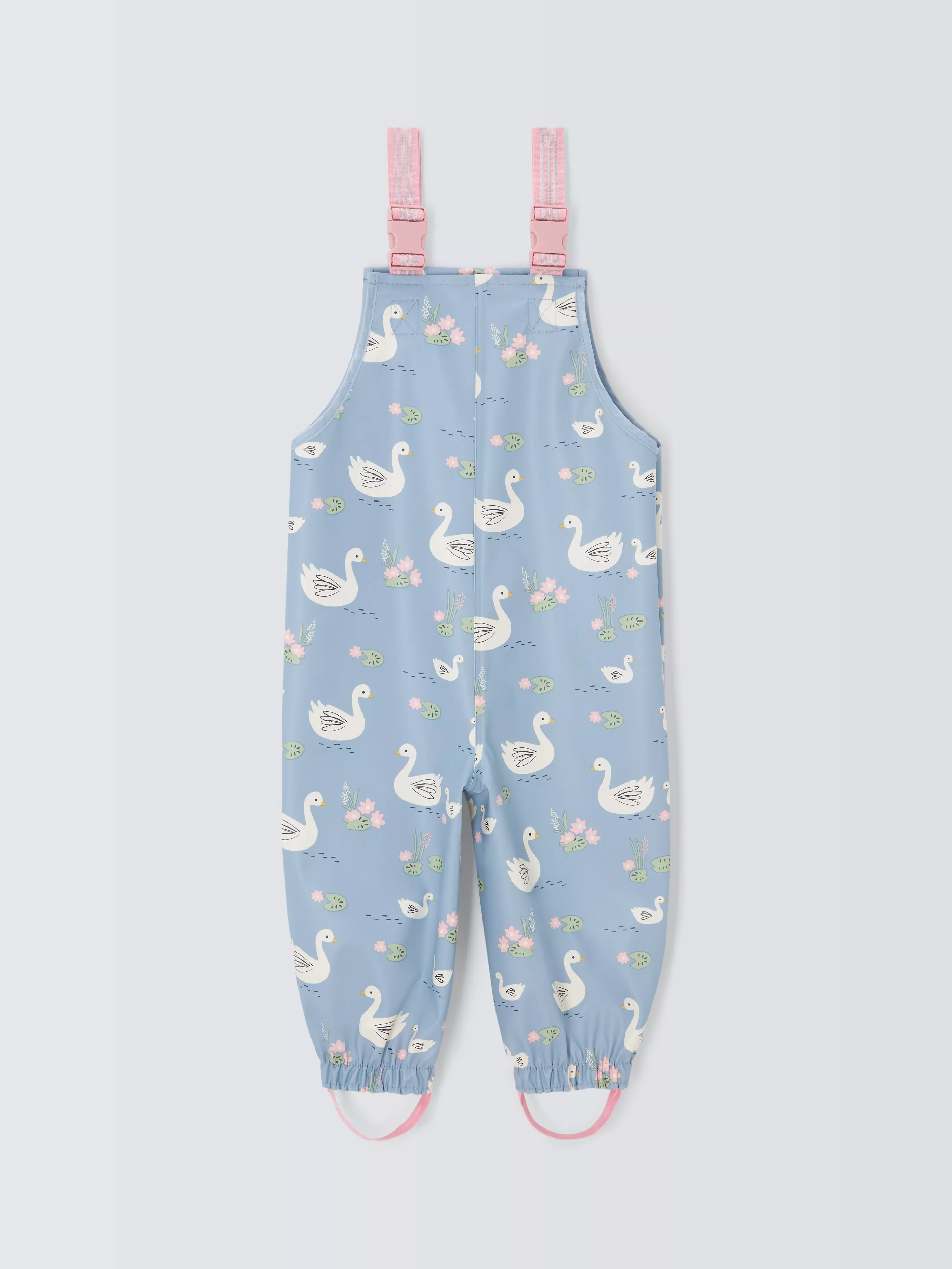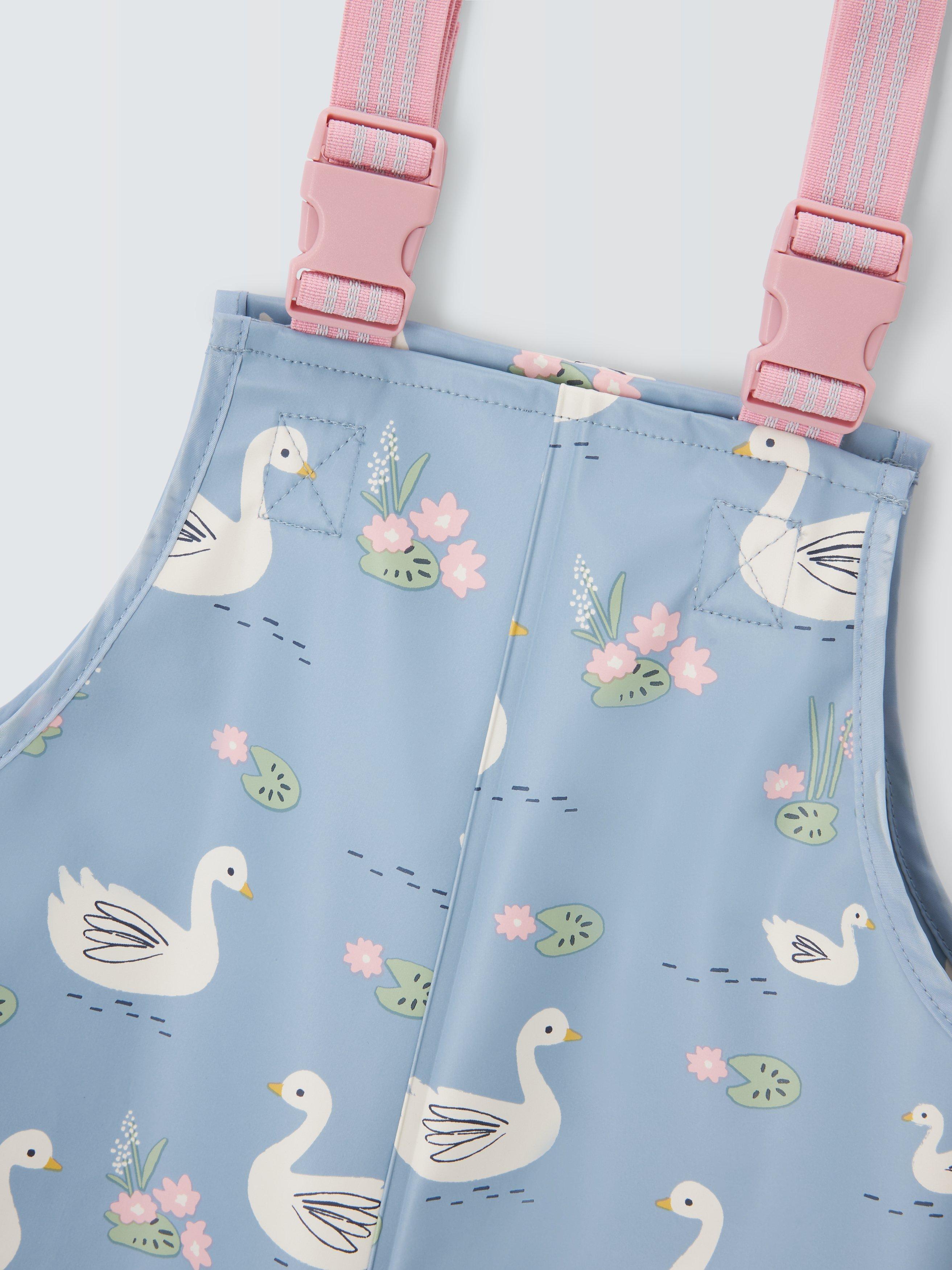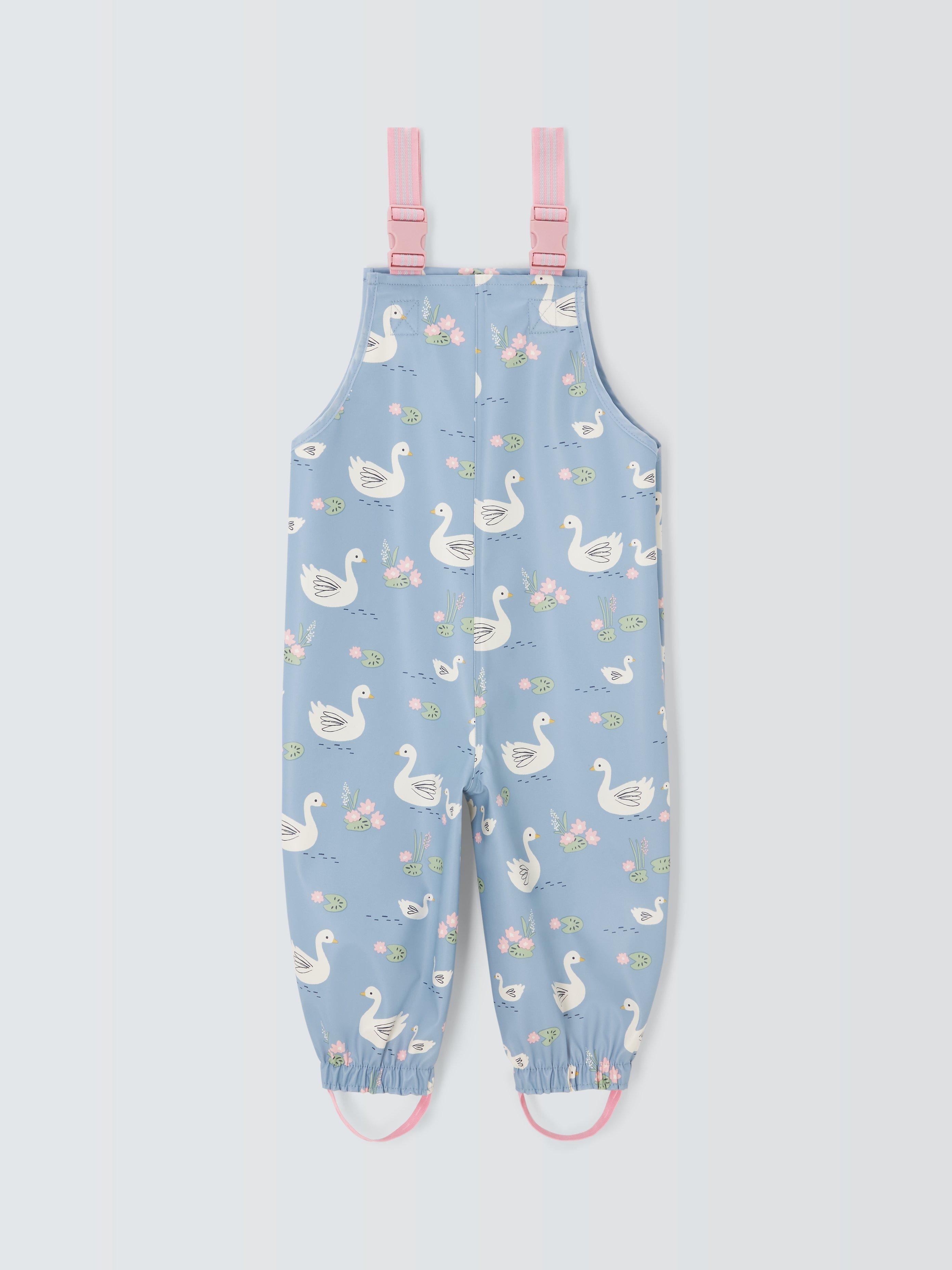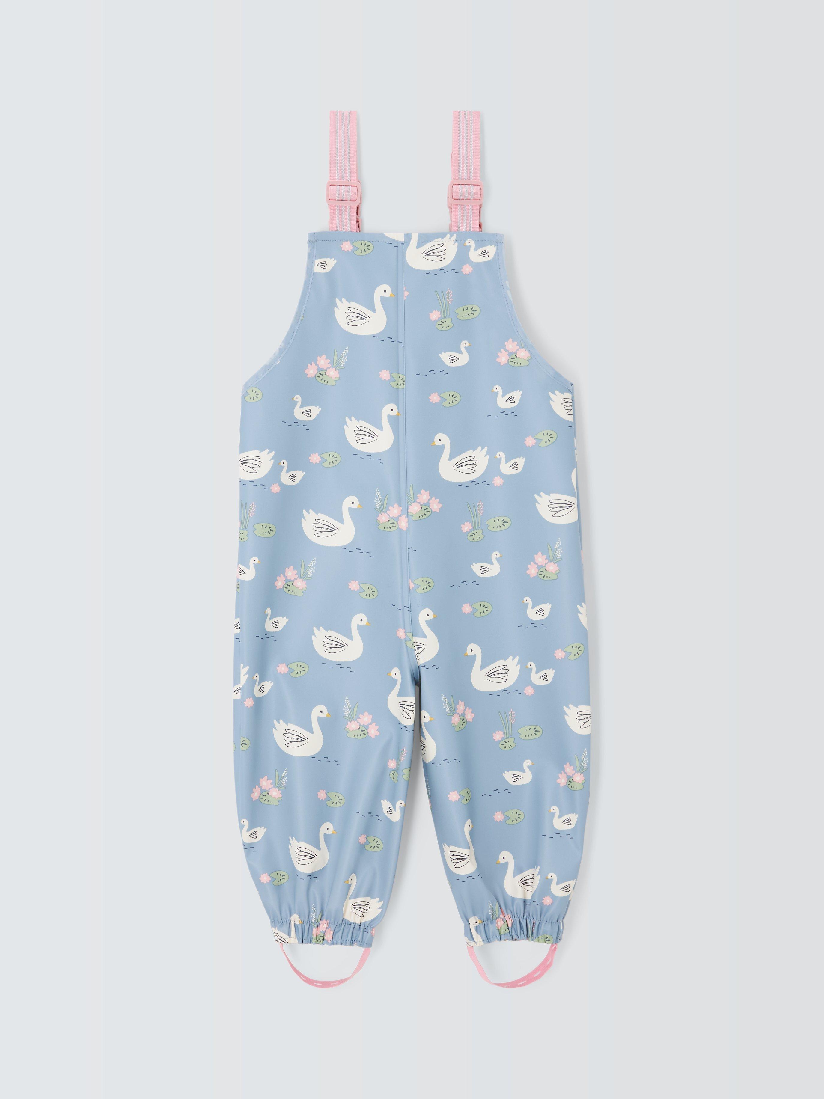 Fear those muddy puddles no more with these waterproof dungarees. The shower-resistant style is covered in a sweet swan print and comes complete with foot straps that help keep the legs snug in their wellies.