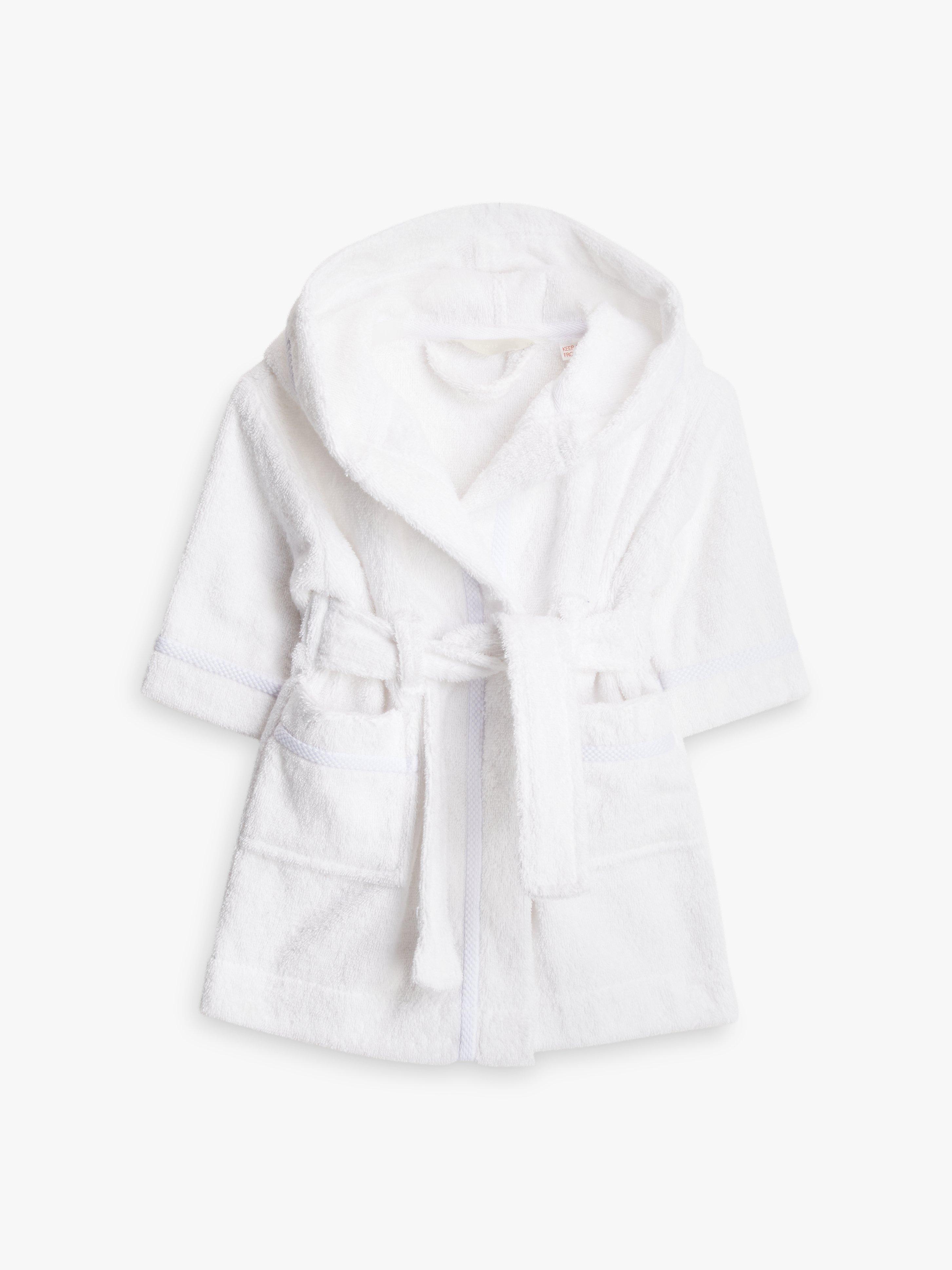 Wrap them up in something and warm and cosy after bath-time or before bed. The hood, front pockets and long sleeves will keep them feeling snug and they're all finished with a classic braided trim. Includes loop at the neck, so it can be hung up.