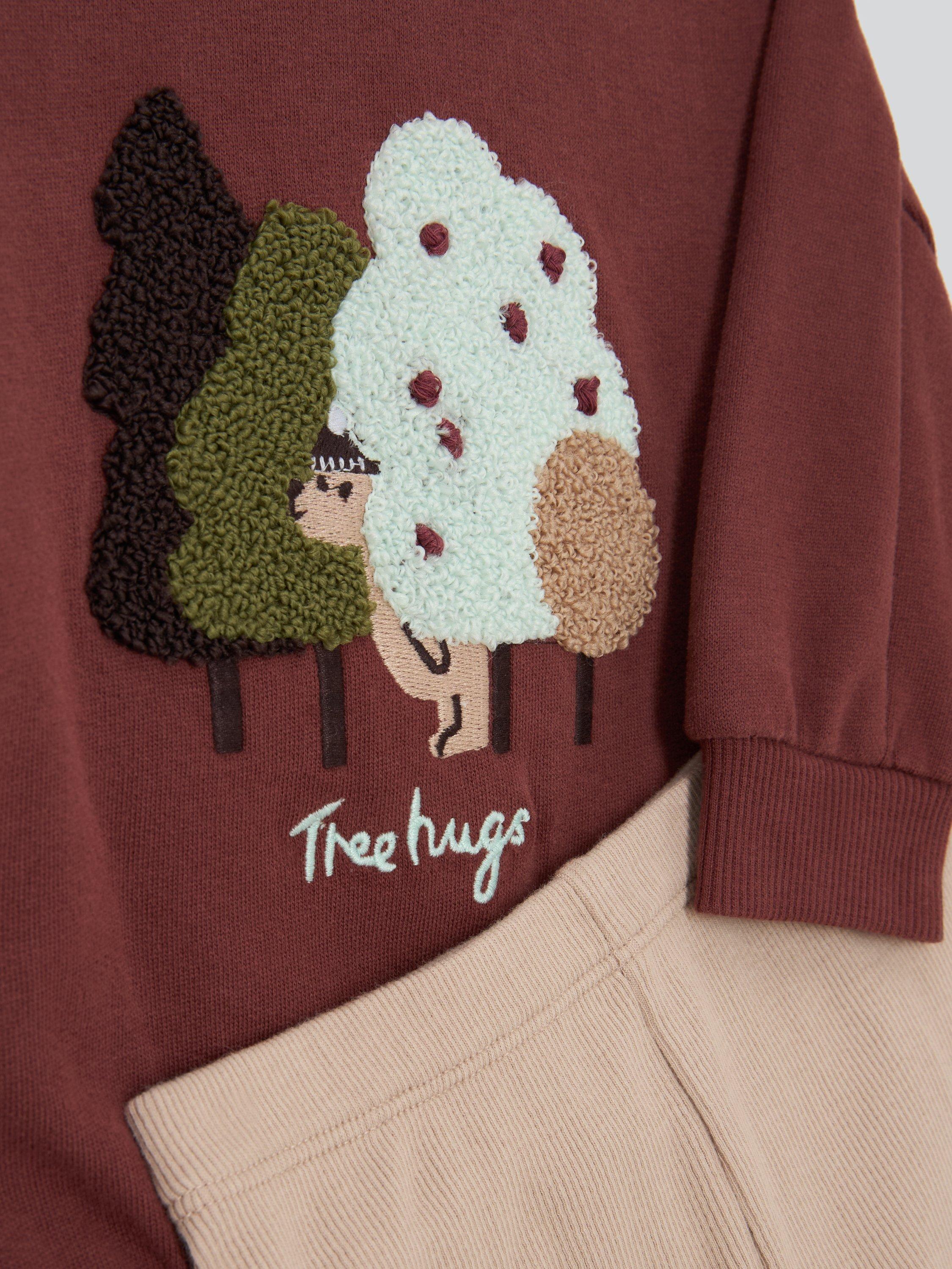 Sweatshirt and joggers set with a cute bear in the forest embroidery on the back. The joggers have a soft elasticated waist.