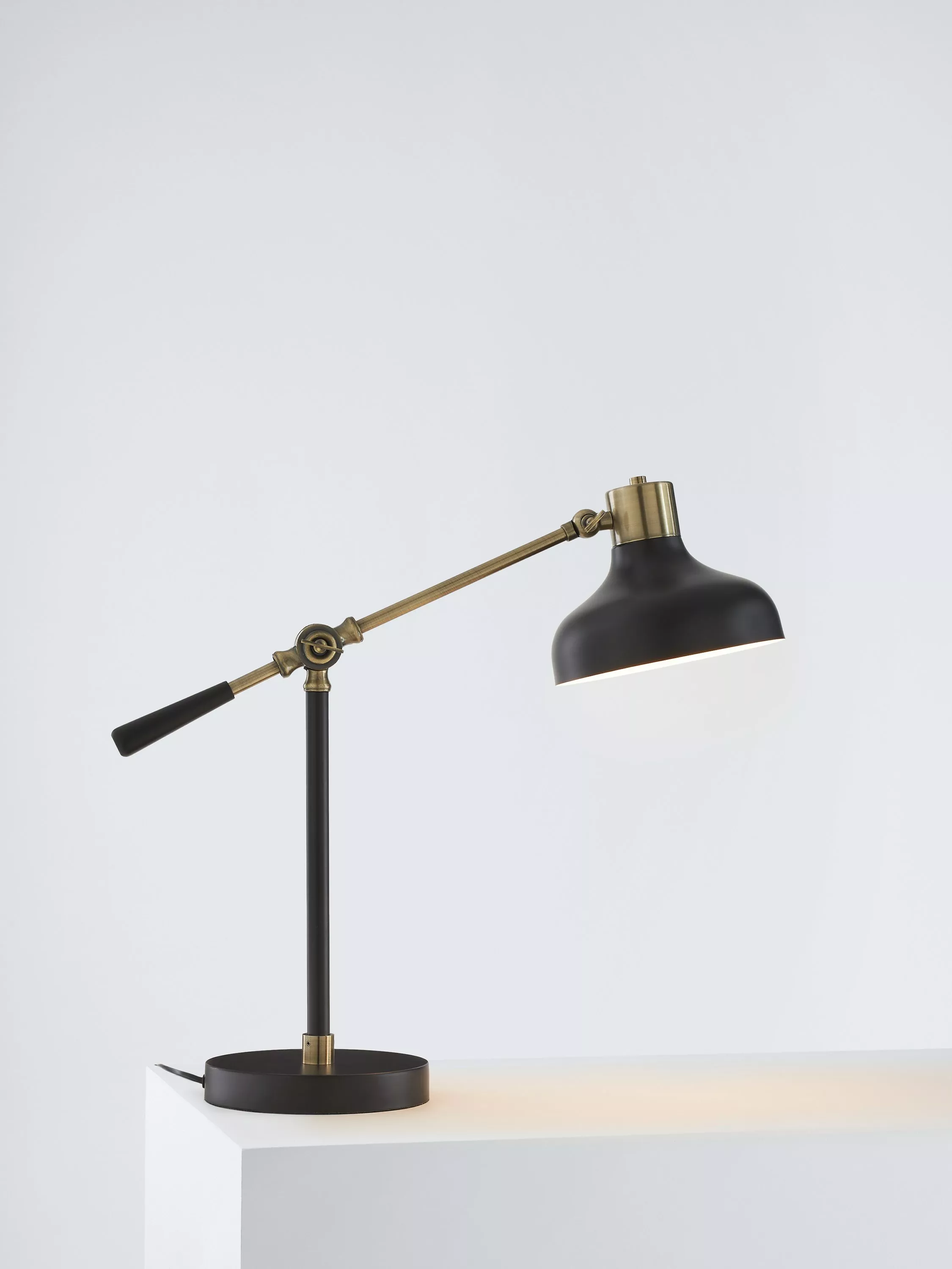 Our Balance Arm Table Lamp has an adjustable stand and shade for controlled lighting. The weighted base keeps the design stable and the desk lamp features antique brass details combined with solid colour in a painted finish.