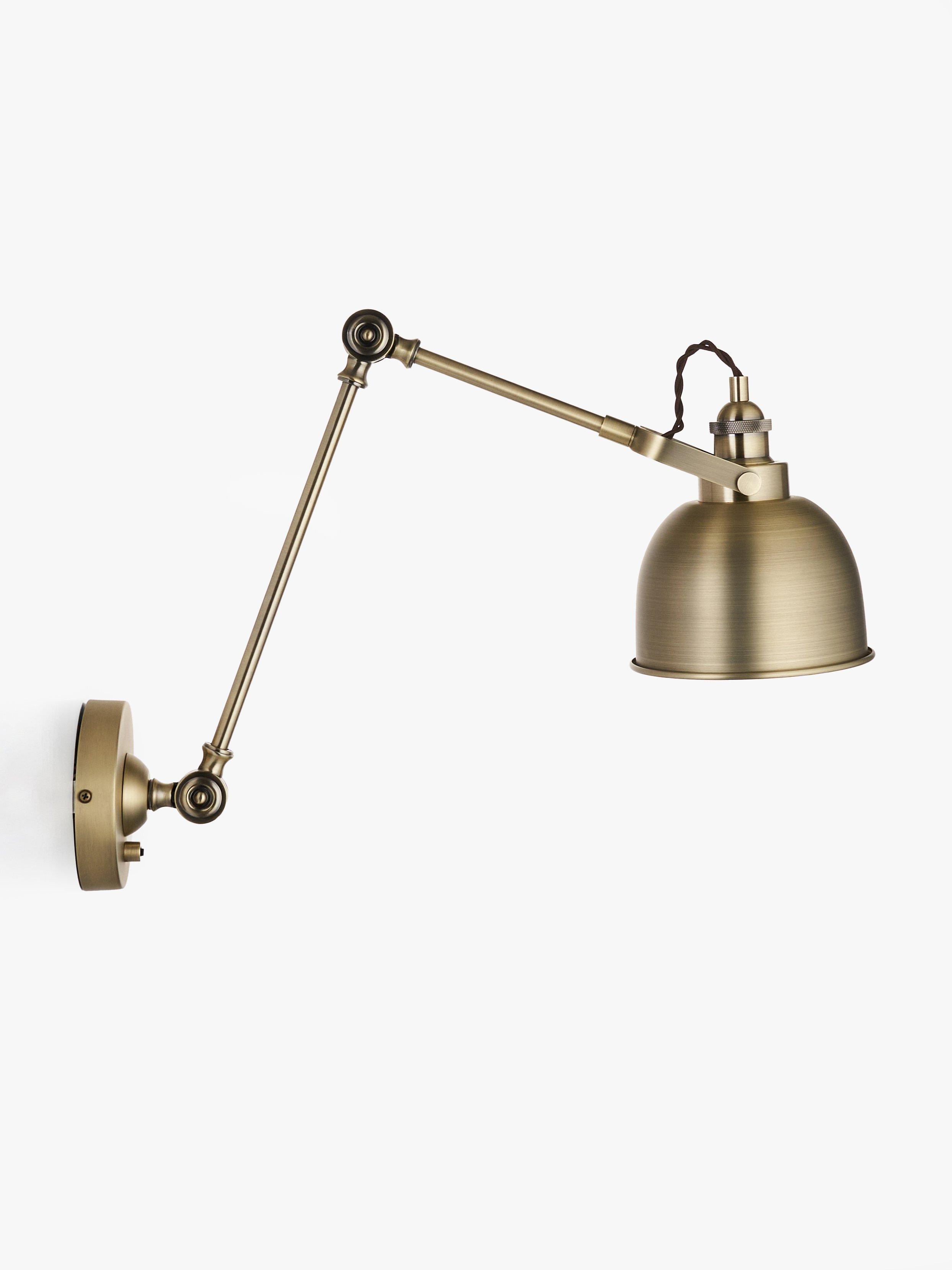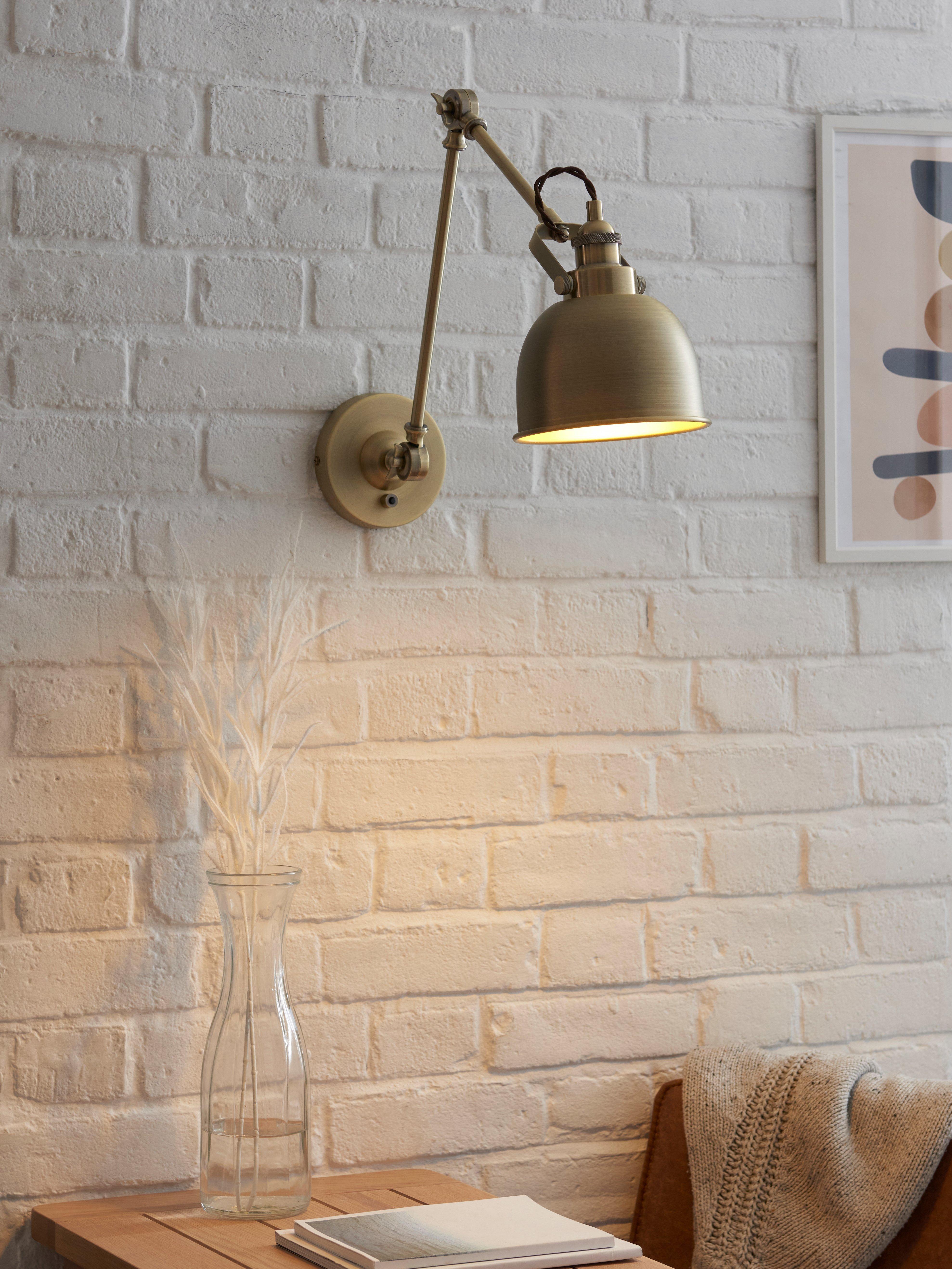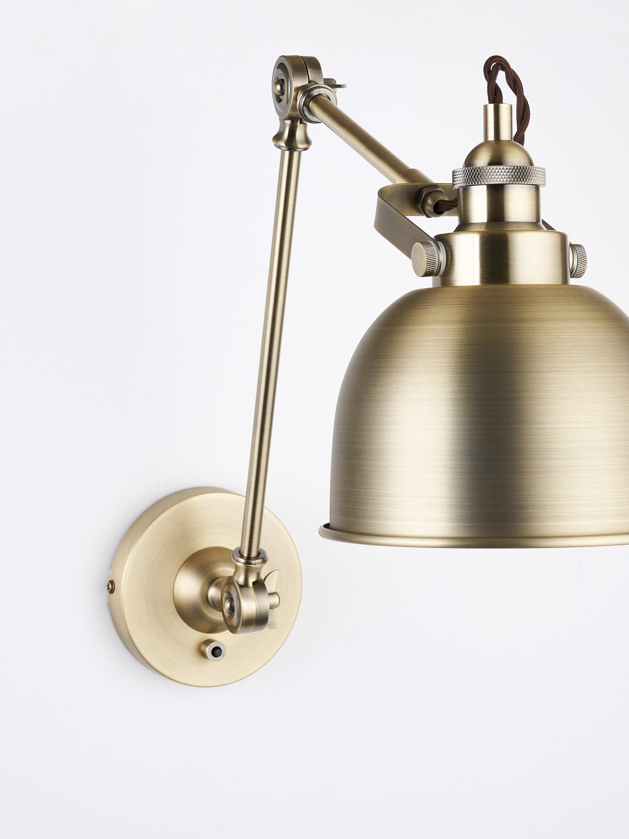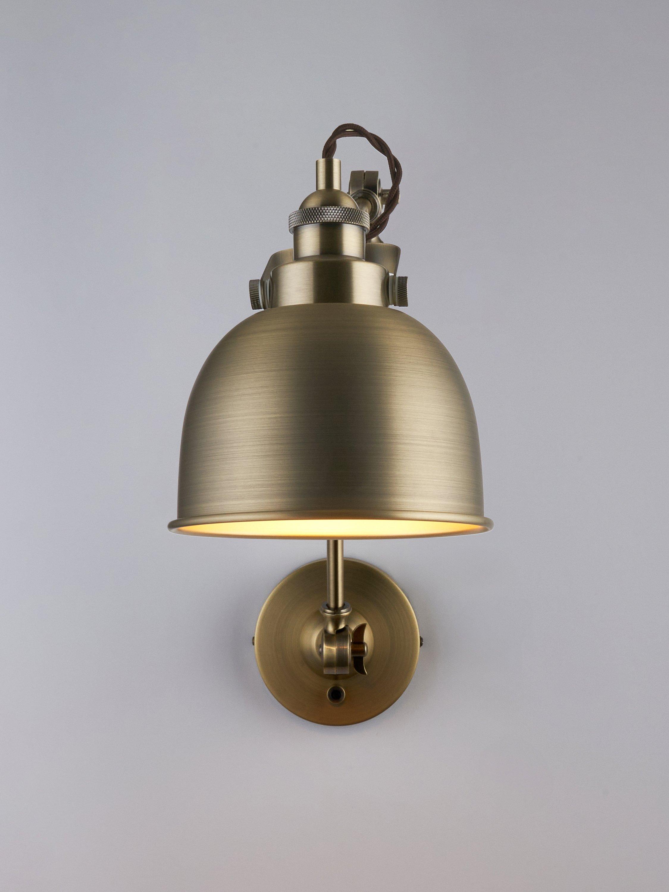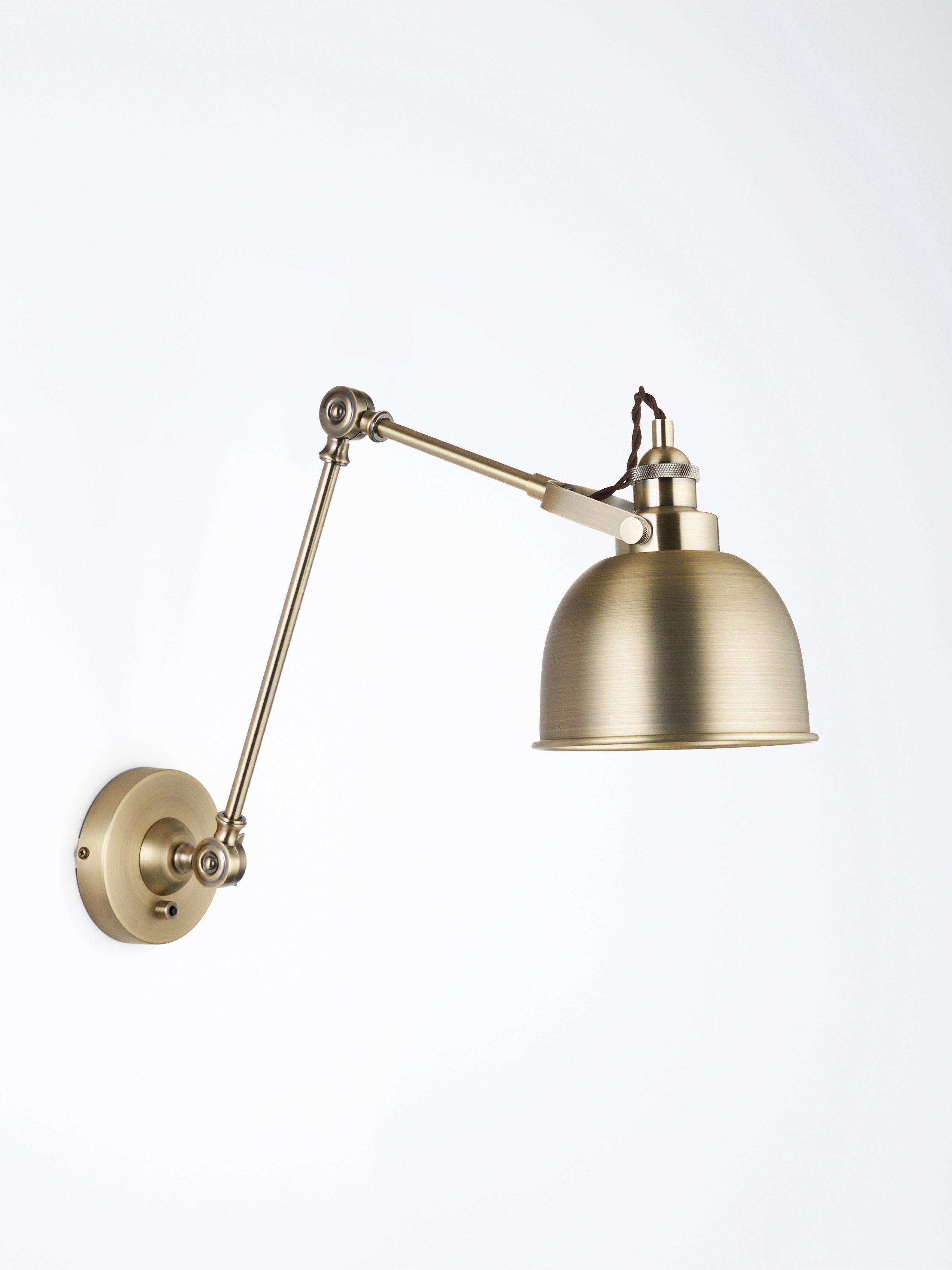 Adjustable wall light combining an extended arm with authentic restoration finishes. The dome-shaped shade, with its contrasting painted interior, beautifully softens the light cast, creating an inviting atmosphere.