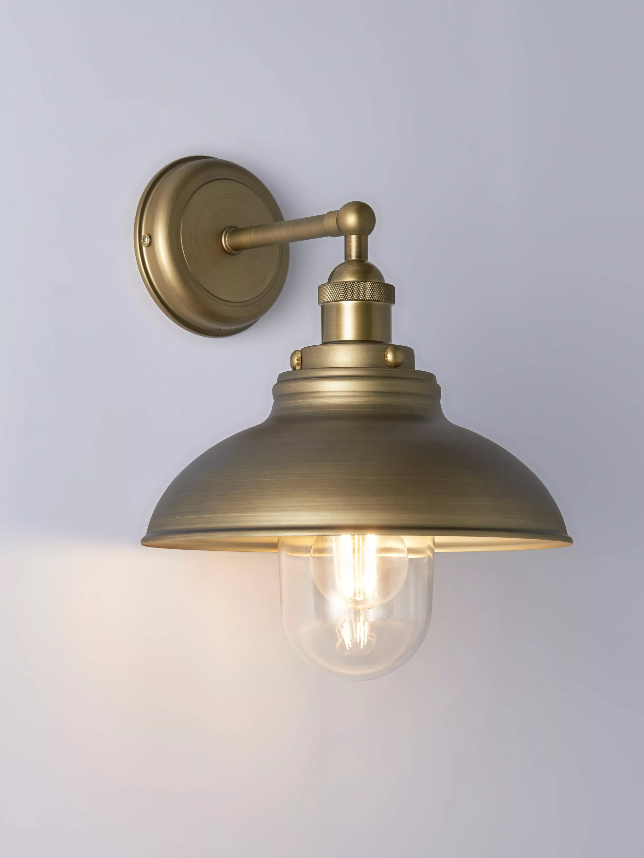 Our popular Baldwin light; fine-tuned specifically for outdoor use. Designed with a cool, industrial edge thanks to its mixed metal design and open dish shade. This IP44-rated wall fitting is ideal for porches or pathways, casting a warm and direct glow of light from the wall.
