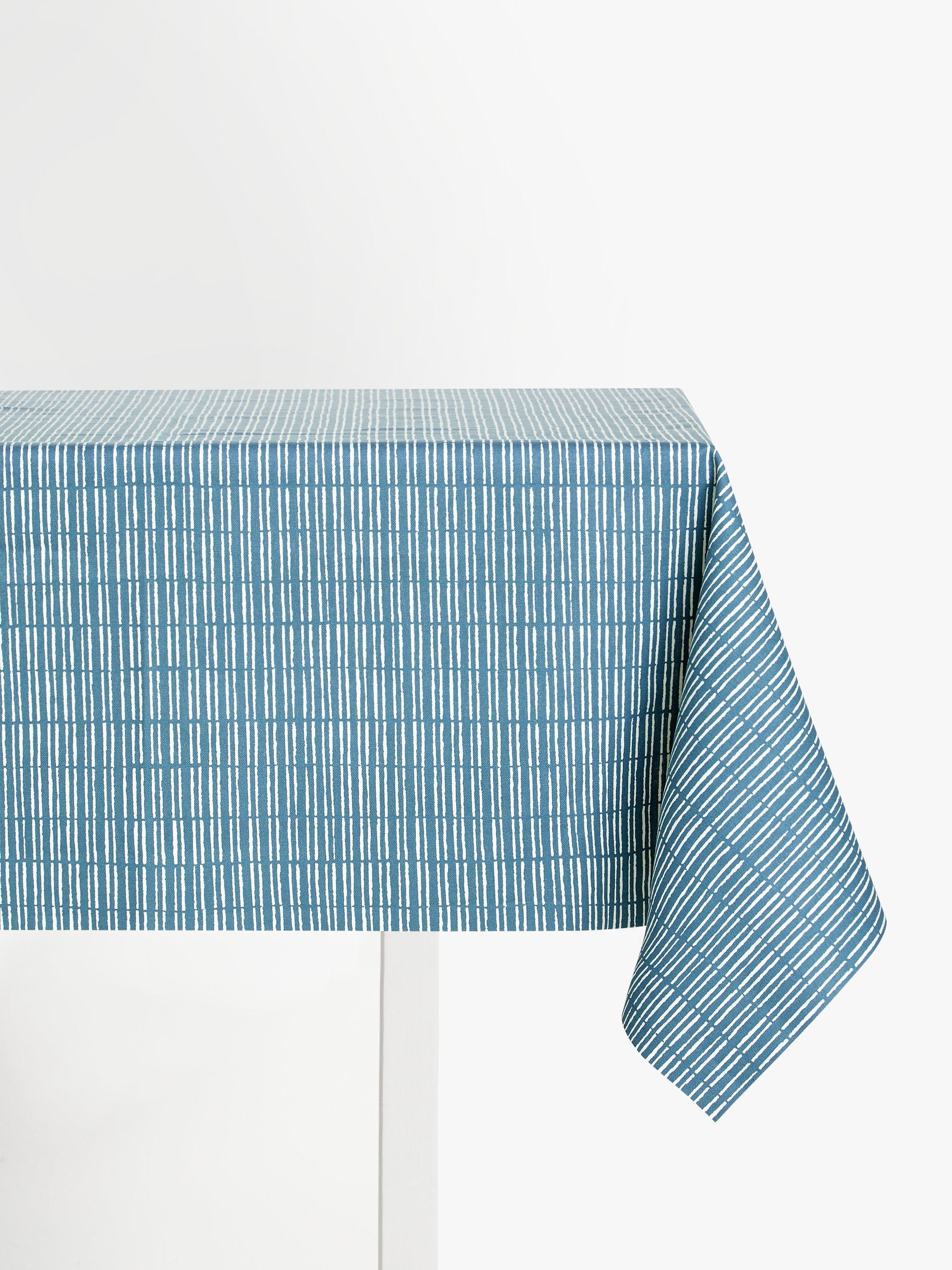 This fabric is ideal for use as a tablecloth as spills and mess can easily be cleaned with a damp cloth. If any liquids are spilt, it's a good idea to clean up straight away using a blotting action, as this is the most effective way to prevent the stain from seeping into the fabric. Daylight will also help minimise the look of any residual marks. Finally, be cautious of excessive heat which can damage the coating and look of the fabric. Always protect the tablecloth by using placemats and coasters.