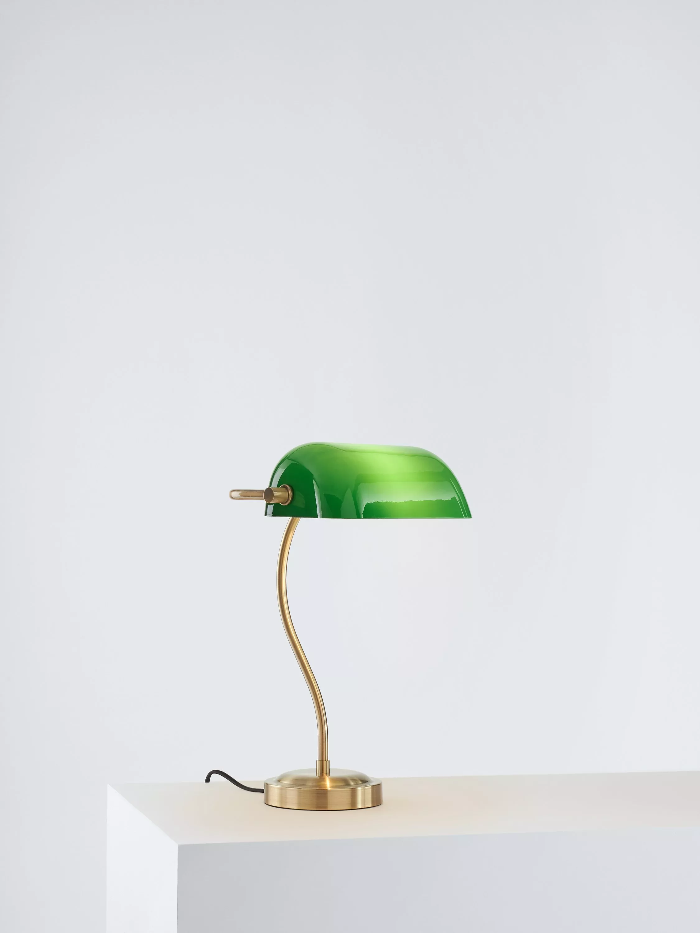A timeless bankers lamp to add to your home office. The metal base has an antique brass finish and the glass shade glows when illuminated.
