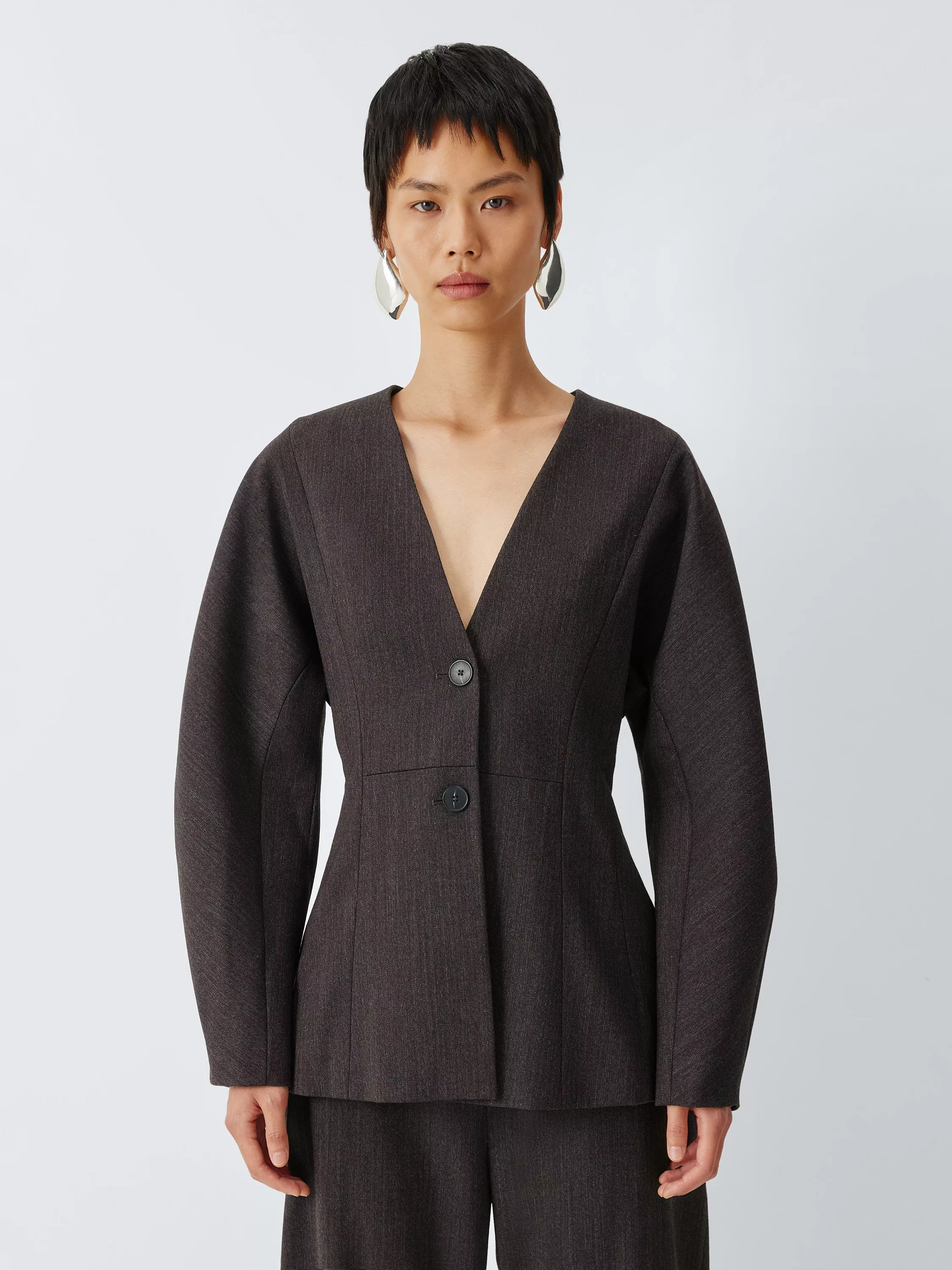 Woven from a woollen blend fabric, this tailored jacket has a fitted waist that allows the barrel-shaped sleeves to stand out. Lined for comfort, the jacket features two front buttons and a V-neckline. Pair it with the matching barrel-leg trousers.