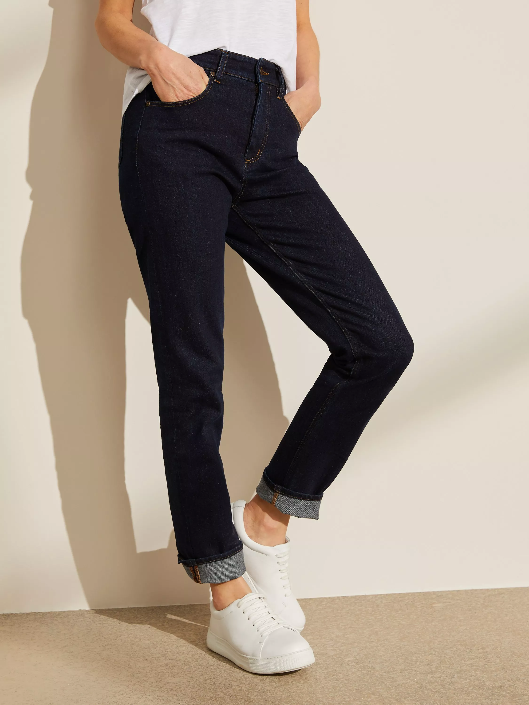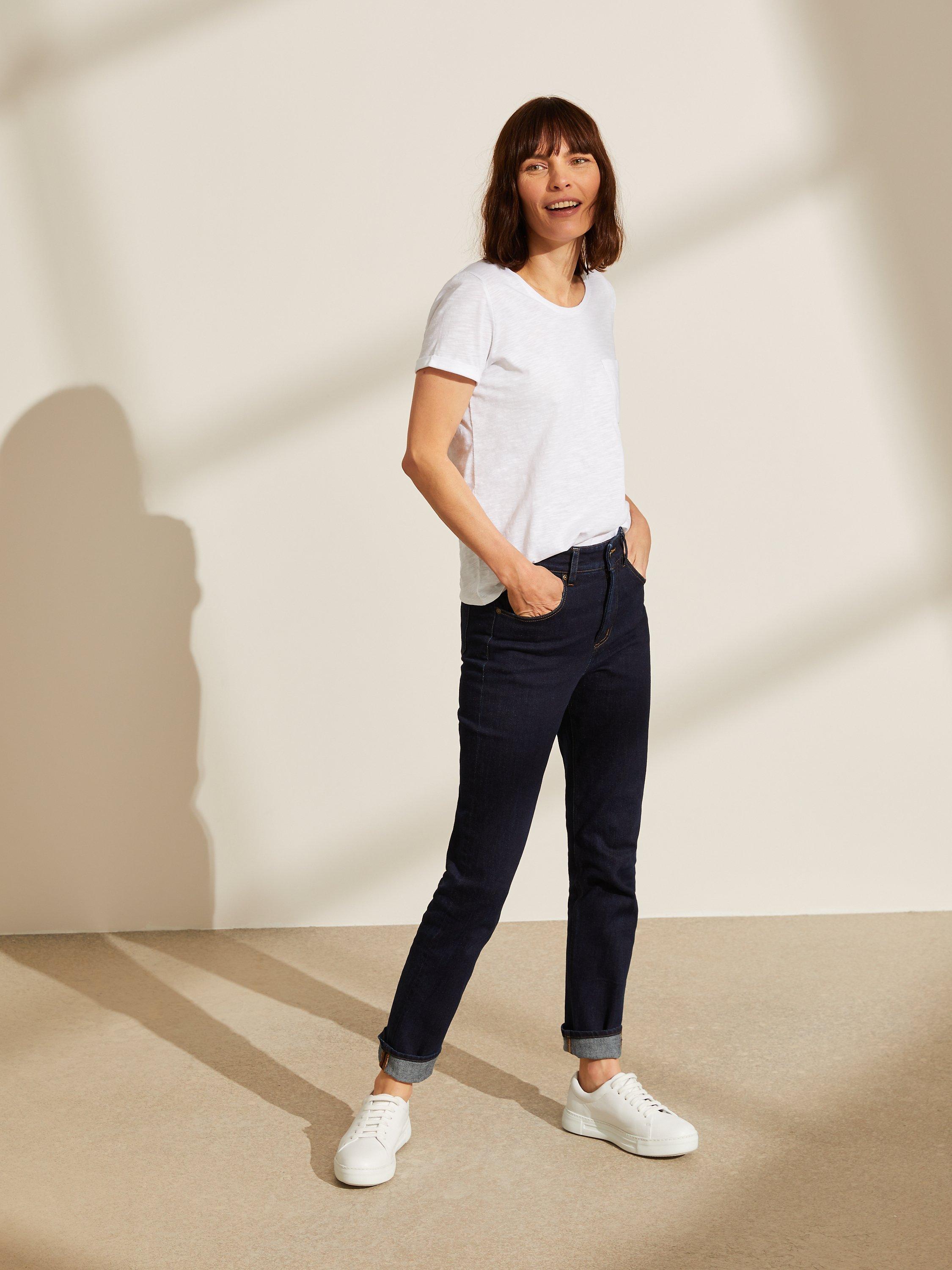 Formed in a straight leg, 5 pocket style, we've designed these jeans with pocket bags all the way across to front opening to help give a tummy hold fit. Slightly deeper at the waistband for a more comfortable, yet no less conventional fit, these casual essentials are perfect for everyday wear.