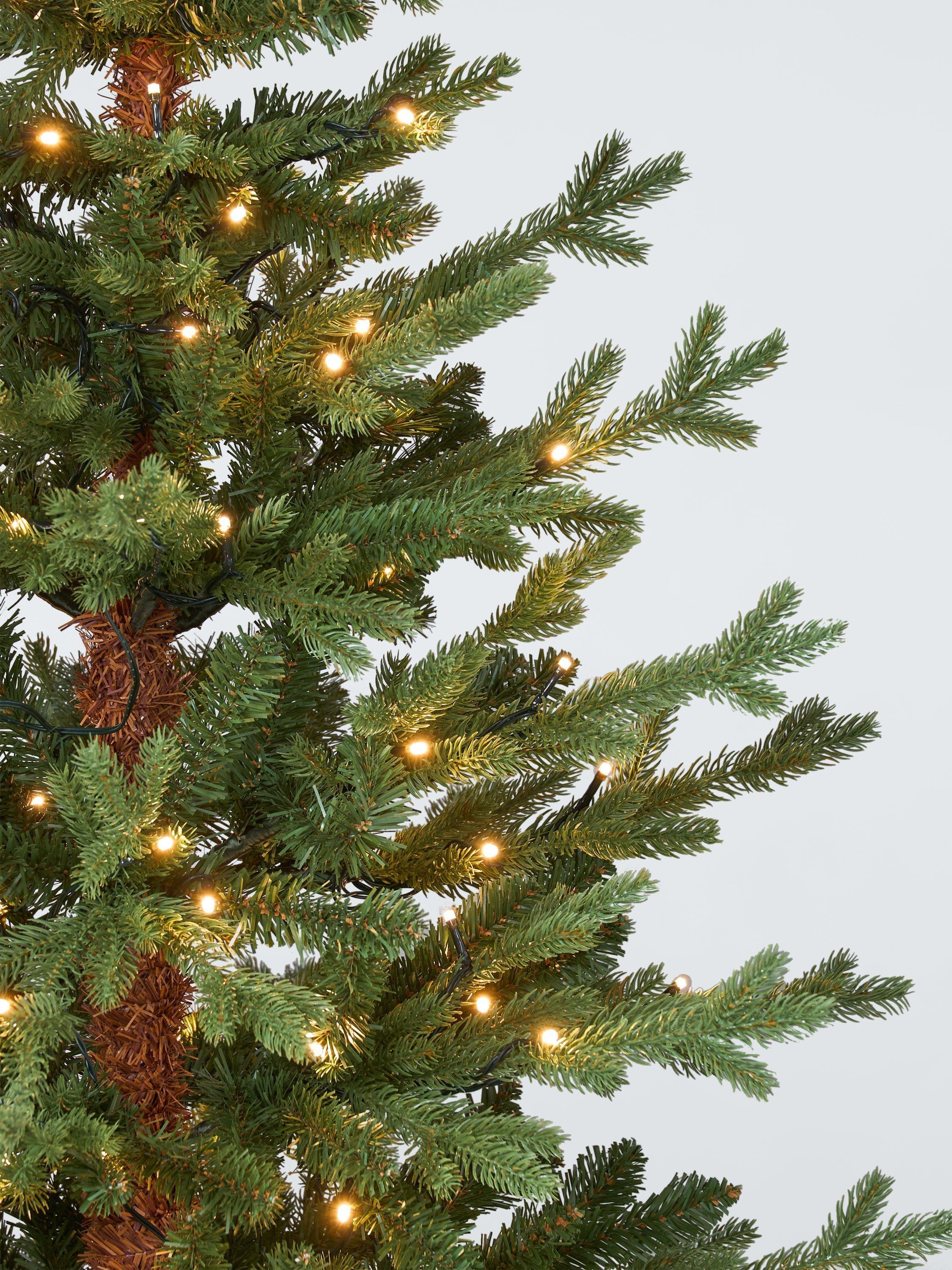An artificial Christmas tree with green branches and lit with 150 pure white LED lights. Mains lit, it can be used indoors or outdoors in a sheltered space, such as a covered porch.