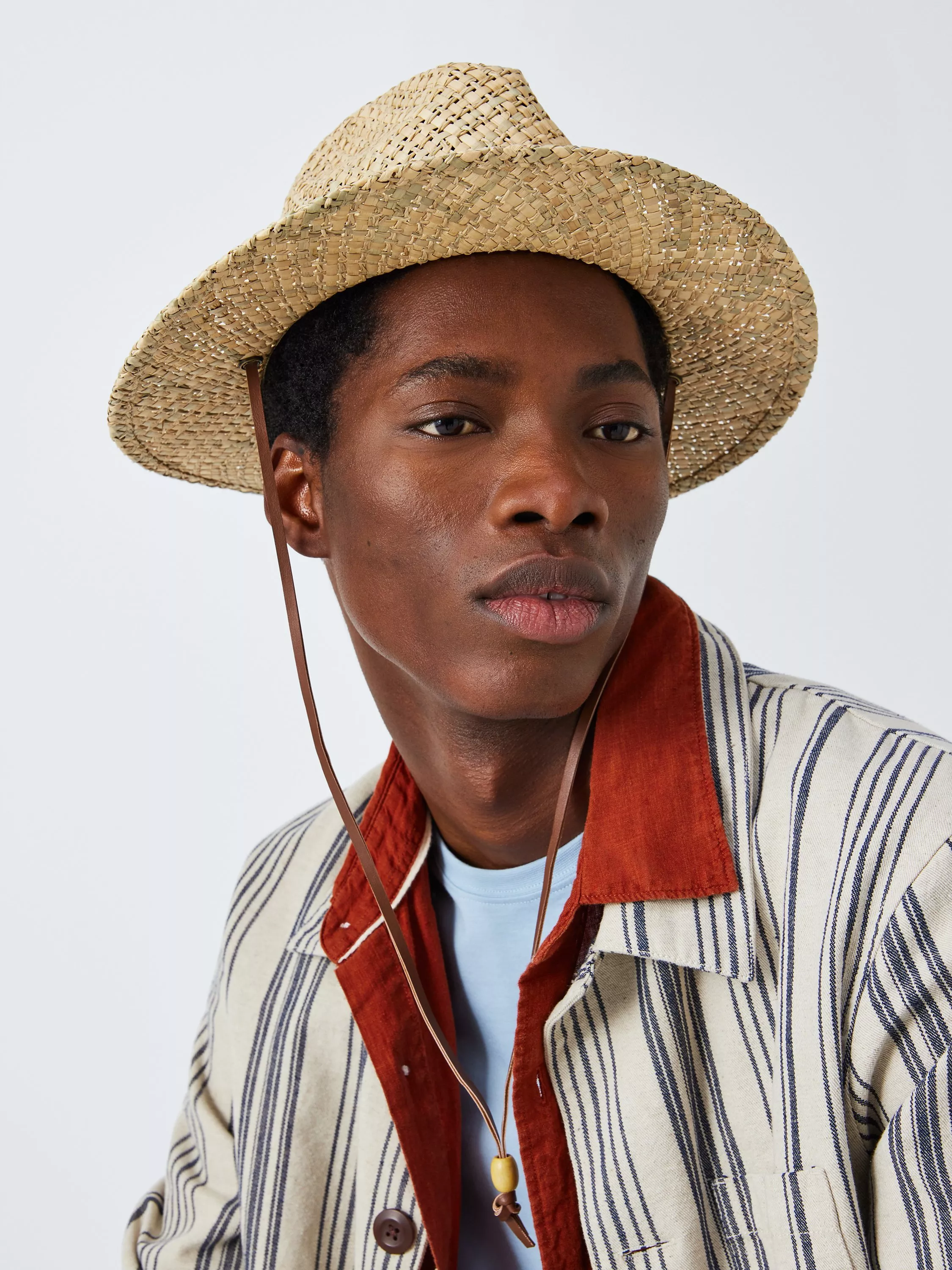 This basket weave Fedora hat brings the cool- literally. With a leather strap and toggle to tighten- it's a summer essential.