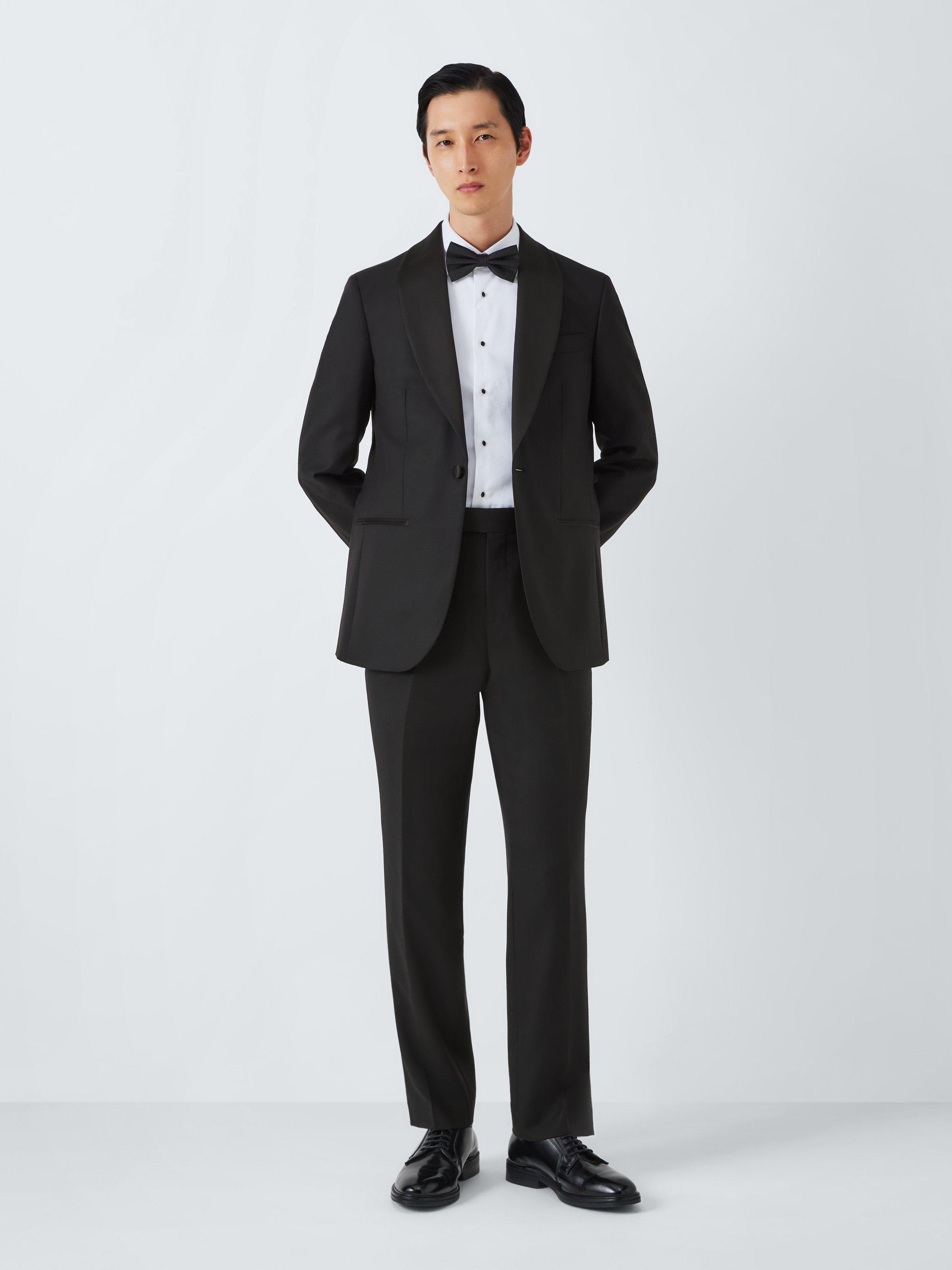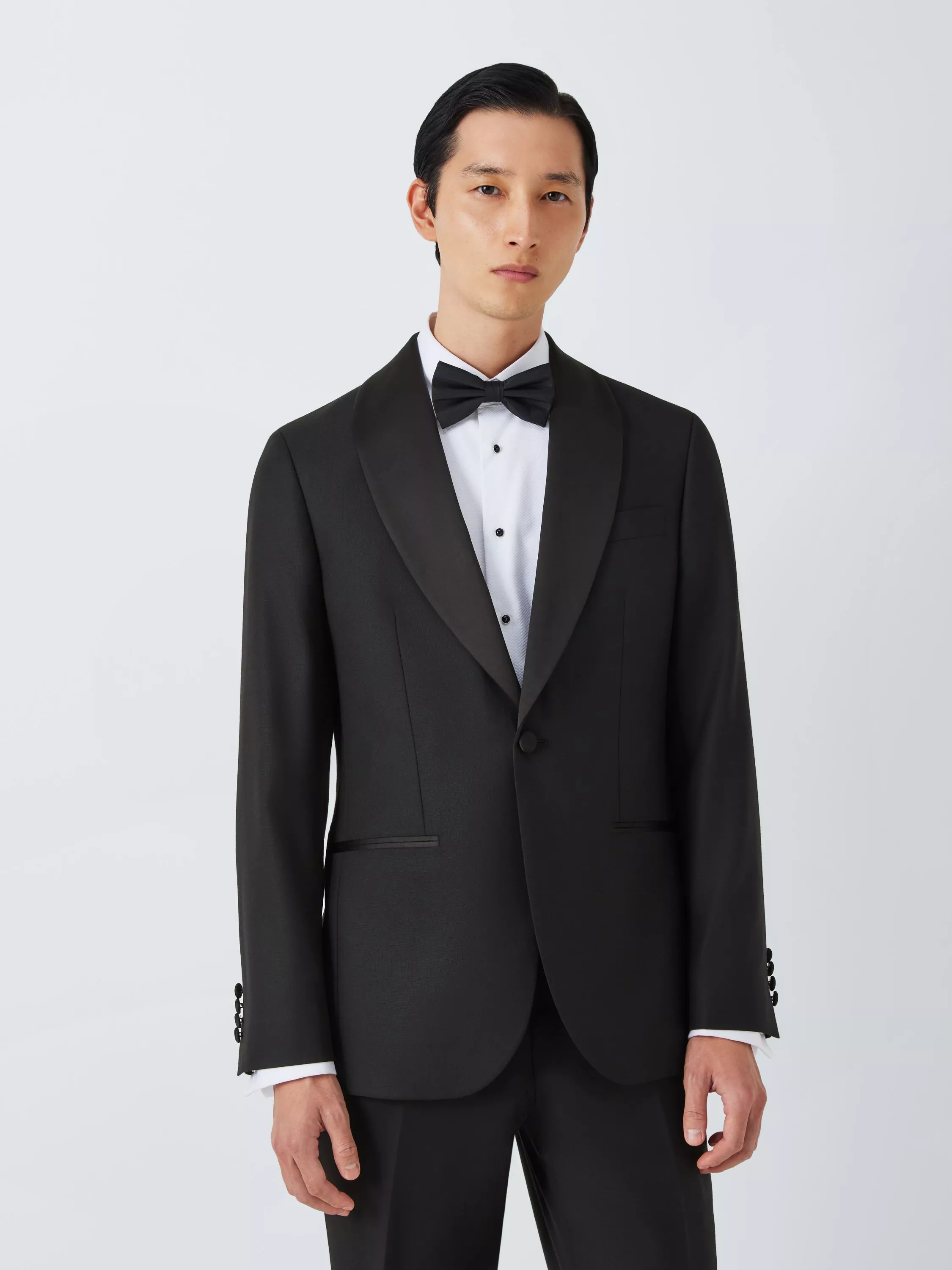 Woven in 100% wool in a basketweave design, our dinner suit jacket is styled with a contrast satin shawl lapel, satin jet pockets at the hip and a welt pocket at the chest.