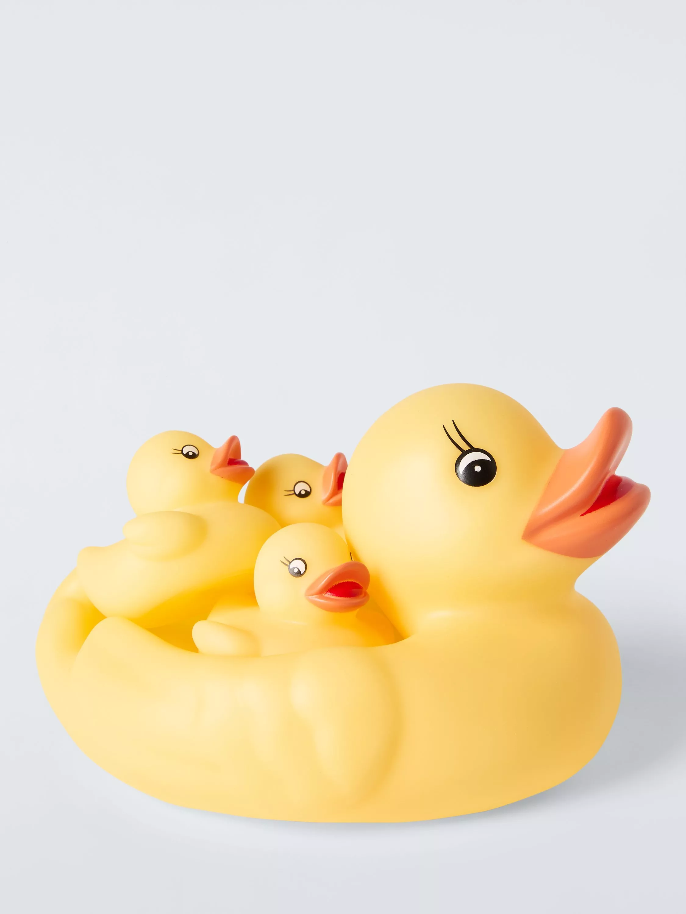 Baby's bath time wouldn't be the same without a floating toy or two. Here, an "adult" duck comes with three bobbing ducklings.