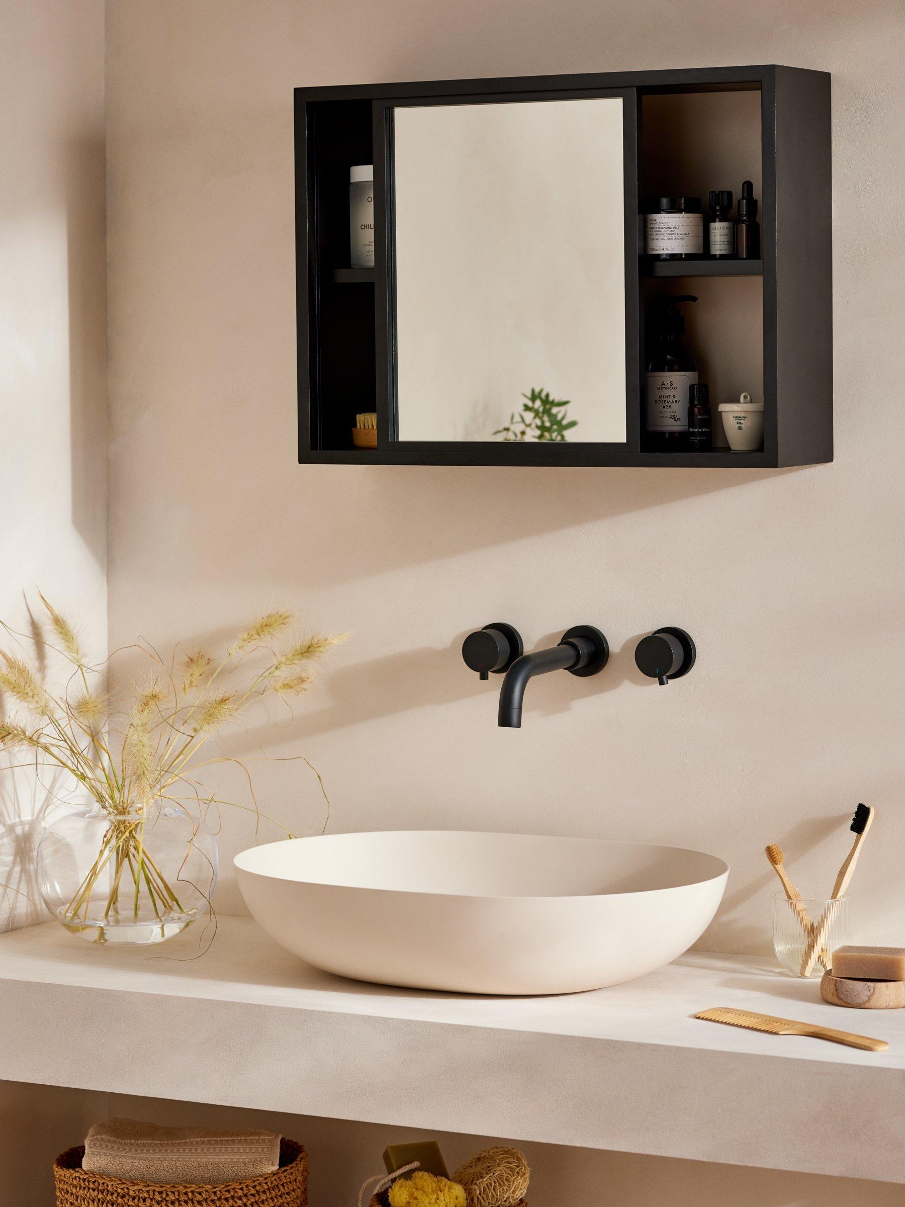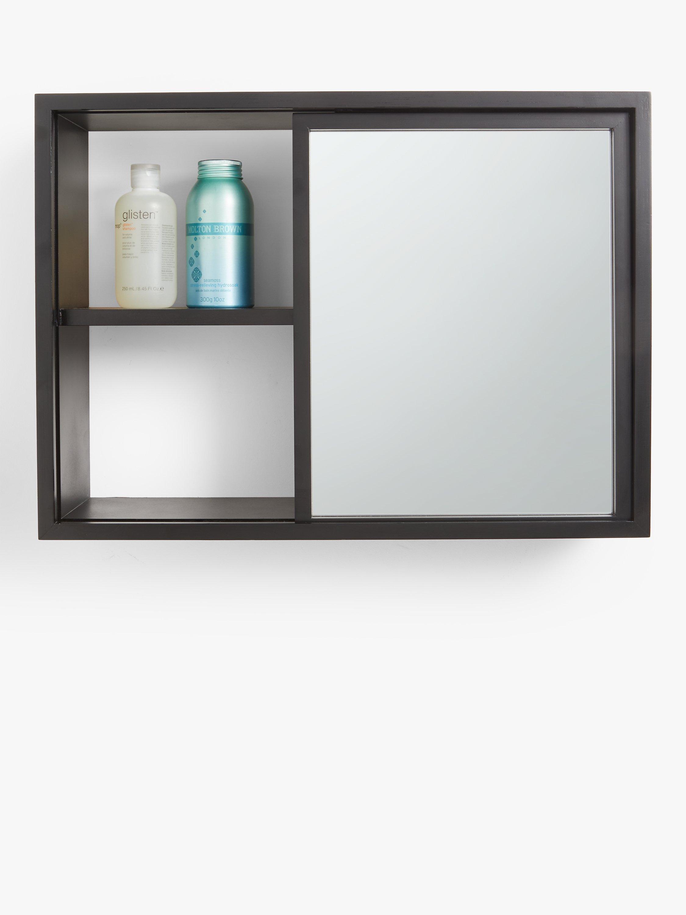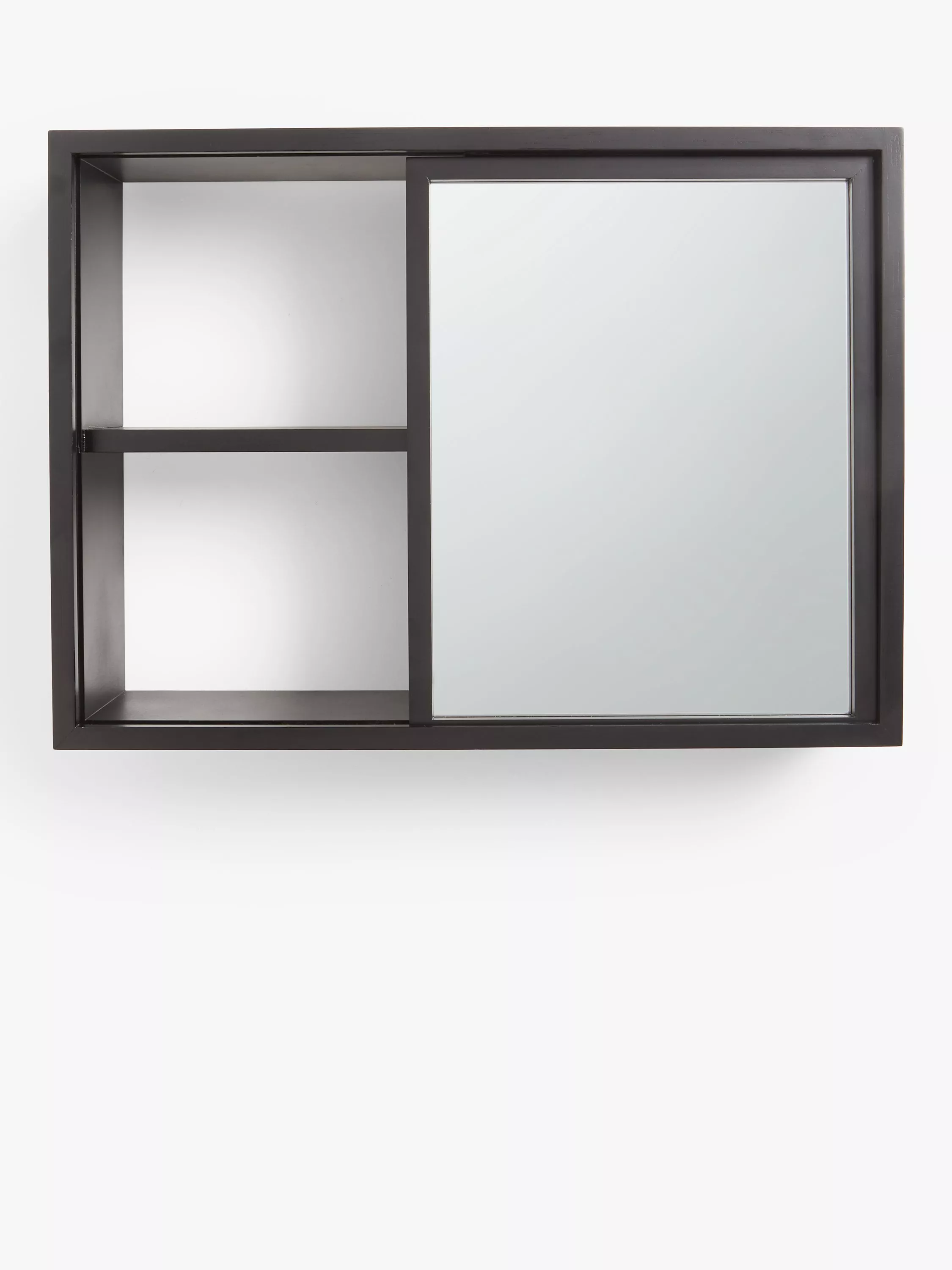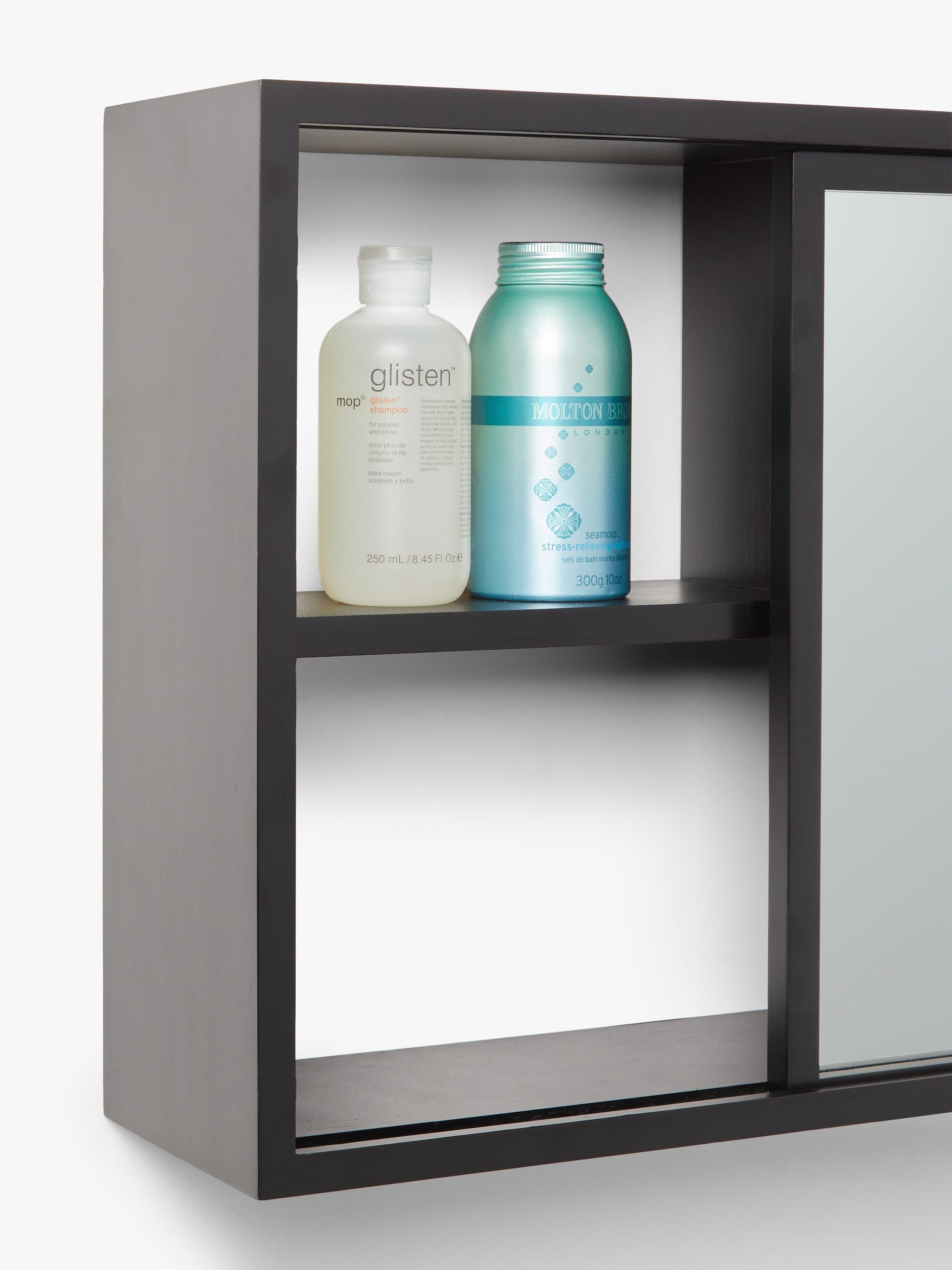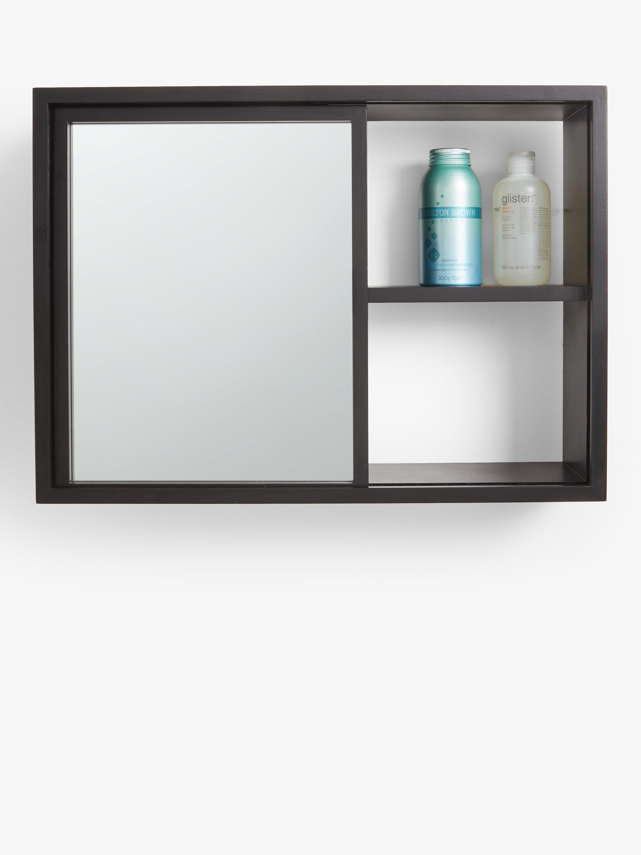 This is not quite a bathroom cabinet, but it's more than just a mirror. We've used bamboo to create a backless frame, and it's because it doesn't have a back that we wouldn't call it a cabinet. But the frame does have a fixed shelf to store your lotions, potions and accessories. At the front of the frame there's a sliding mirror so you can easily access the products you need whilst still getting a good look at yourself.
