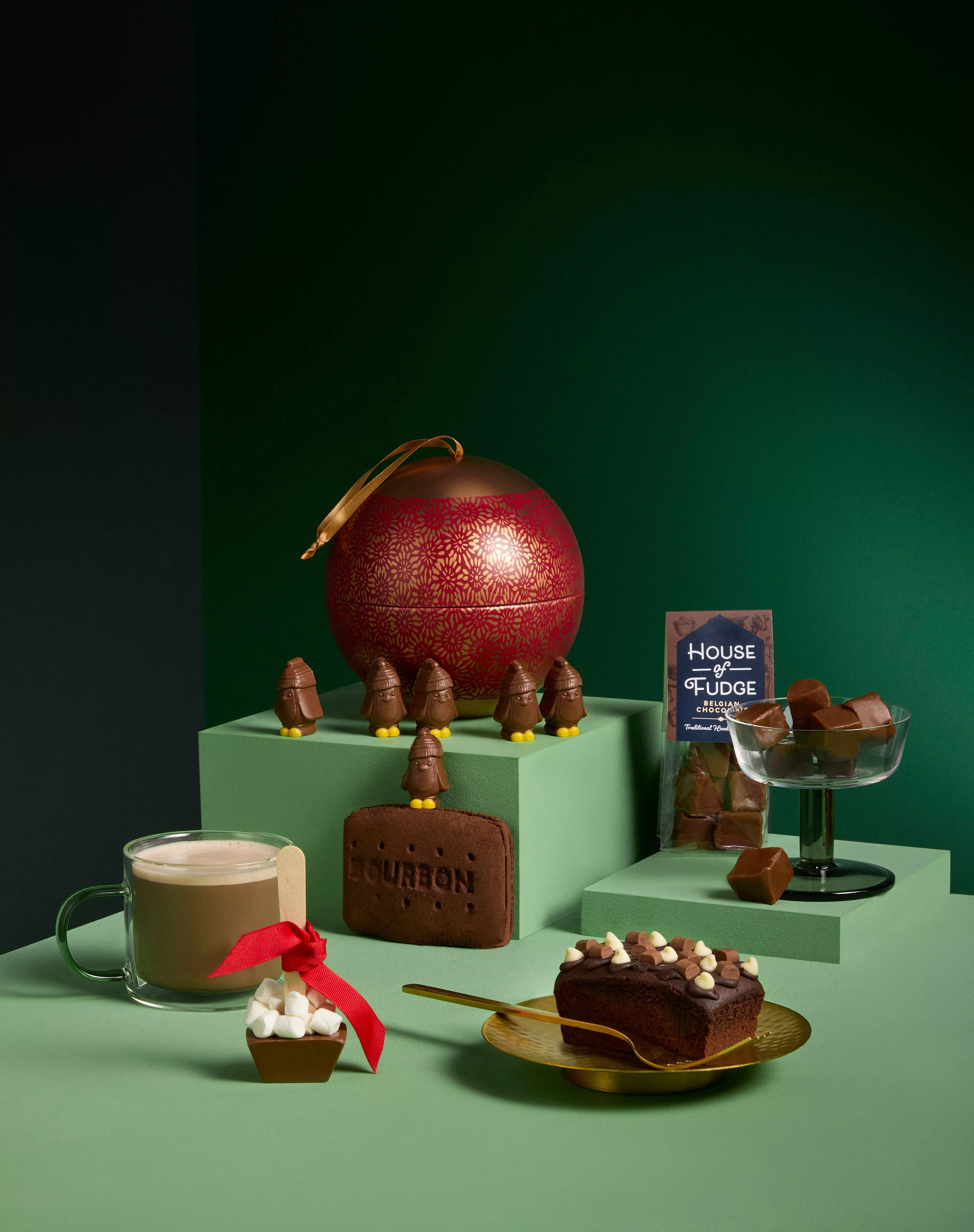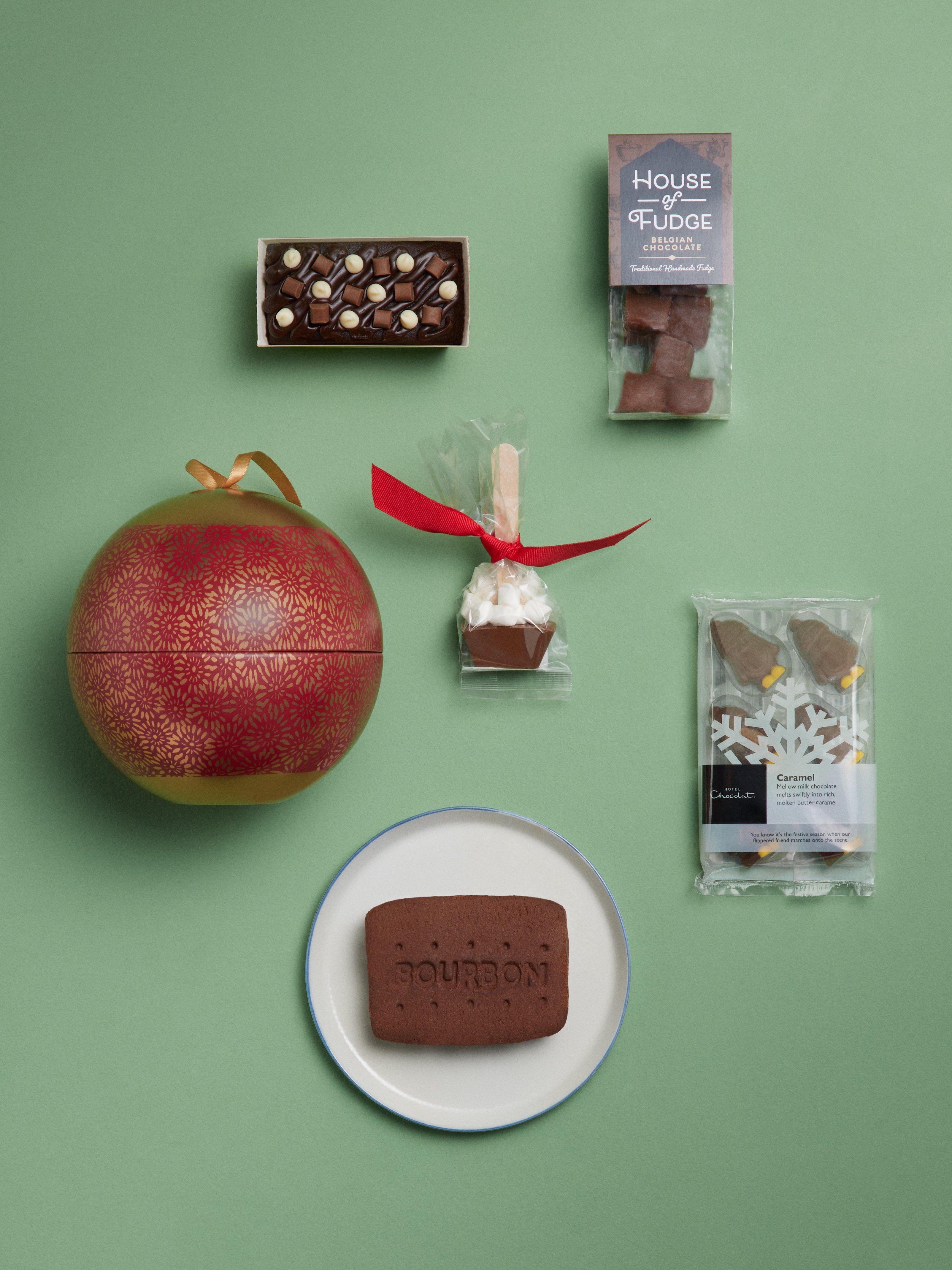 - House of Fudge Belgian Chocolate Fudge 100g: Sugar, Glucose Syrup, Sweetened Condensed MILK, Dark Chocolate (10%) (Cocoa Mass, Sugar, Cocoa Butter, Emulsifier: Lecithins (SOYA), Natural Vanilla Flavouring), Refined Vegetable Oil (Palm), Butter (MILK), Clotted Cream (MILK), Emulsifier: Lecithins (SOYA), Salt. Stas Hot Milk Chocolate Spoon with Marshmallows 30g: MILK Chocolate (Sugar, Whole MILK Powder, Cocoa Butter, Cocoa Mass, Emulsifier: Sunflower Lecithin, Natural Vanilla Flavouring), Coconut Oil, Mini Marshmallows (Glucose-Fructose Syrup, Sugar, Water, Gelatine, Anti-caking Agent: Maize Starch, Flavouring). Four Anjels Giant Bourbon Biscuit 85g: WHEAT Flour (WHEAT Flour, Calcium Carbonate, Iron, Niacin, Thiamin), Caster Sugar, Icing Sugar, Salted Butter (Butter (MILK), Salt), Margarine (Vegetable Oil (Palm, Rapeseed), Water, Salt, Emulsifier (Mono- and Diglycerides of Fatty Acids), Golden Syrup (Invert Sugar Syrup), Palm Oil, Fat reduced Cocoa Powder, Raising Agent (Sodium Hydrogen Carbonate). Hotel Chocolat Chocolate Caramel Penguins 65g: Ingredients: runny caramel (32%) (glucose fructose syrup, sweetened condensed MILK, half salted butter (from MILK), sugar, salt, emulsifier (SOYA lecithin)), cocoa solids (cocoa butter, cocoa mass), sugar, full cream MILK powder, butter oil (from MILK), emulsifier (SOYA lecithin), skimmed MILK powder, natural colour (carotene). MILK chocolate contains minimum 40% cocoa solids, minimum 20% MILK solids. For allergens, including cereals containing GLUTEN, see ingredients in BOLD. May contain treeNUTS, PEANUTS, GLUTEN, WHEAT, EGG, SESAME.. Maxwell & Franks Mini Chocolate Loaf with Milk & White Chocolate Chips 120g: Light Brown Sugar (Sugar, Cane Molasses, Invert Sugar Syrup), Whole EGG, Margarine (Vegetable Oils (Palm, Rapeseed), Salt, Citric Acid), Fortified WHEAT Flour (WHEAT Flour, Calcium Carbonate, Niacin, Iron, Thiamine), Glucose Syrup (derived from WHEAT), Dark Chocolate Chips (10%) (Sugar, Cocoa Mass, Cocoa Butter, Emulsifier: SOYA Lecithin, Natural Vanilla Flavouring), Vegetable Glycerine (Rapeseed Oil), Fat Reduced Cocoa Powder, Dark Chocolate Icing [Sugar, Vegetable Oil (Rapeseed, Palm), Glucose Syrup (derived from WHEAT), Fat Reduced Cocoa powder, Emulsifiers (Monoand Diglycerides of Fatty Acids (Palm Oil), SOYA Lecithin), Salt, Preservative (Potassium Sorbate), Natural Flavouring], MILK Chocolate chunks (3%)(Sugar, Whole MILK Powder, Cocoa Butter, Cocoa Mass, Whey Powder (MILK), Skimmed MILK Powder, Emulsifier: SOYA Lecithin, Natural Vanilla Flavouring), White Chocolate Chips (3%) (Sugar, Cocoa Butter, Full Cream MILK Powder, Whey Powder (MILK), Vegetable Oils (Blend of Palm, Sal, Shea and Mango Kernels), Emulsifier: SOYA Lecithin, Vanilla Flavouring), Raising Agent Diphosphates, Sodium Carbonates, Fortified WHEAT Flour, Calcium Carbonate, Iron, Niacin, Thiamine)), Preservative (Potassium Sorbate). For allergens, see ingredients in capitals.