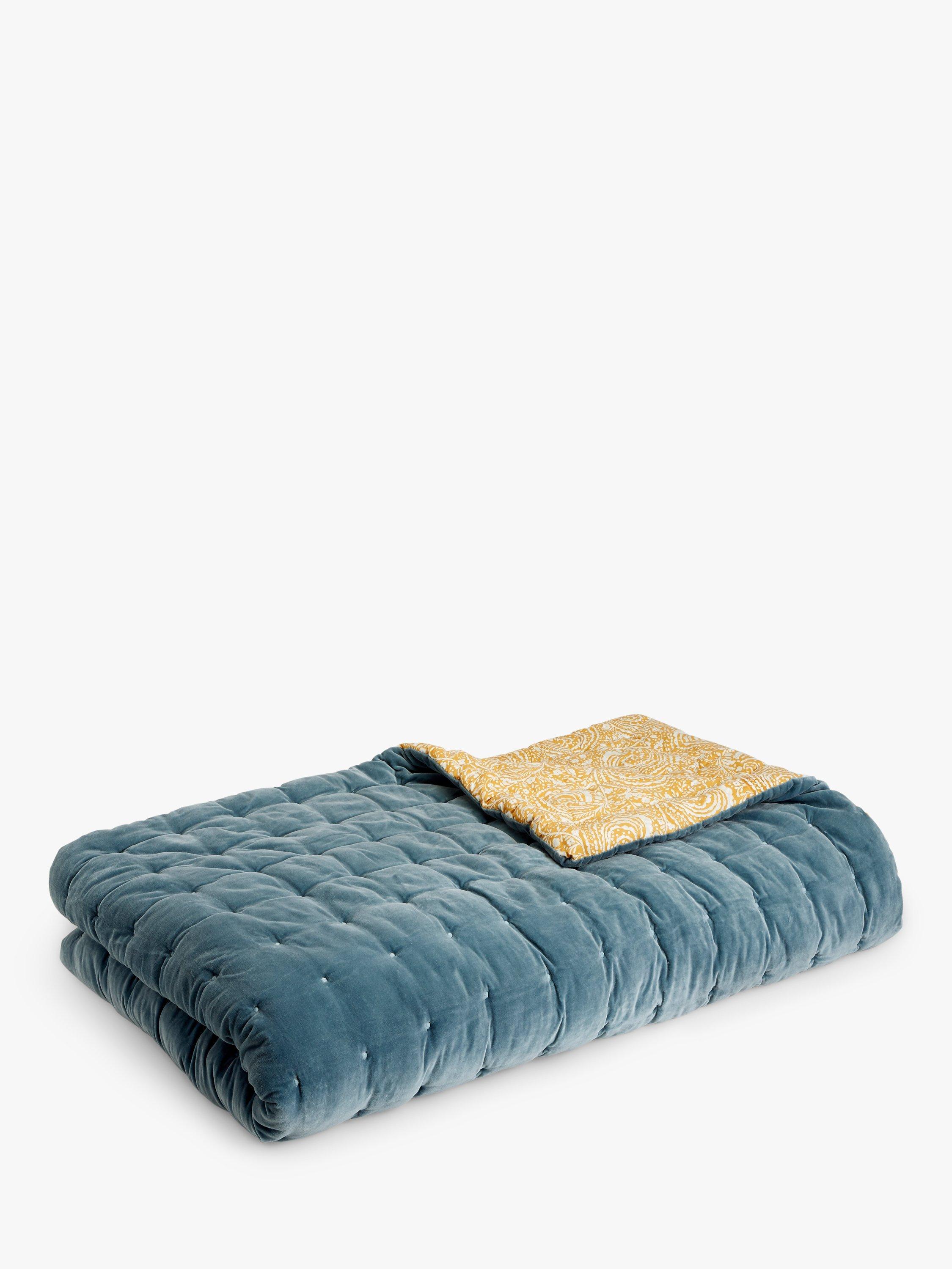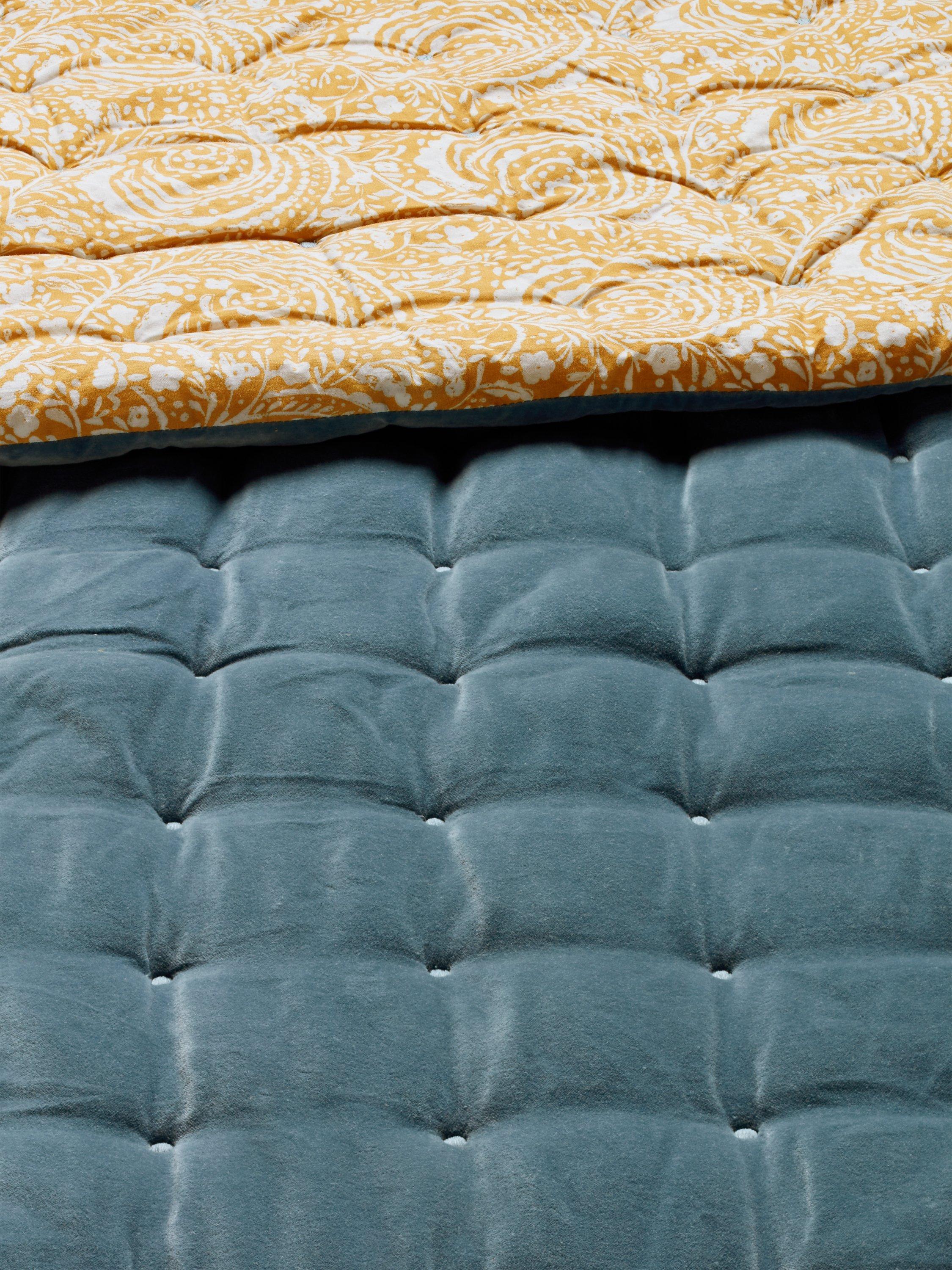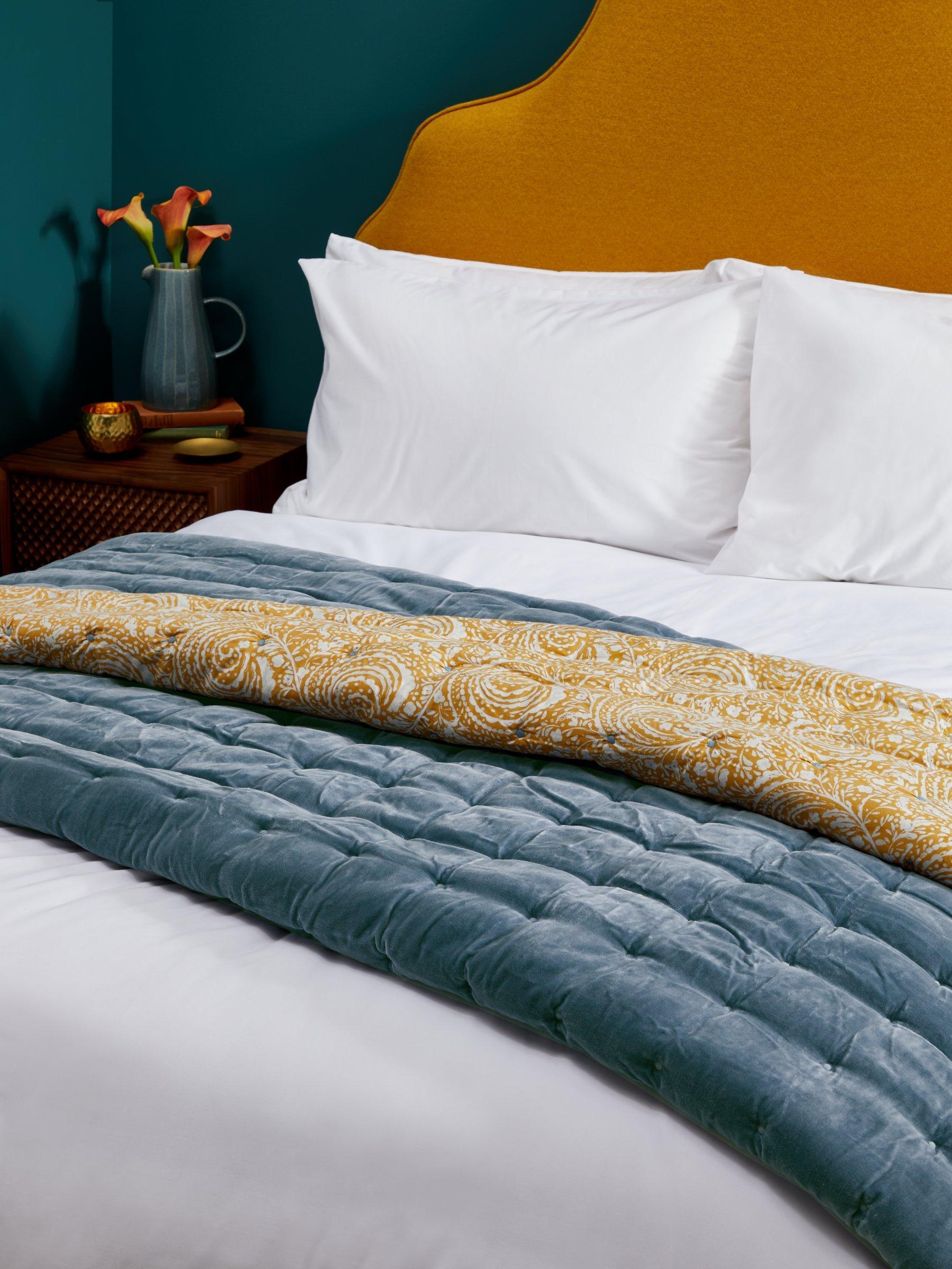 This cosy, hand-quilted bedspread has a cotton velvet front and a vibrant swirl pattern on the back for colourful contrast.