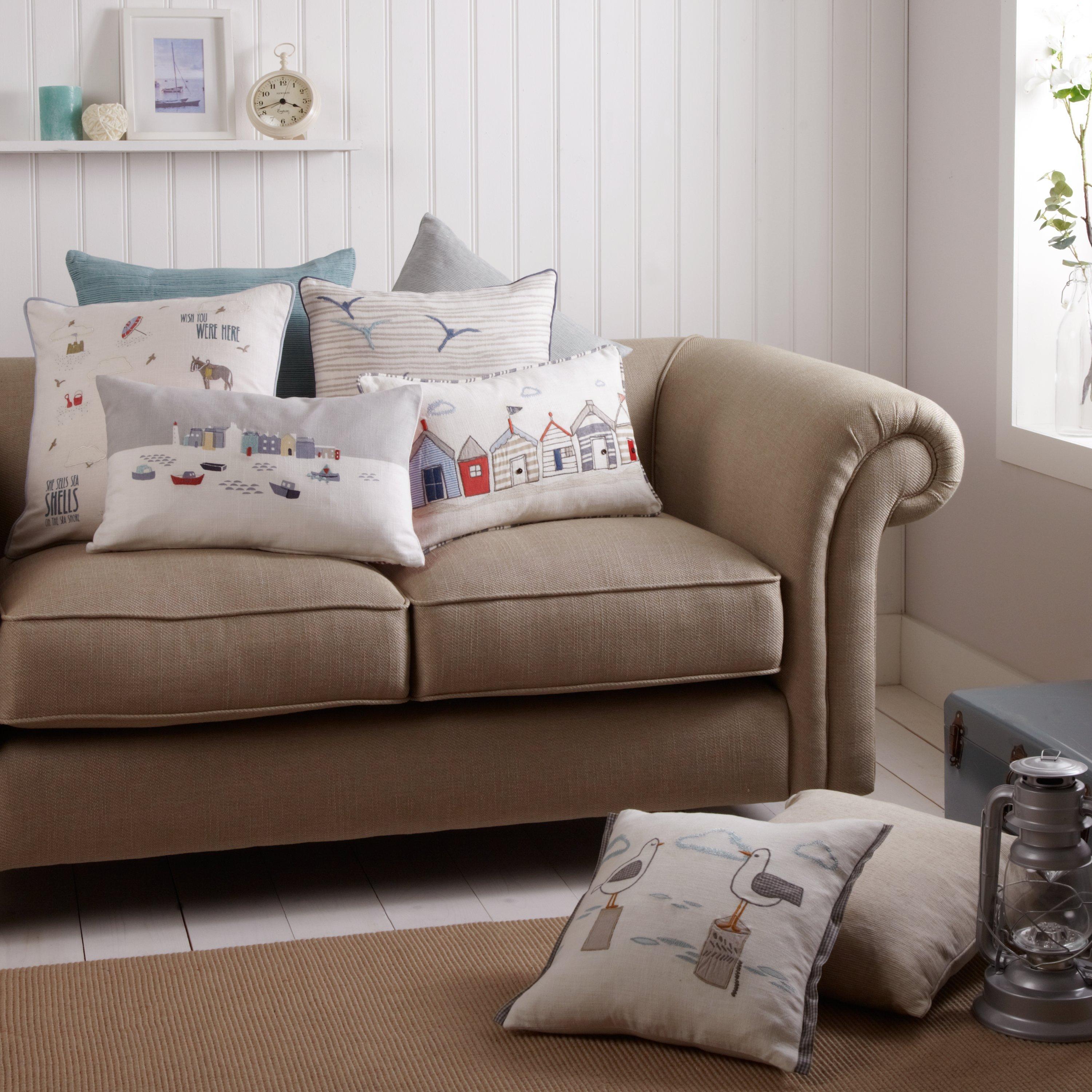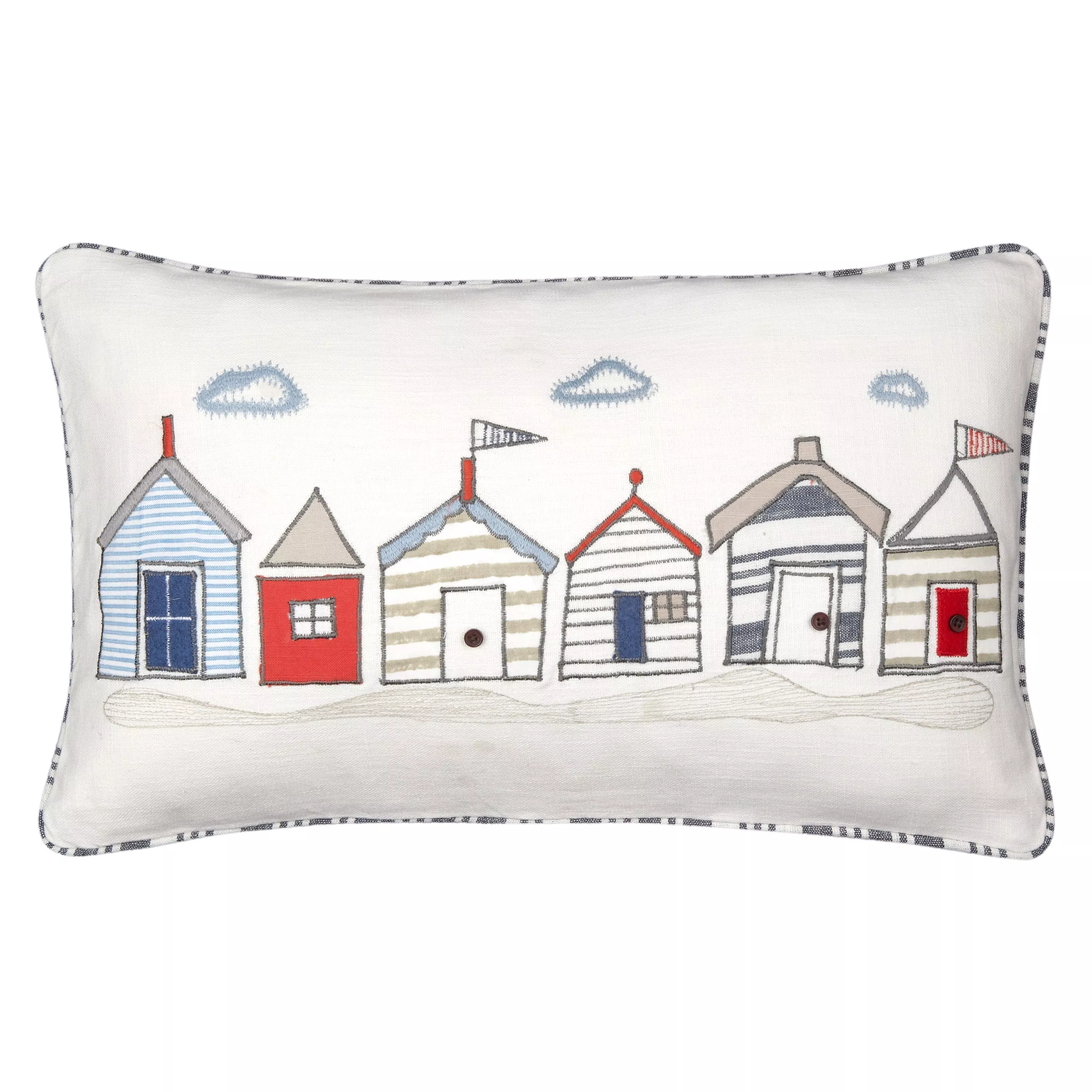 We love this cushion's cute collage feel because it puts us in mind of cotton wool clouds and day trips to the seaside. Each higgledypiggledy beach hut is charmingly embellished with a variety of detailed embroidery and playful, bobbly buttons.