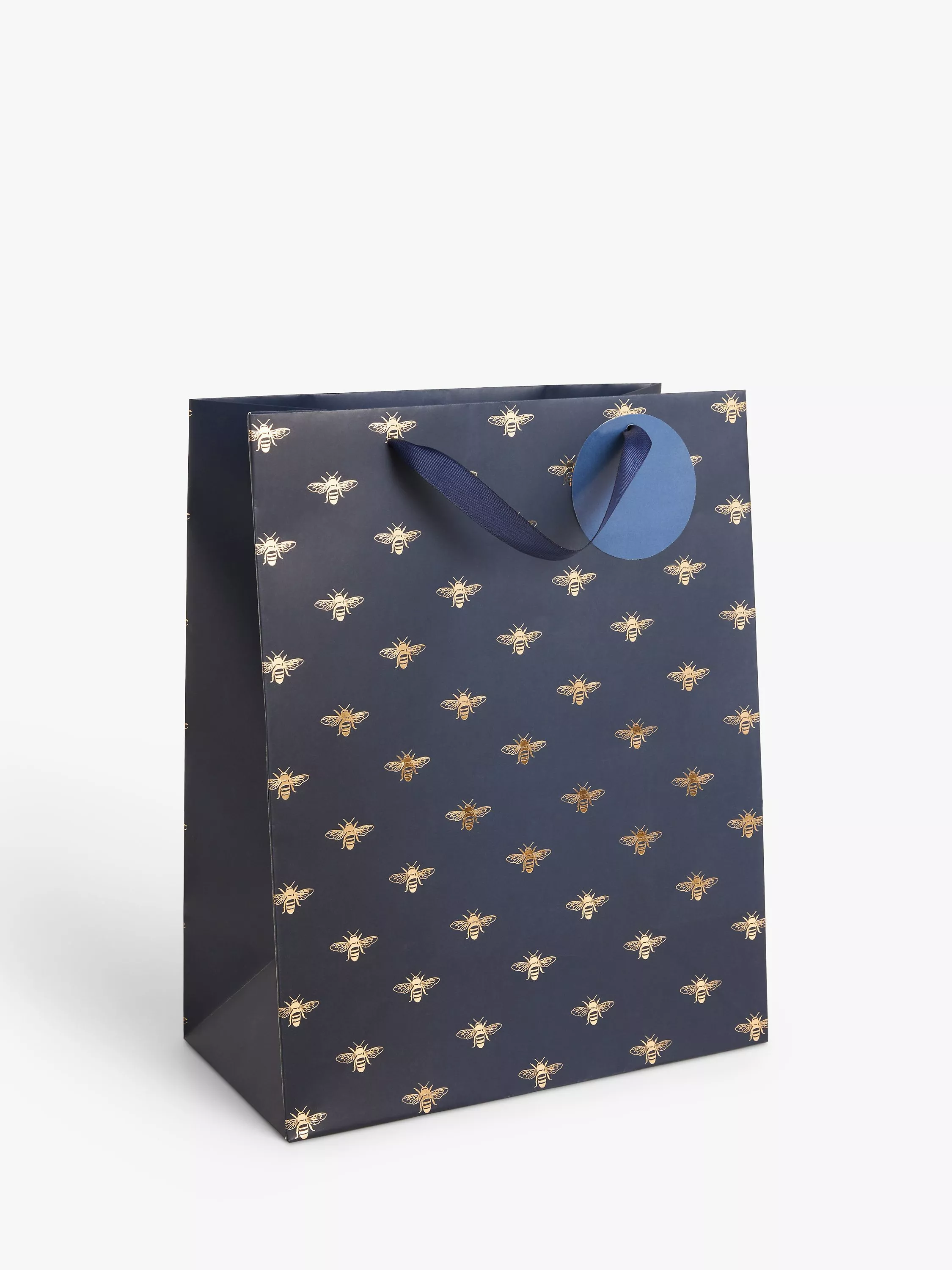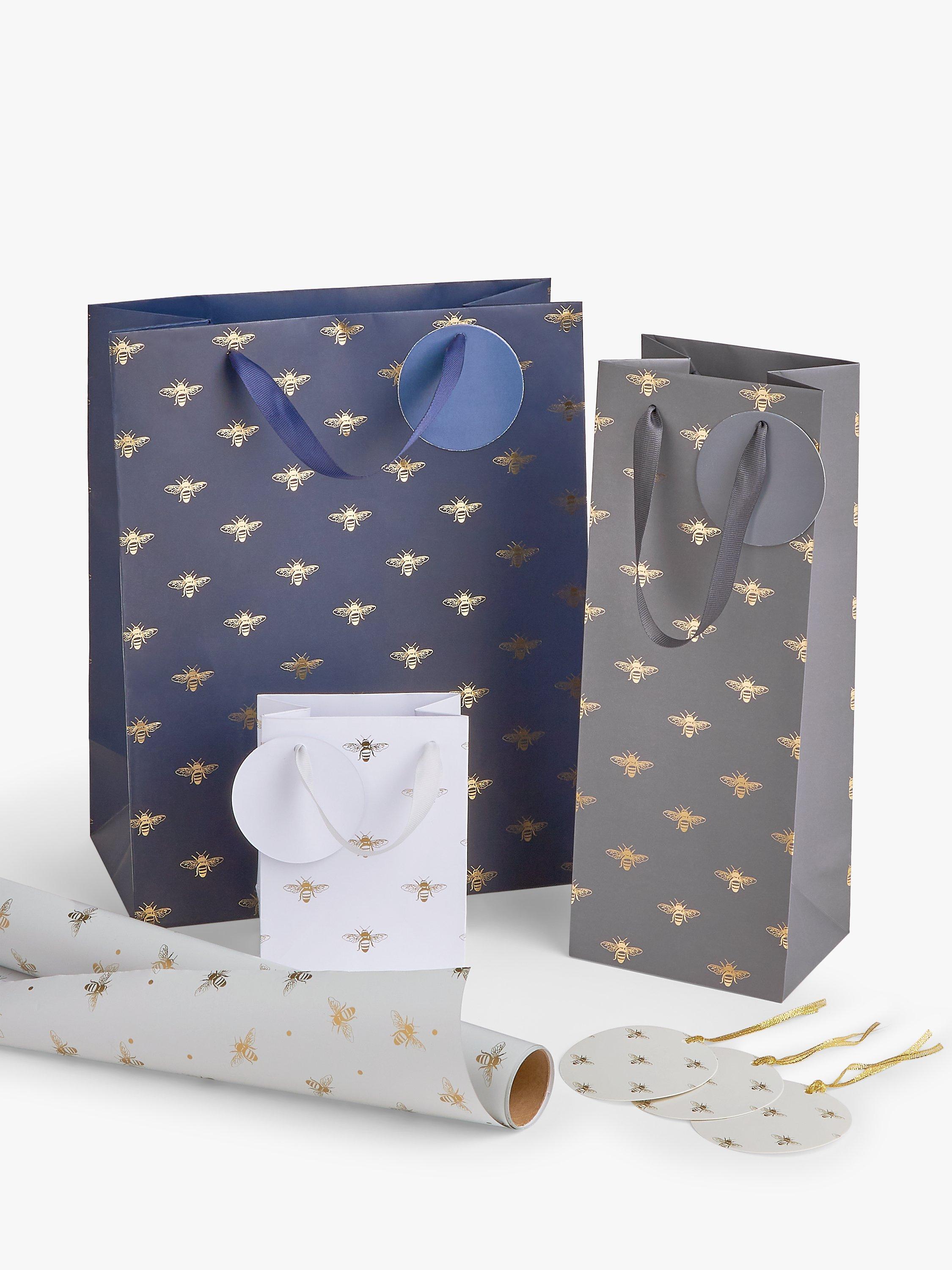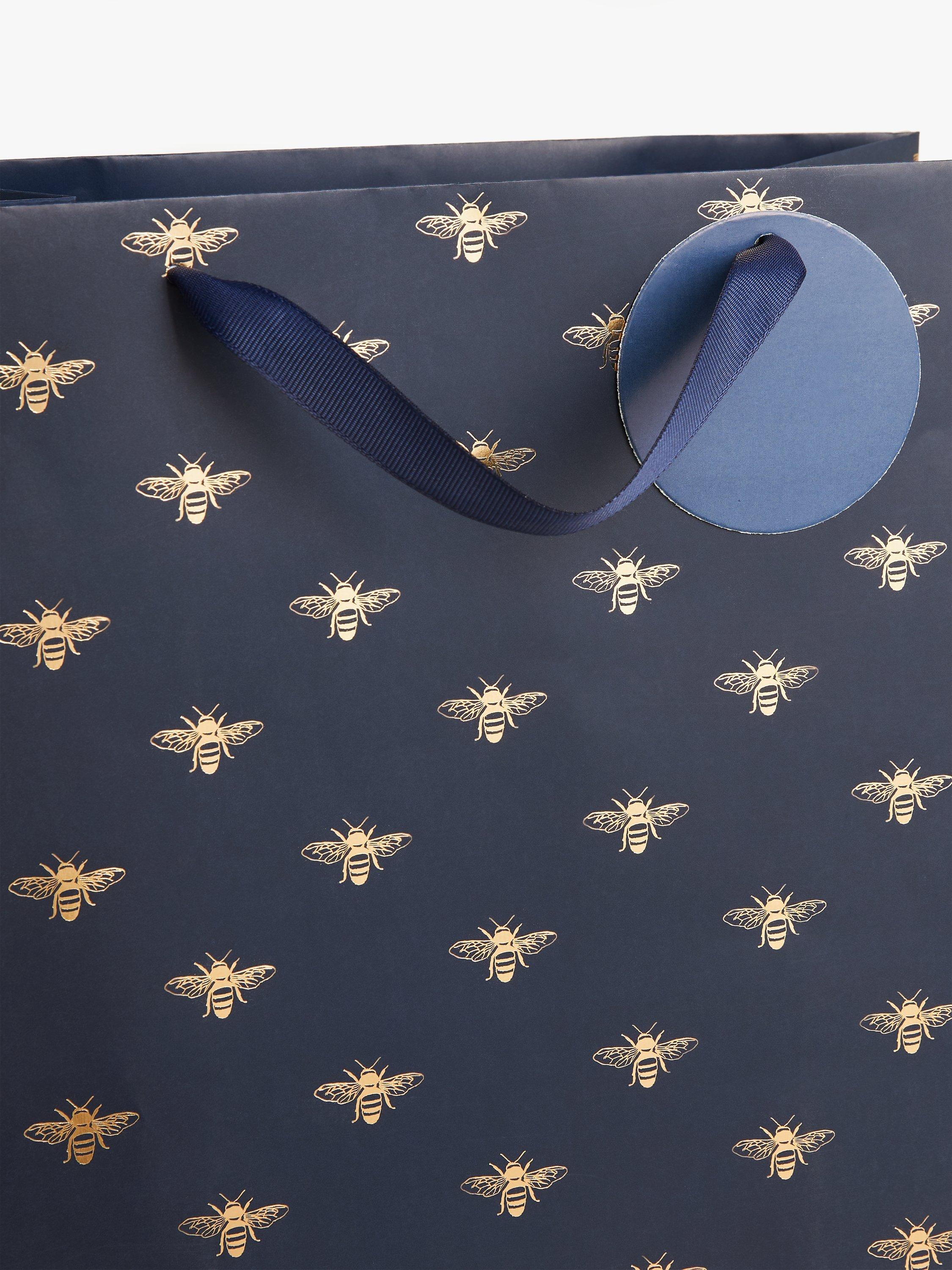 A bottle gift bag with a beautiful bee print, ribbon handles, and matching gift tag.