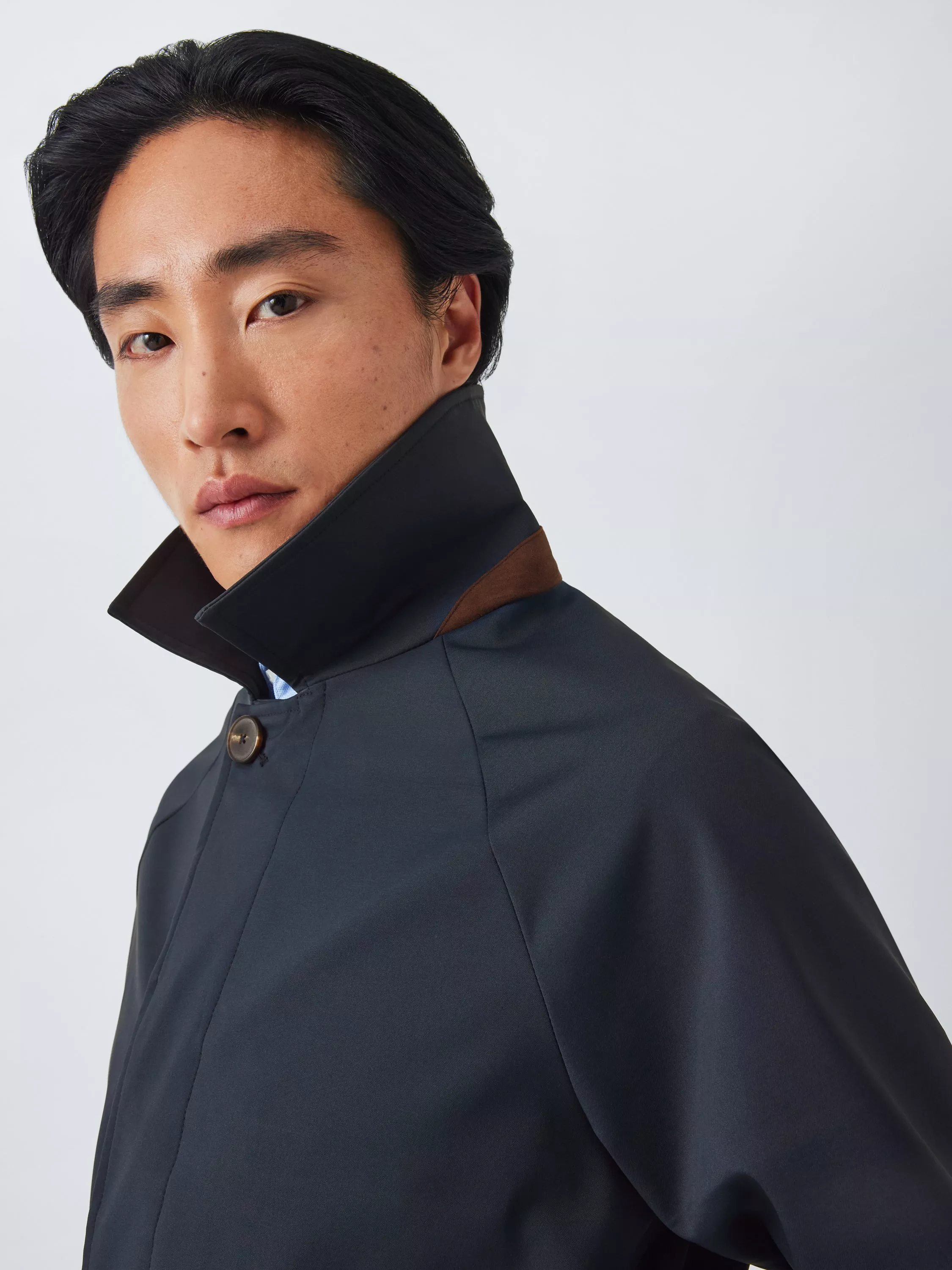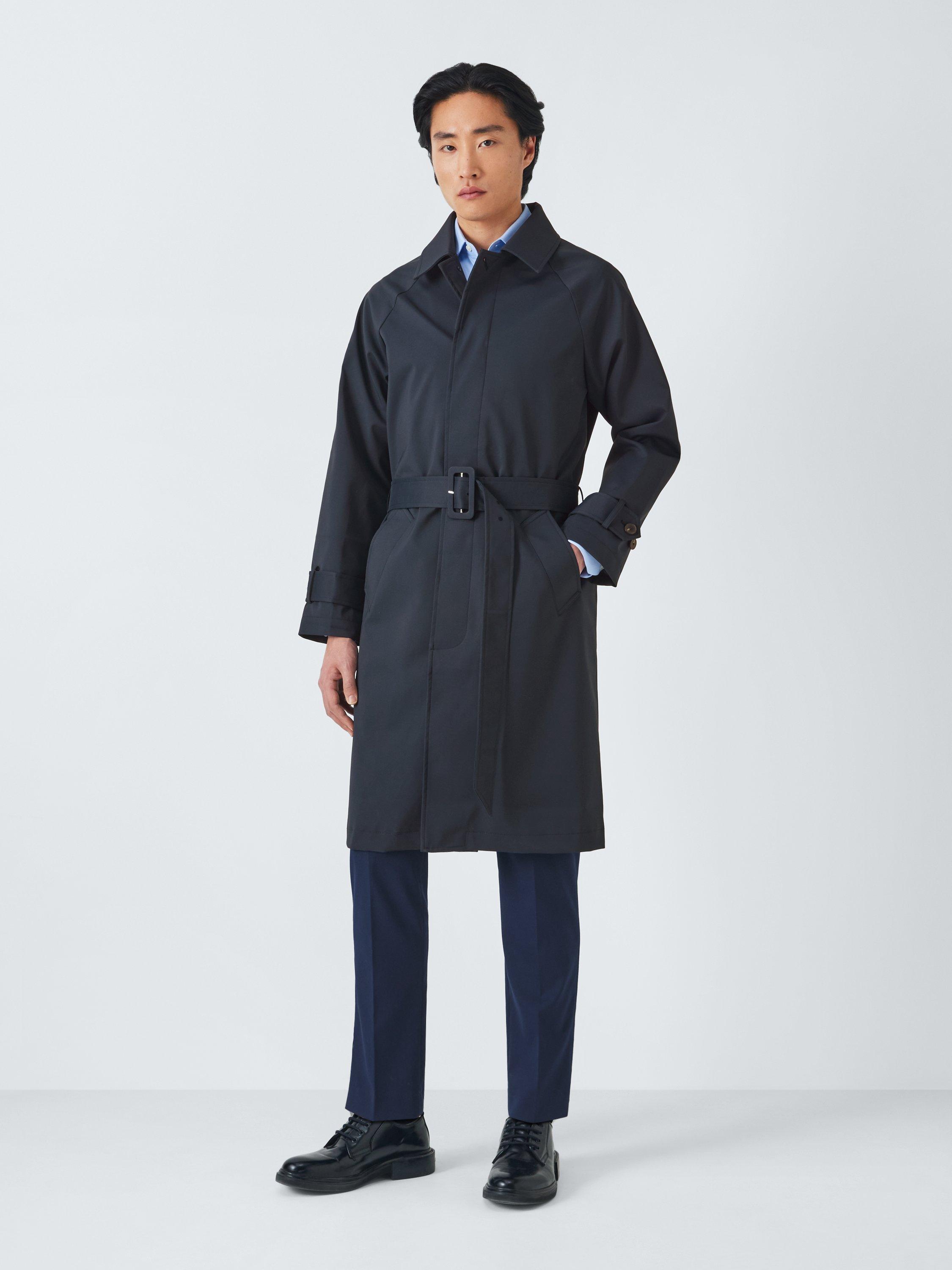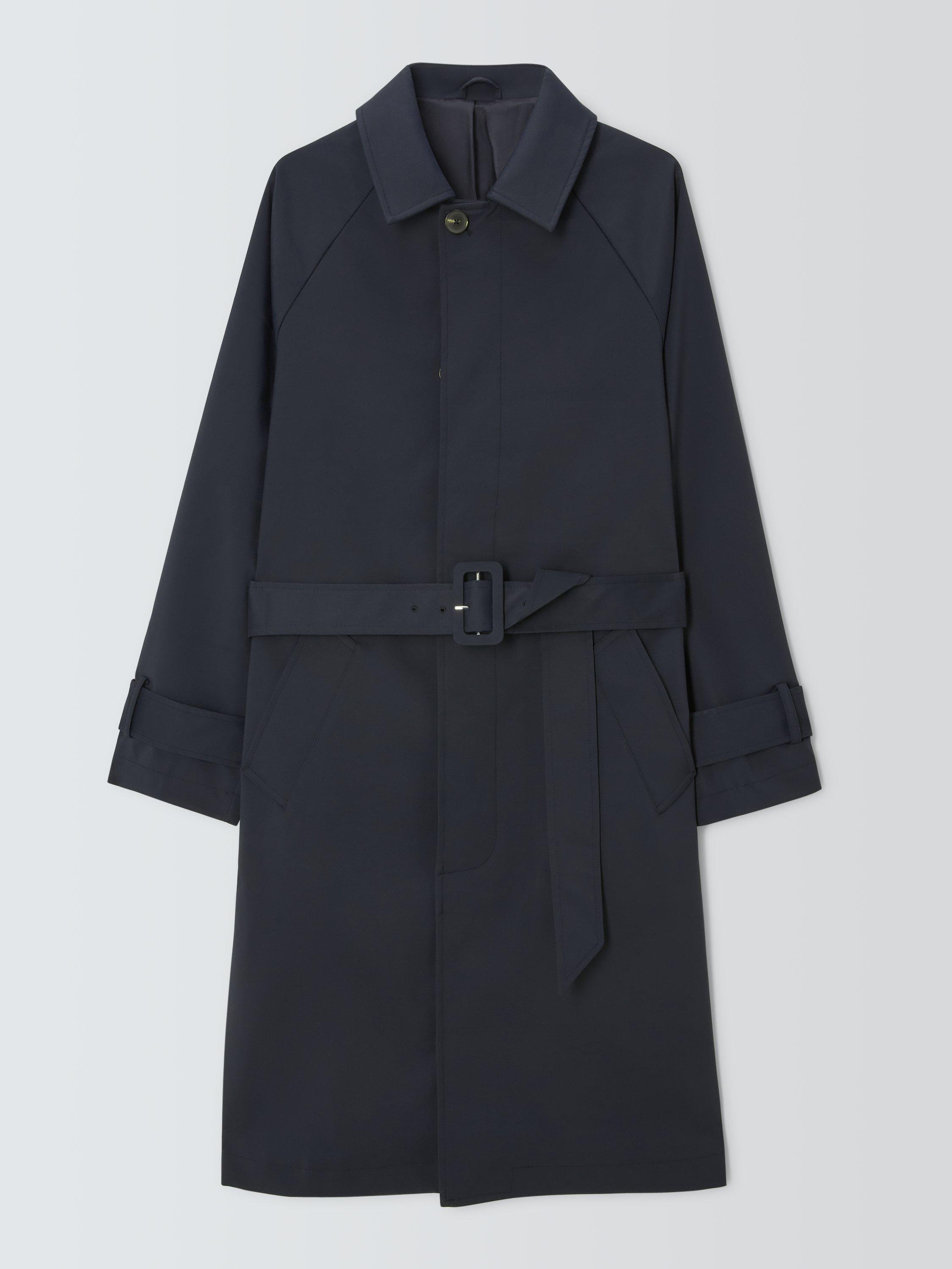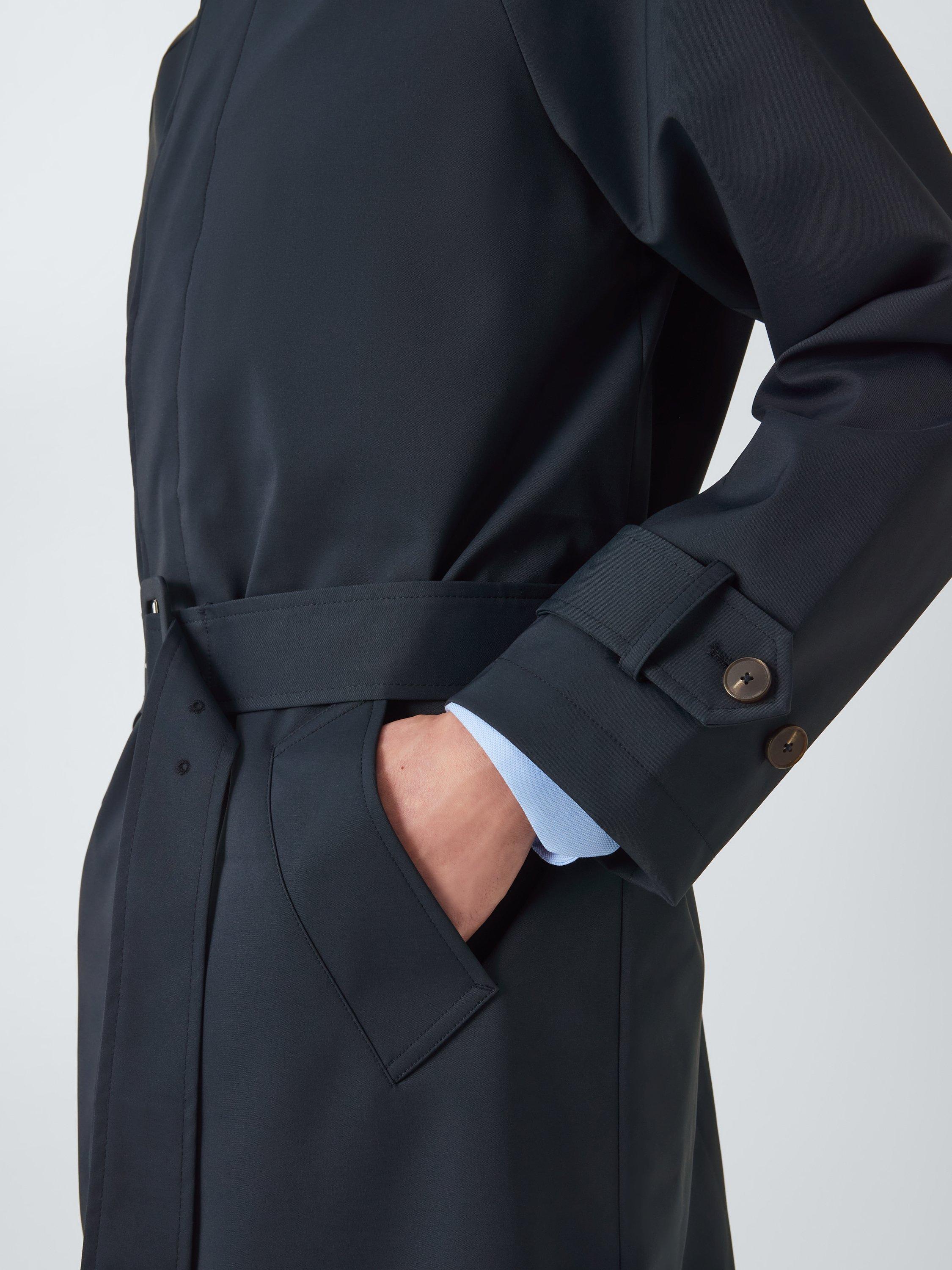 Long shower-resistant mac trench coat styled with a self-tie fabric belt with topstitch detailing, buckle fastening and belt loops. Completed with concealed centre front buttons, welt pockets and cuff adjusters to lock in warmth. Ideal for lighter layering.