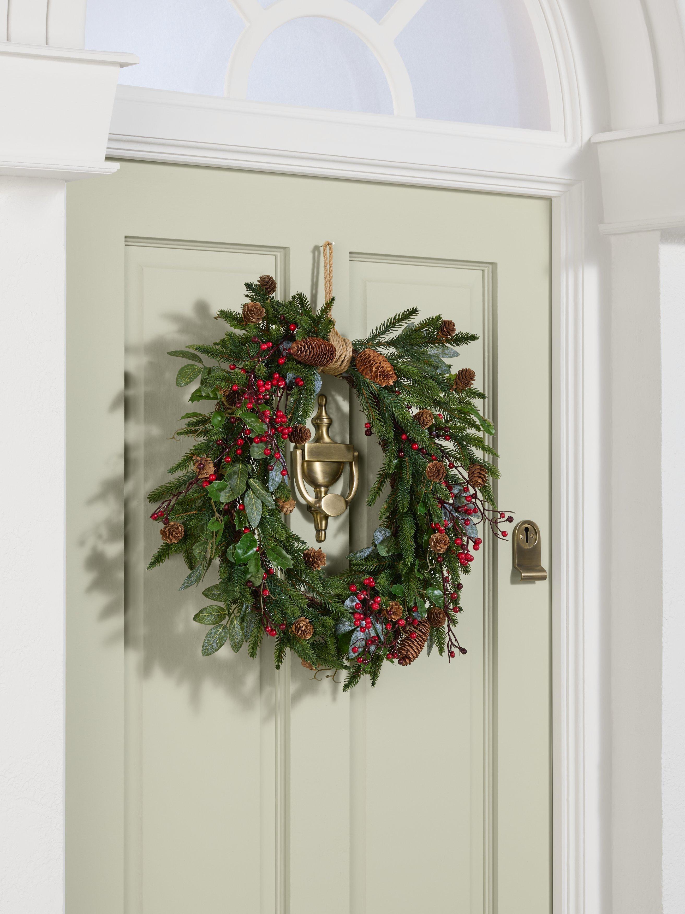 Decorate your door with this festive wreath, which features lightly frosted leaves, faux berries and real pine cones.